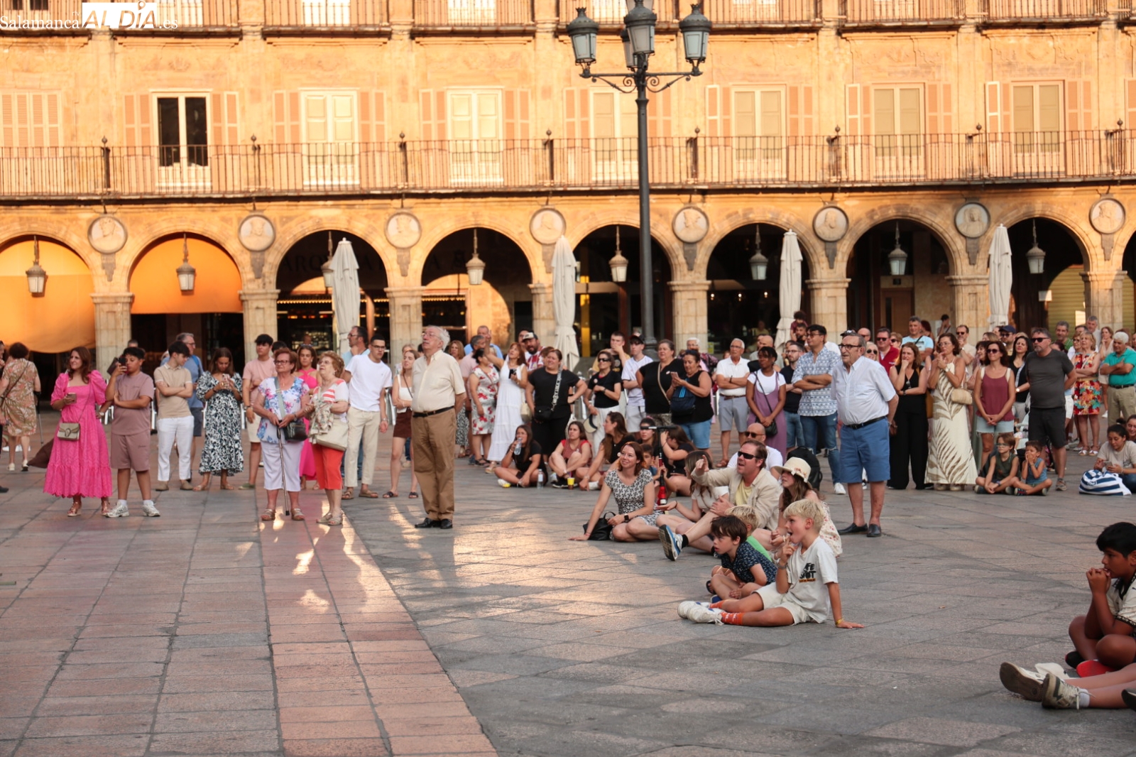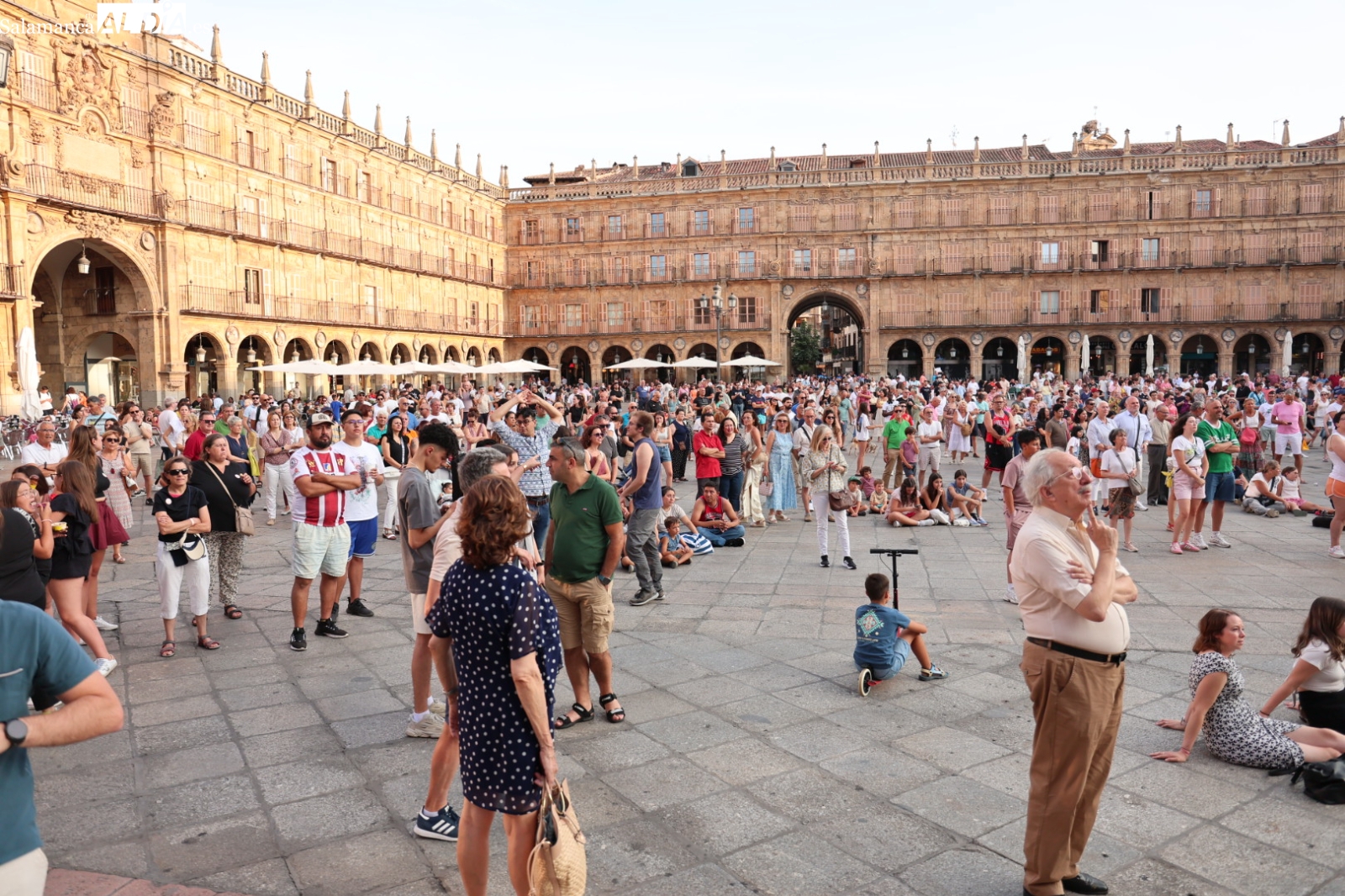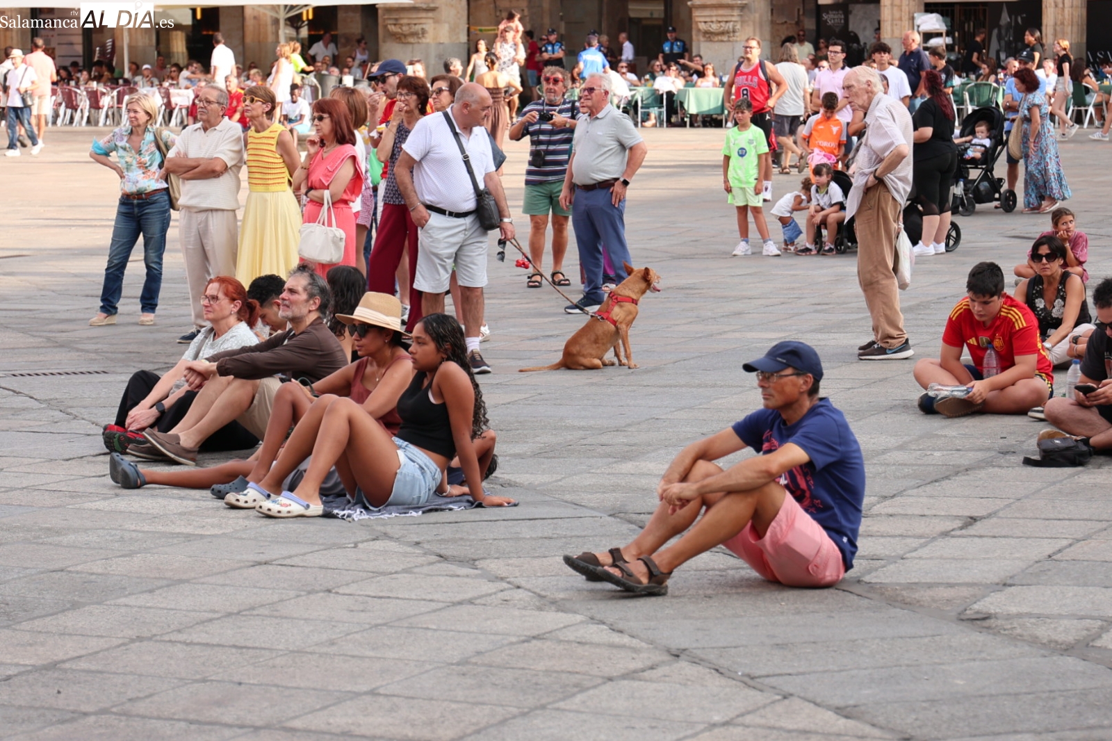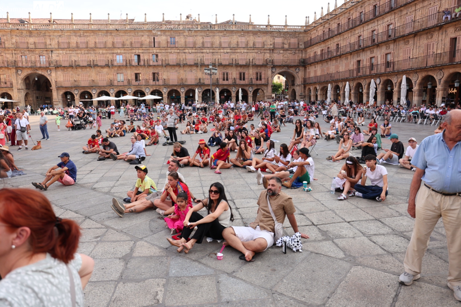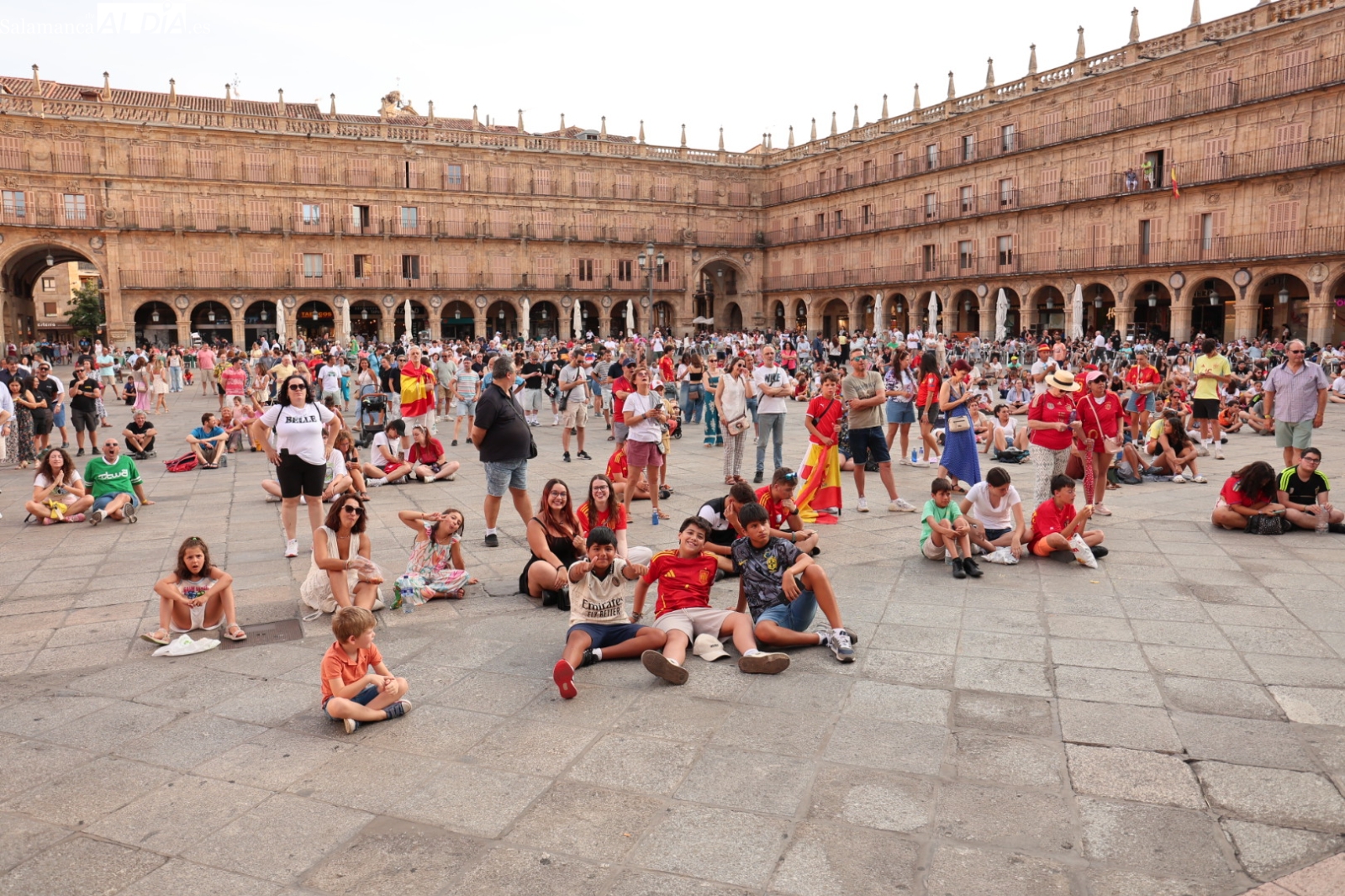 La Plaza Mayor de Salamanca fue punto neurálgico de la concentración de varios aficionados que no dudaron en desafiar al calor y acudir a apoyar de forma conjunta a la Selección Española de Fútbol Femenino en la disputa de la final de la Eurocopa ante Inglaterra, que cayó del lado británico (2-1) en la tanda de penaltis.