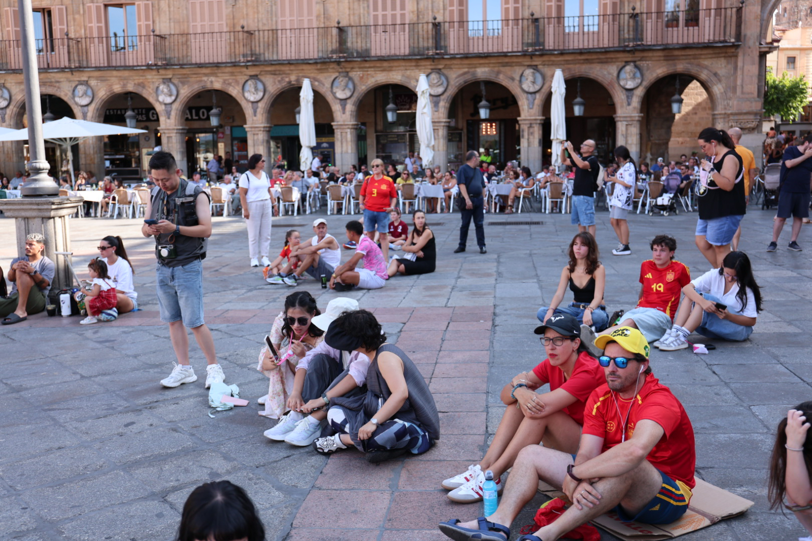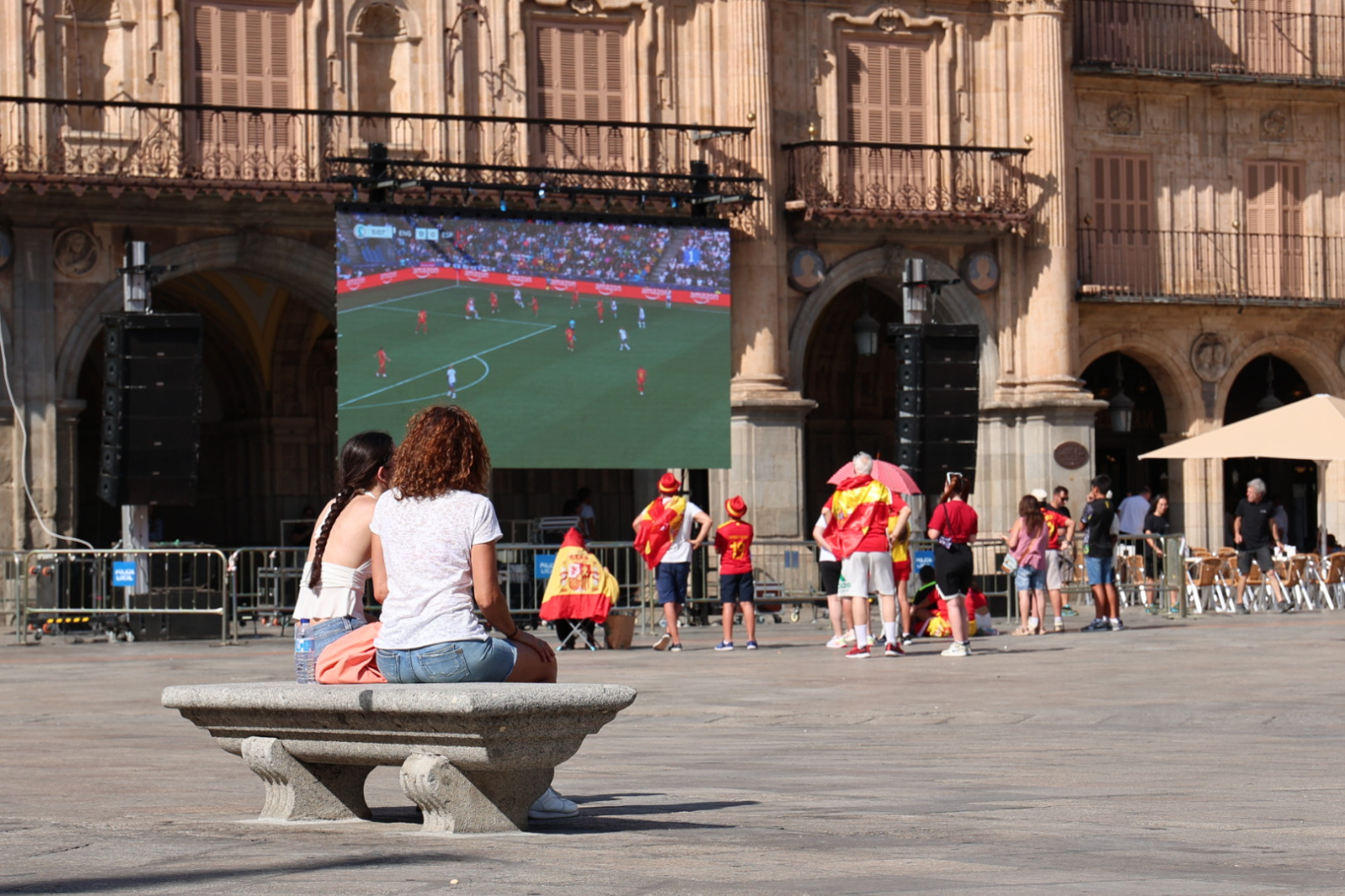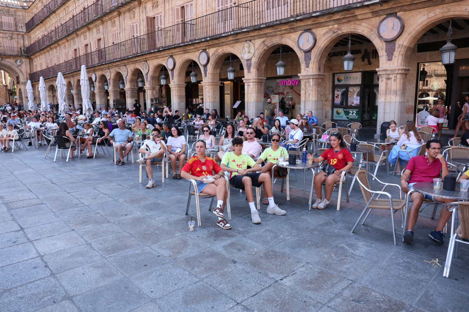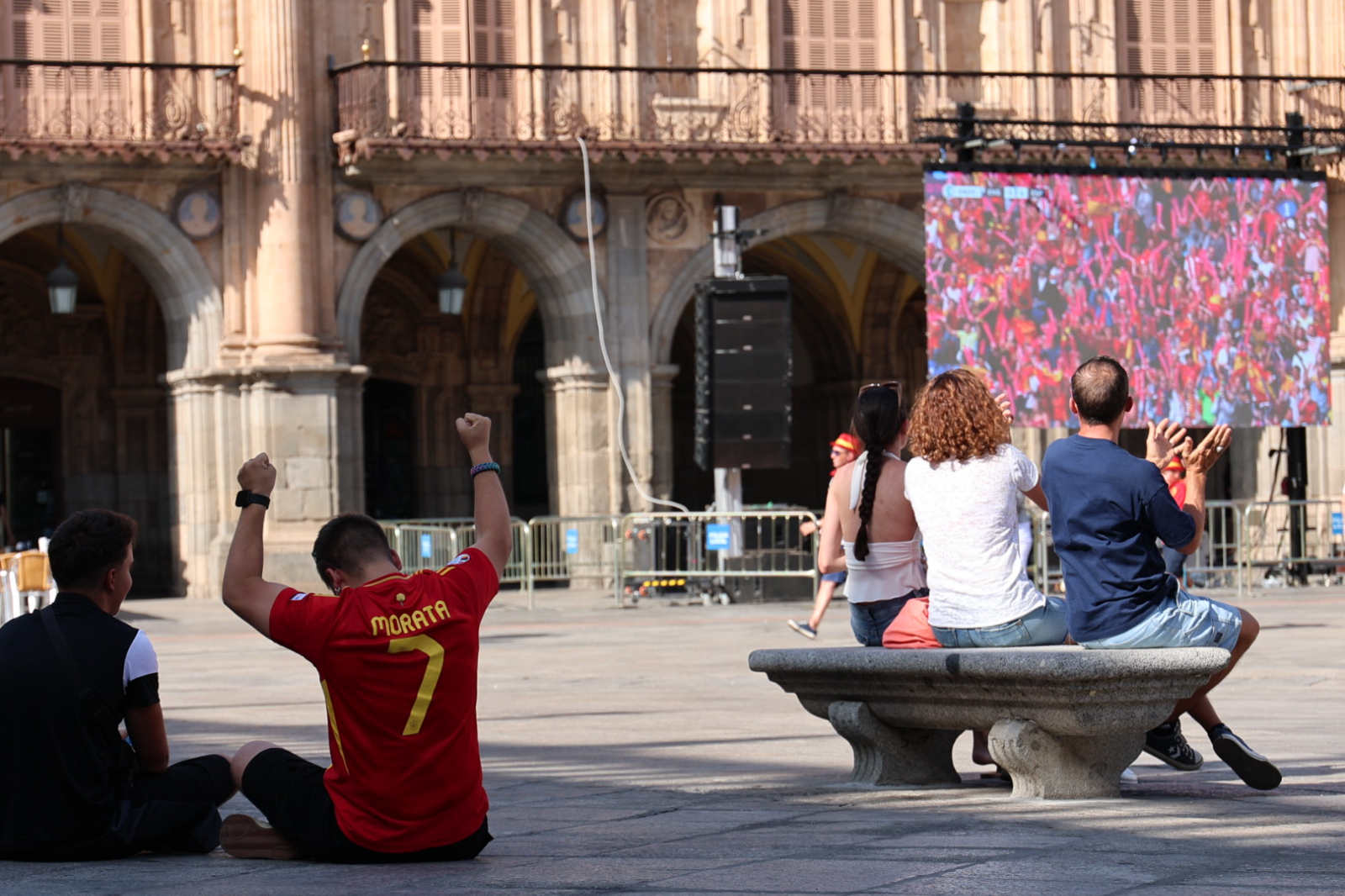 Ataviados con camisetas y bufandas de 'La Roja', los salmantinos y salmantinas buscaron refugio en las sombras existentes en la Plaza Mayor, aunque algunos de ellos desafiaron al sol para estar más cerca de la pantalla gigante que instaló el Ayuntamiento de Salamanca.