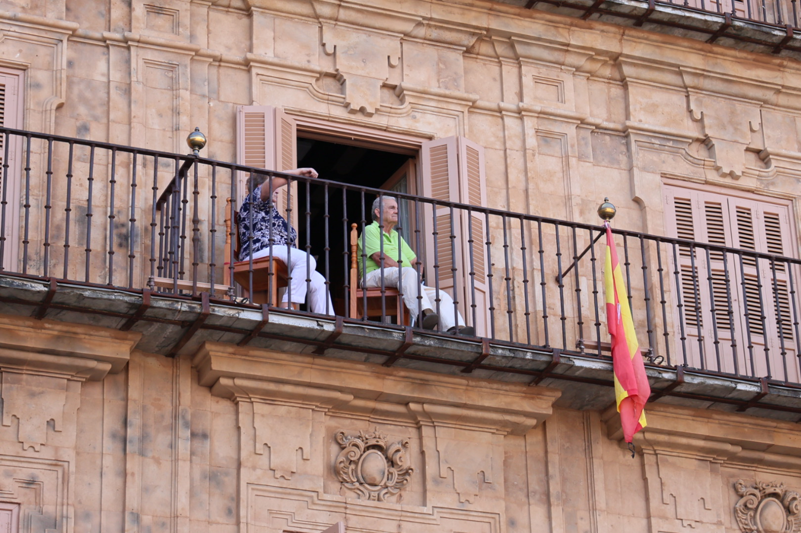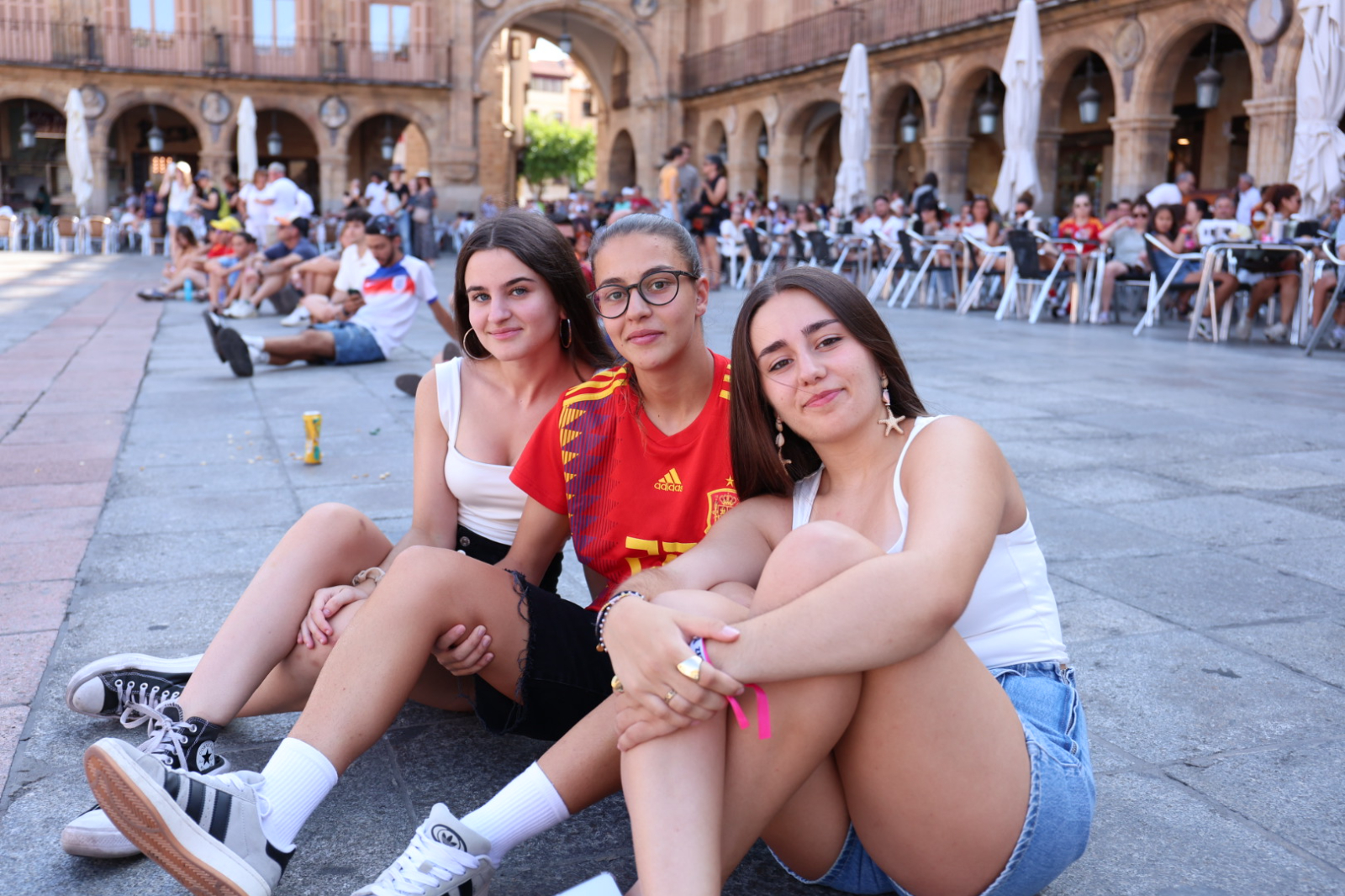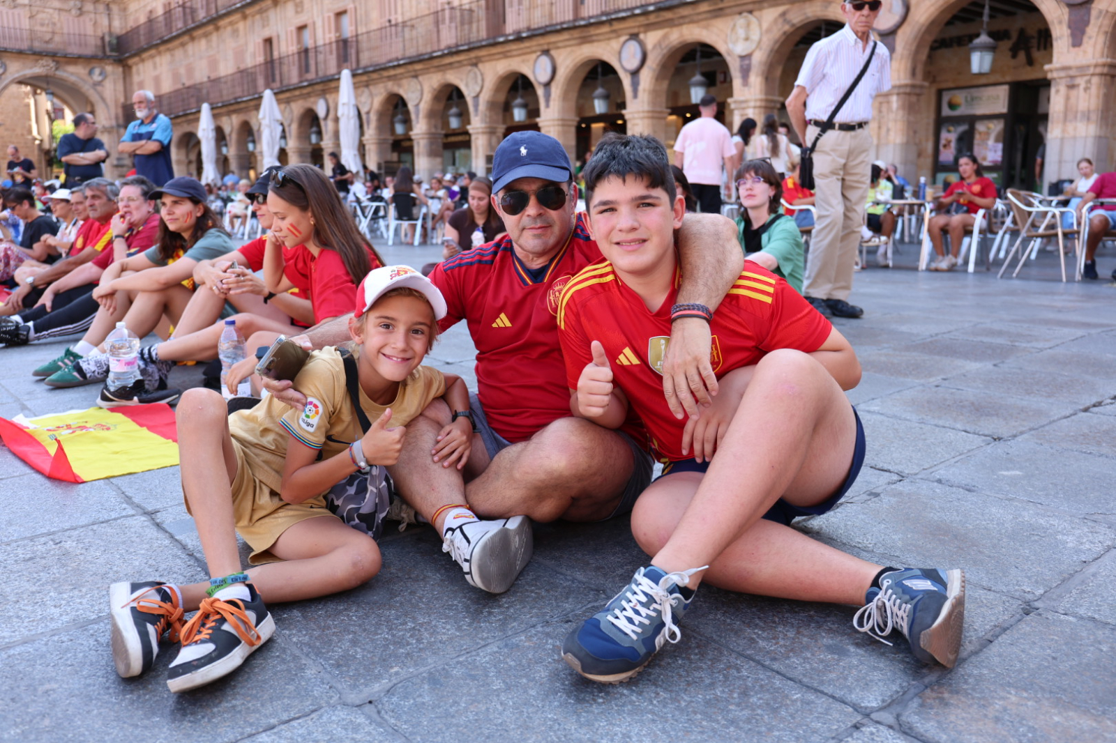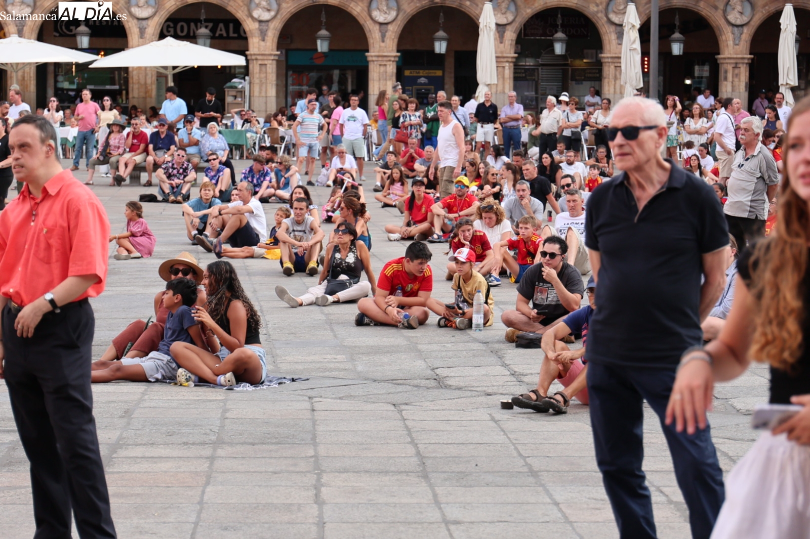 Ataviados con camisetas y bufandas de 'La Roja', los salmantinos y salmantinas buscaron refugio en las sombras existentes en la Plaza Mayor, aunque algunos de ellos desafiaron al sol para estar más cerca de la pantalla gigante que instaló el Ayuntamiento de Salamanca.