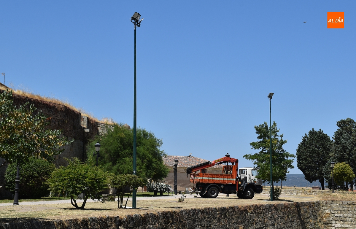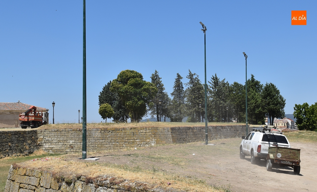 Operarios de la empresa Electricidad Casado estuvieron dotando de iluminación en la mañana del lunes al foso izquierdo de la Rúa del Sol de Ciudad Rodrigo, para posibilitar que se pueda seguir sin problemas desde su borde superior la disputa en la noche del viernes 8 de agosto de la competición de Humor Amarillo que forma parte de la programación veraniega del Consistorio.