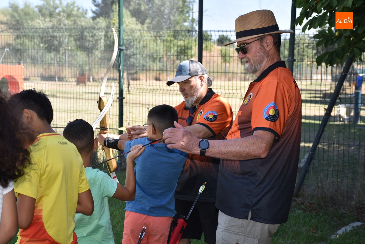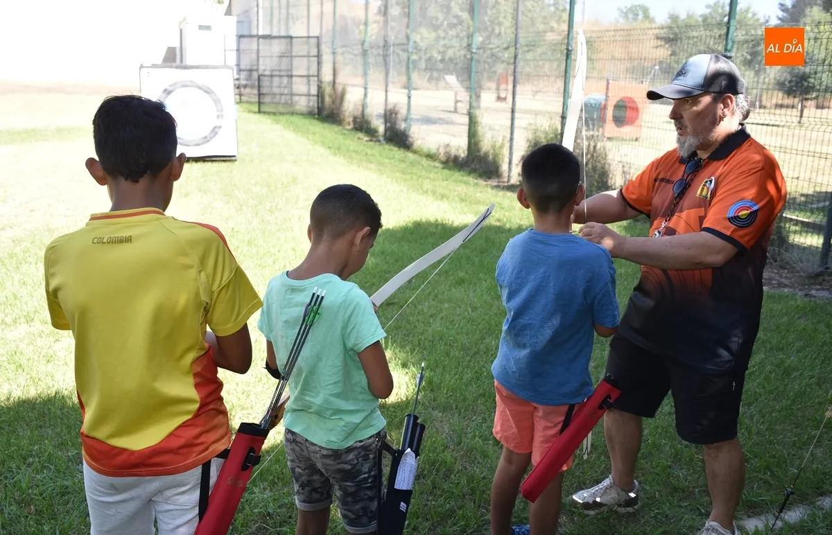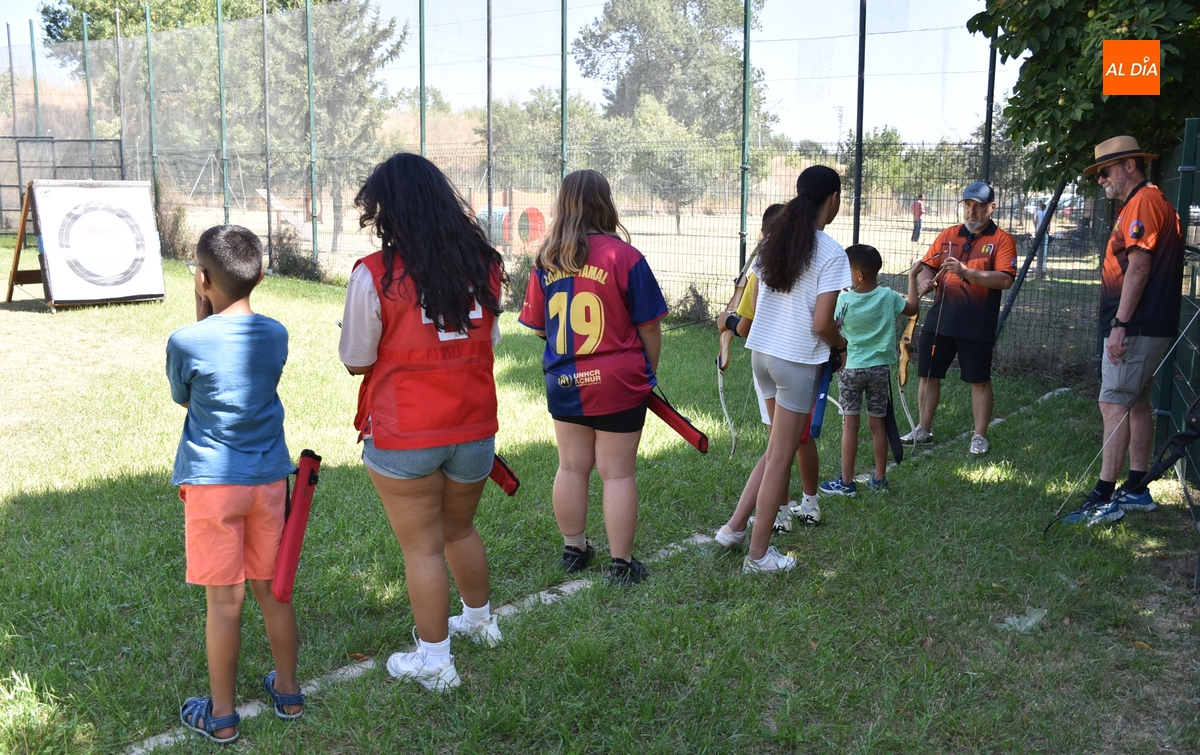 El grupo de niños y adolescentes de entre 7 y 15 años de edad que está participando en el campamento urbano de verano que está llevando a cabo un año más Cruz Roja en Ciudad Rodrigo tuvo la oportunidad en la mañana del lunes de practicar el tiro con arco, en el marco de la Escuela de este deporte con la que cuenta el Club ArcoMiróbriga.