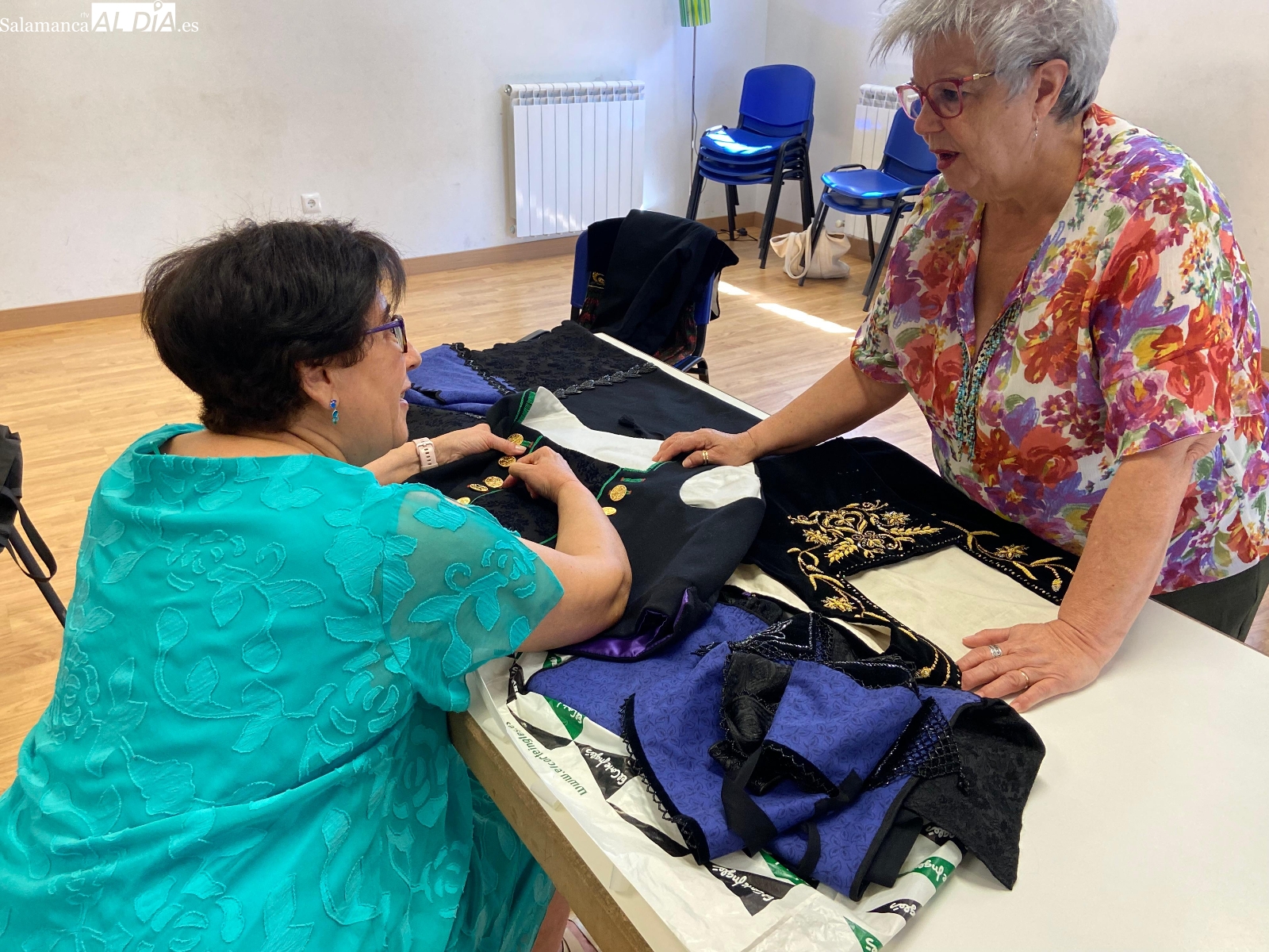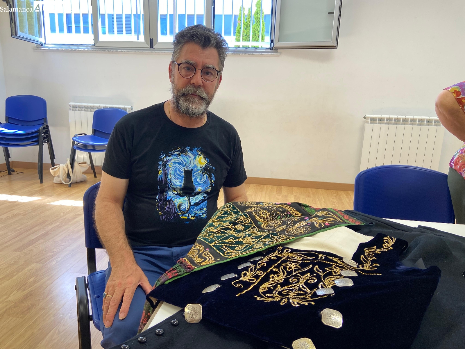 José Antonio Arroyo, artesano de Lumbrales y alumno de la mítica Félix Cañada, dedica su vida a preservar el bordado charro mediante la restauración de piezas antiguas y la impartición de talleres con gran demanda. Nos recibe en uno de esos talleres junto a varias de sus alumnas que bordan sus propias piezas