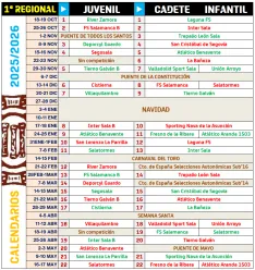 Así, como se puede ver en los calendarios, los juveniles tendrán un inicio un poco más enrevesado, no llegando a jugar más de dos semanas seguidas hasta principios de 2026. Por el contrario, cadetes e infantiles iniciarán la liga con su bloque más potente, compuesto por 7 semanas seguidas de competición, mientras que en 2026 no llegarán a jugar más de 4 semanas consecutivas.