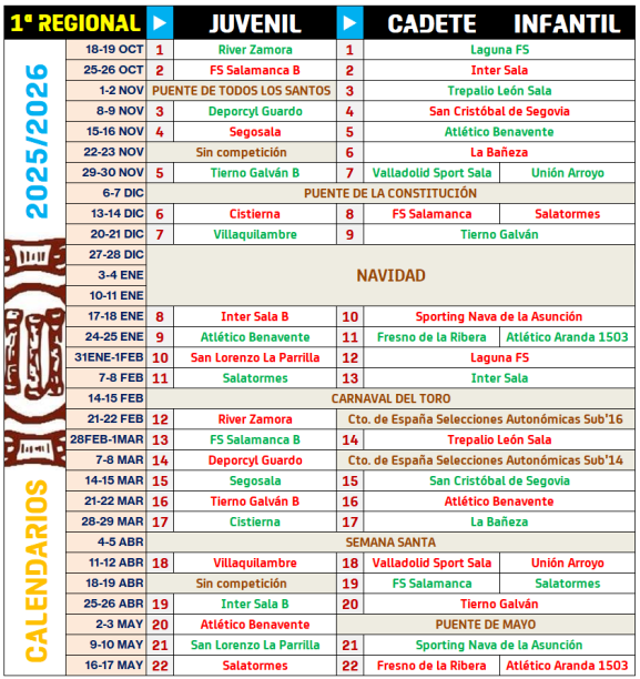 Los juveniles, cadetes e infantiles del III Columnas compartirán un total de 19 fines de semana de juego, en 15 de los cuales jugarán al mismo tiempo en casa o fuera. Como es tradición, cadetes e infantiles tendrán el mismo rival hasta en 8 jornadas por vuelta (para ahorrar viajes a los clubes), no ocurriendo lo mismo con los juveniles, pese a que también hay algunos rivales comunes (como Atlético Benavente o Inter Sala).