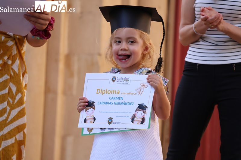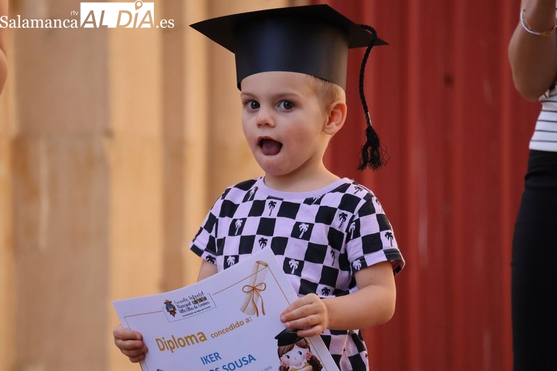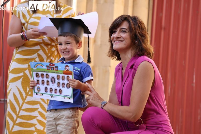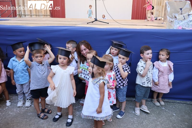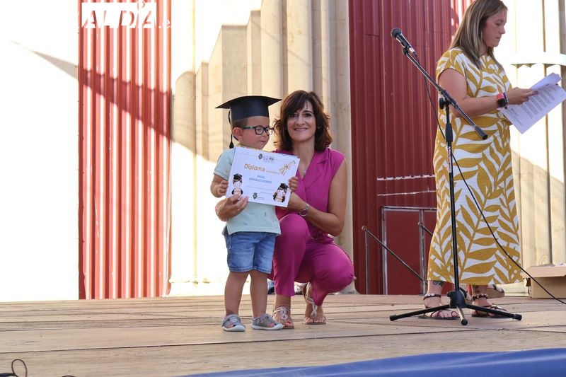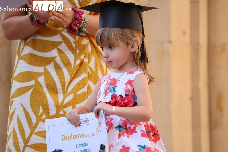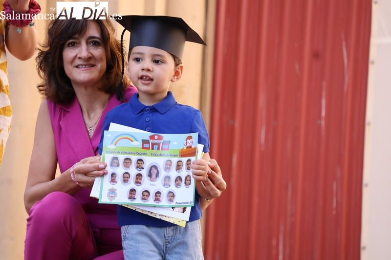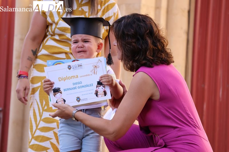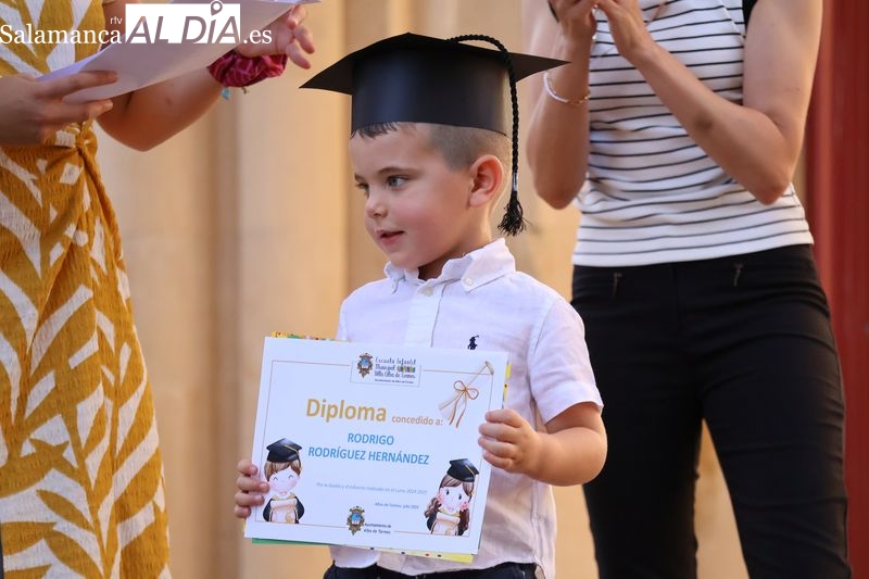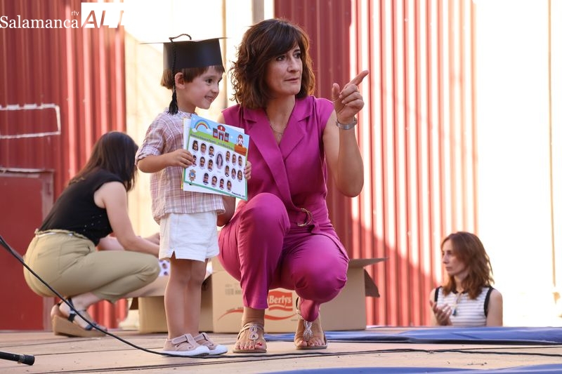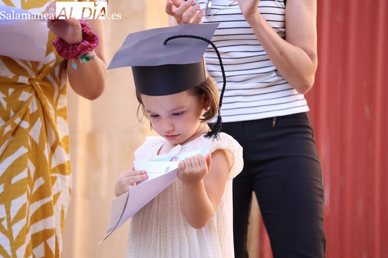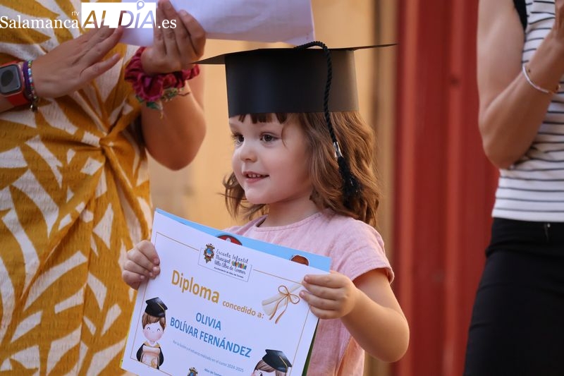 La Basílica de Alba de Tormes ha acogido en la tarde del miércoles 30 de julio el acto de graduación de los niños y niñas nacidos en 2022 que finalizan su etapa en la Escuela Infantil Municipal. Un total de 29 pequeños subieron uno a uno al escenario para recibir su diploma de manos de la concejala de Bienestar Social, Lourdes Vaquero, quien fue nombrando a cada uno de ellos mientras les dedicaba dos adjetivos personalizados propuestos por sus profesoras, Julia Pacheco Delgado y Gloria Sánchez Triguero.