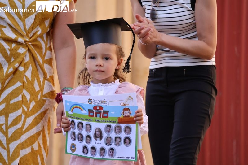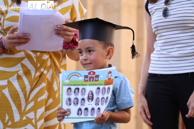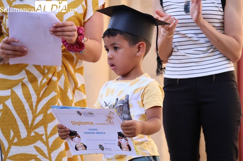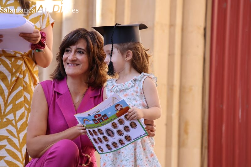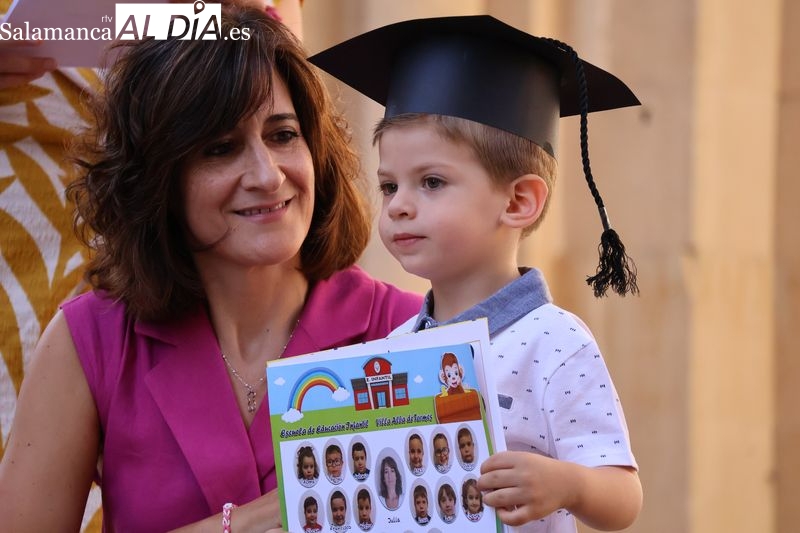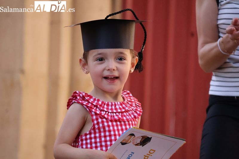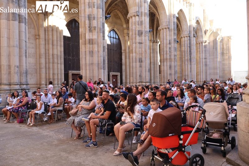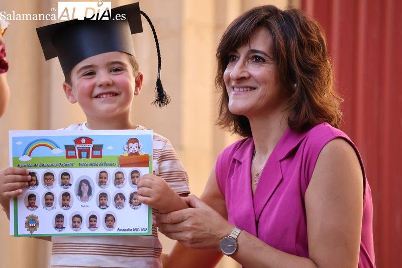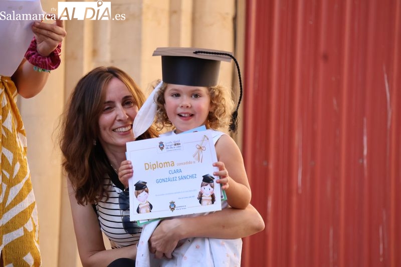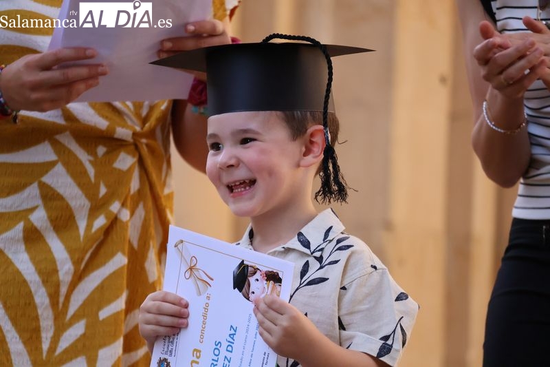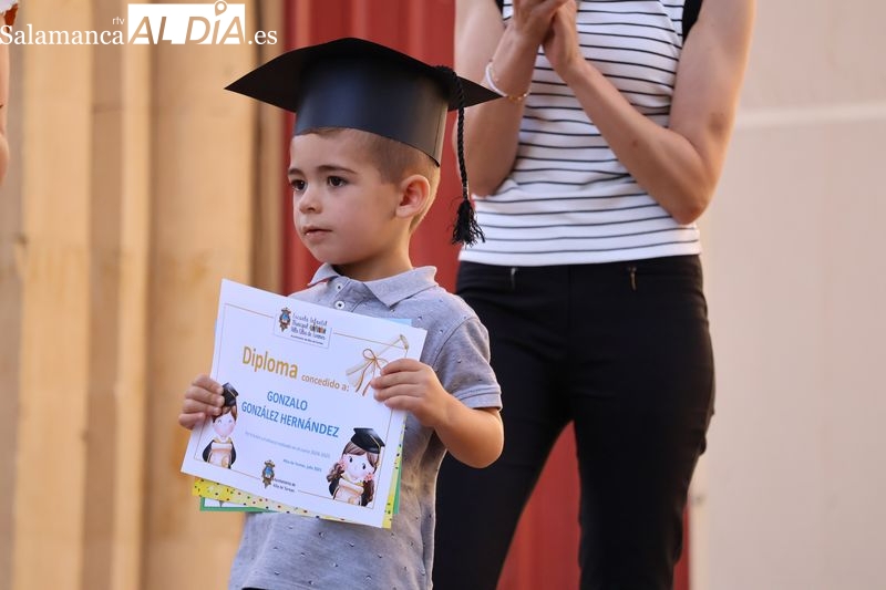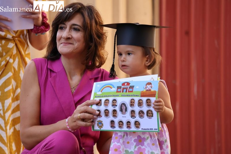 La Basílica de Alba de Tormes ha acogido en la tarde del miércoles 30 de julio el acto de graduación de los niños y niñas nacidos en 2022 que finalizan su etapa en la Escuela Infantil Municipal. Un total de 29 pequeños subieron uno a uno al escenario para recibir su diploma de manos de la concejala de Bienestar Social, Lourdes Vaquero, quien fue nombrando a cada uno de ellos mientras les dedicaba dos adjetivos personalizados propuestos por sus profesoras, Julia Pacheco Delgado y Gloria Sánchez Triguero.