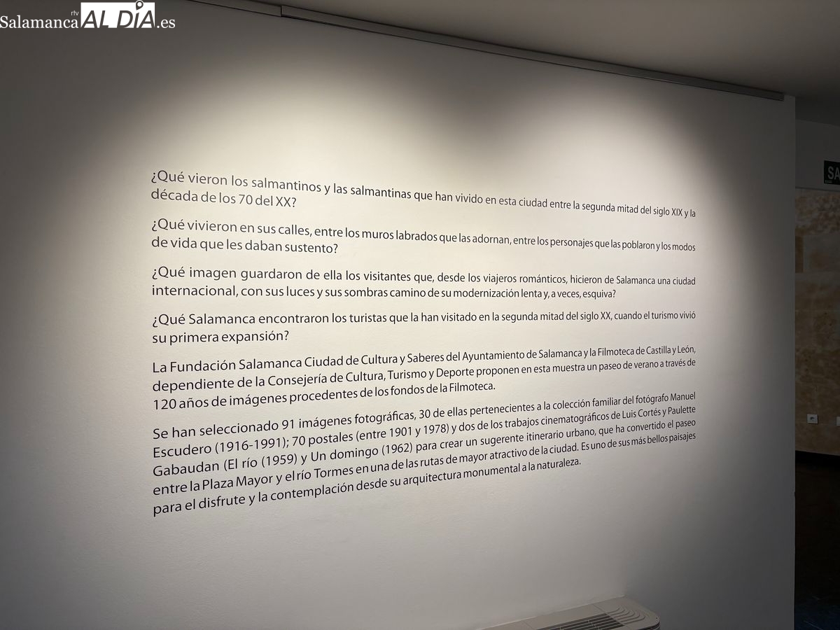 Además, la muestra se enriquece con 70 postales, fechadas entre 1901 y 1975, procedentes de la colección de Conrad y Margarita Kent y de los fondos propios de la Filmoteca. La parte audiovisual está representada por dos películas de Luis Cortés y Paulette Gabaudan: El río (1959), un cinepoema sobre el Tormes y su vida a las orillas, y Un domingo (1962), que retrata las costumbres dominicales de los salmantinos.