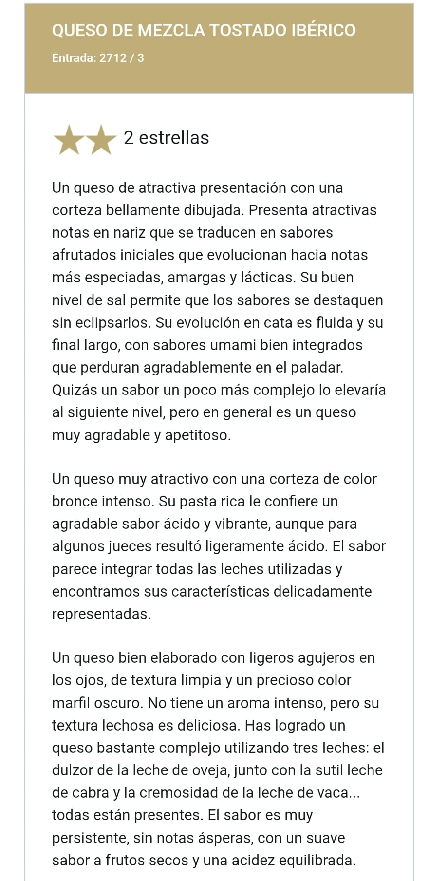 Aunque algunos jueces apuntaron que una mayor complejidad podría elevarlo a la máxima categoría de tres estrellas, la valoración general lo define como "un queso muy agradable y apetitoso" y "bien elaborado".