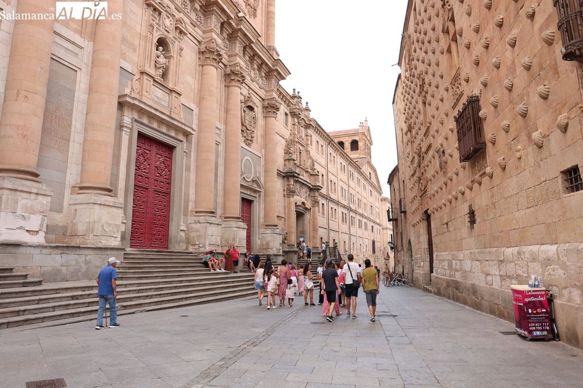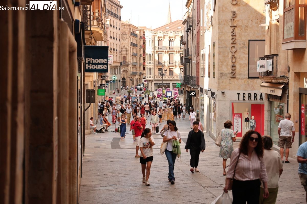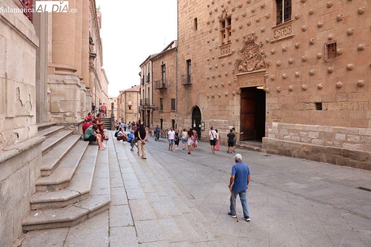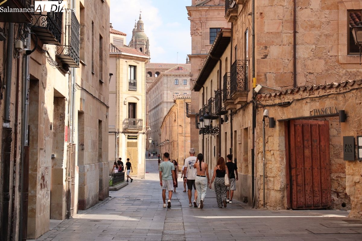 La Plaza Mayor, como es habitual, se erige como el gran punto de encuentro y distribución de los flujos de gente. Arterias como la Rúa Mayor, la calle Compañía o la Plaza del Corrillo. Se observan grupos de turistas, mapa en mano o siguiendo a un guía, dirigiéndose hacia el imponente conjunto catedralicio y el entorno universitario, mientras que otros optan por explorar las zonas comerciales.