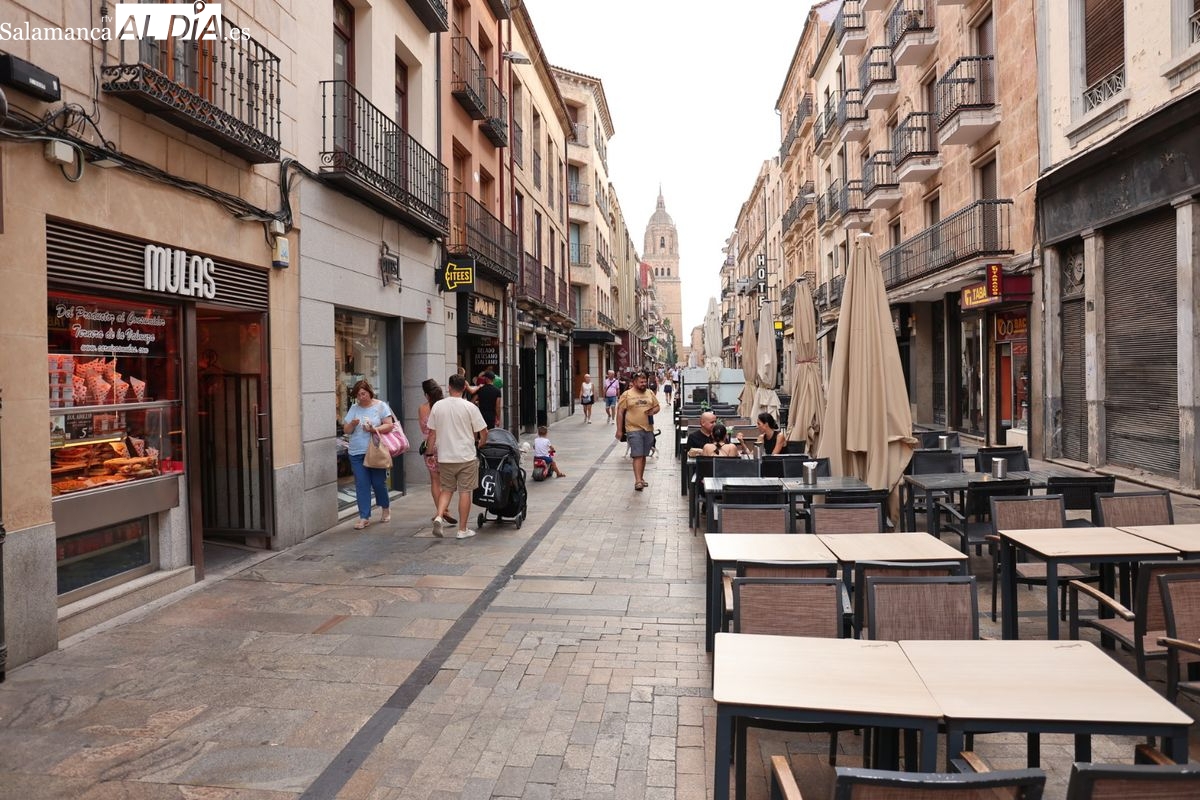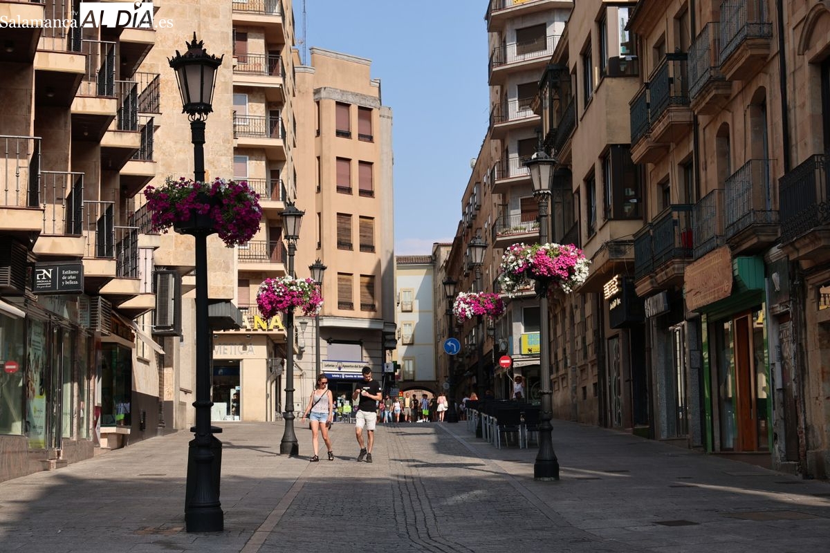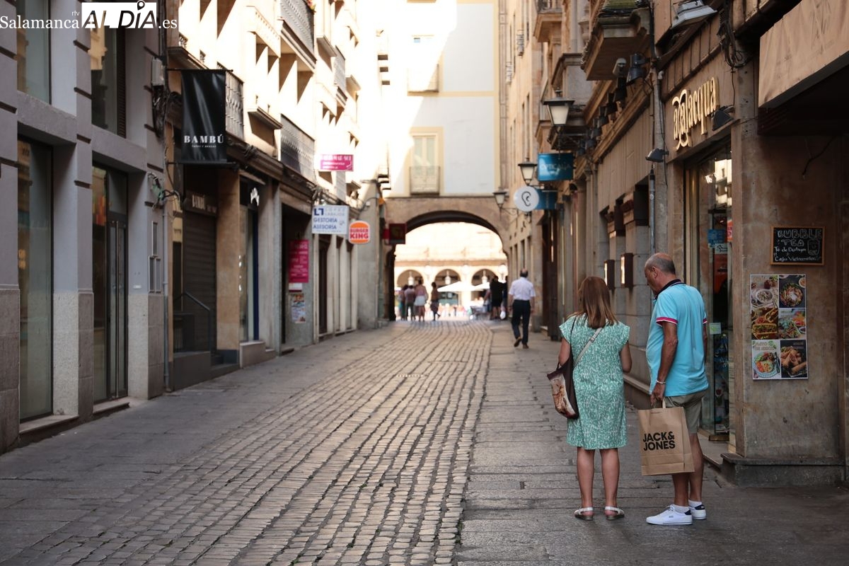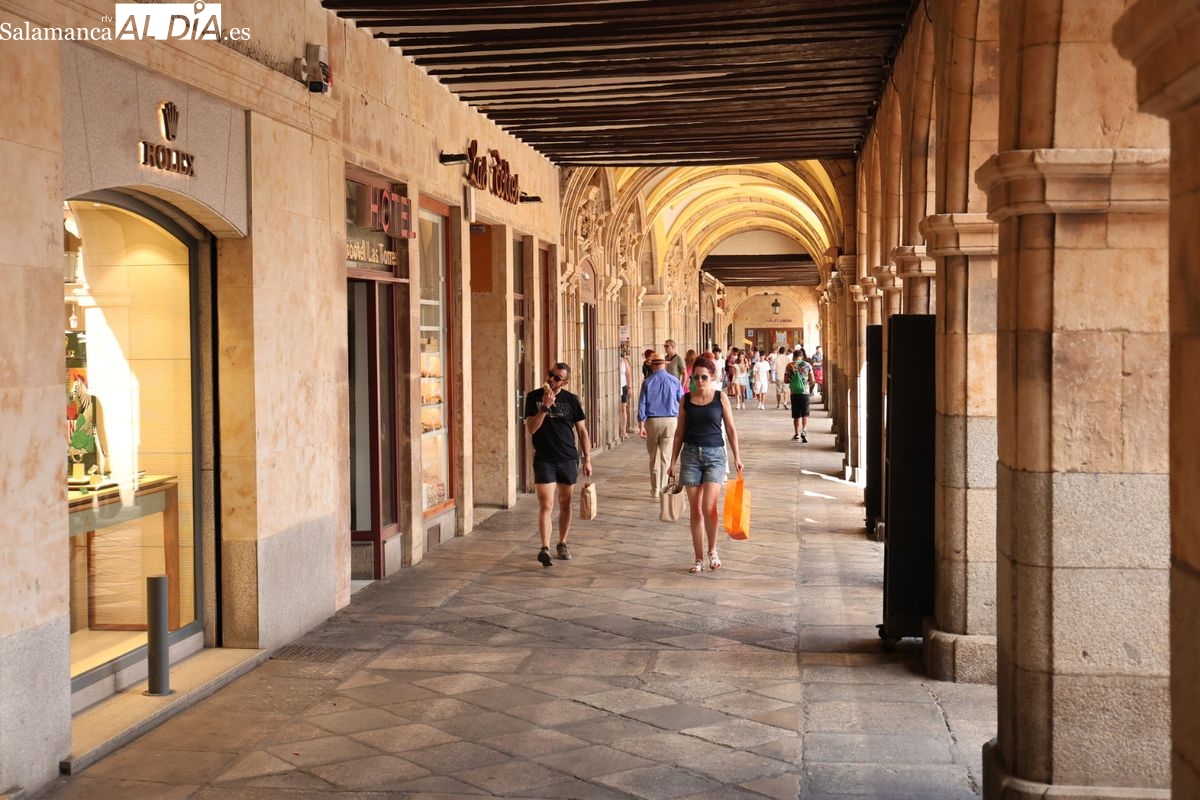 La Plaza Mayor, como es habitual, se erige como el gran punto de encuentro y distribución de los flujos de gente. Arterias como la Rúa Mayor, la calle Compañía o la Plaza del Corrillo. Se observan grupos de turistas, mapa en mano o siguiendo a un guía, dirigiéndose hacia el imponente conjunto catedralicio y el entorno universitario, mientras que otros optan por explorar las zonas comerciales.