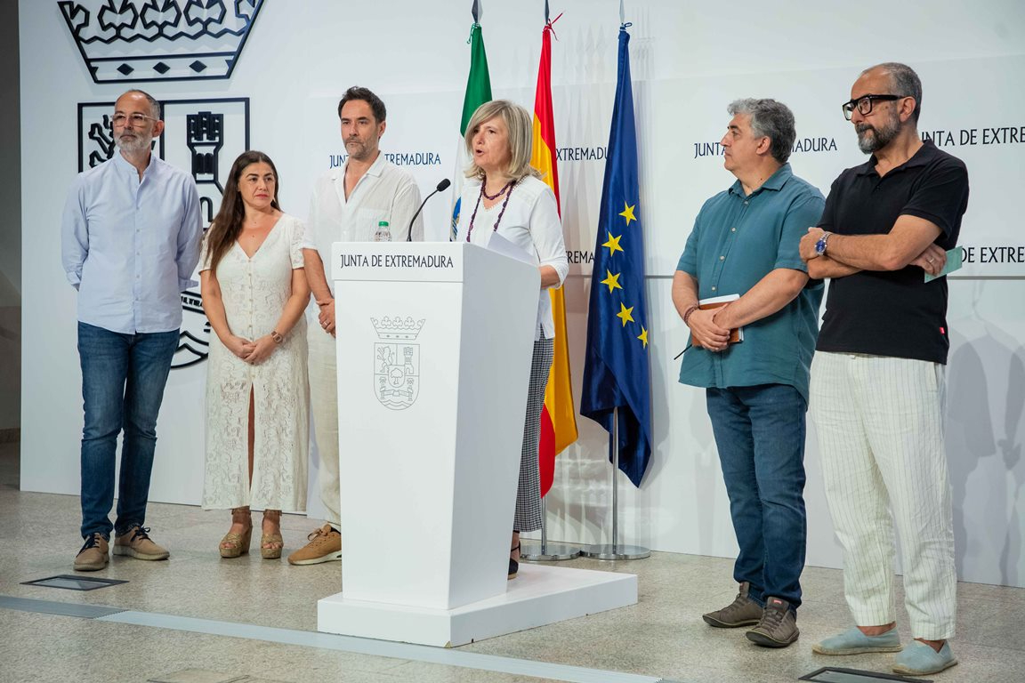 En el acto de la mañana del miércoles en Mérida participaron Victoria Bazaga, consejera de Cultura, Turismo, Jóvenes y Deportes de la Junta de Extremadura; Francisco Palomino, secretario general de Cultura; Francisco Blanco, de Teatro del Agua; Simón Jesús Ferrero de la Cruz e Isabel Martín Sánchez, de El Avispero Producciones; y Manuel González, director de la Feria de Teatro (también acudió el productor, Javier de Prado).