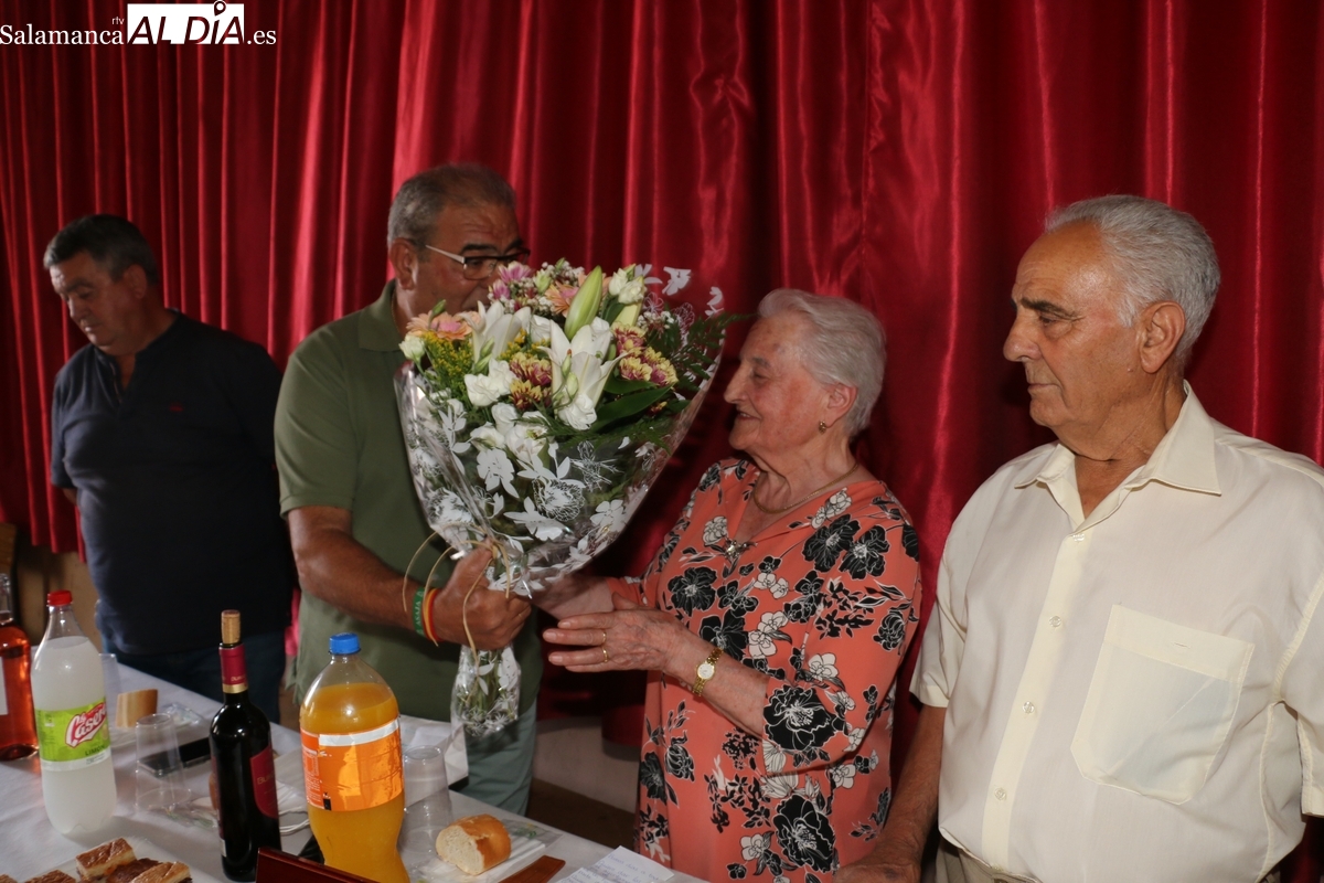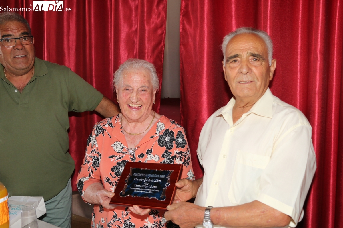 Con estas palabras, se ha procedido a la entrega de los reconocimientos. Leandro García del Álamo ha recibido una placa conmemorativa con su nombre y el de Teresa y sus fechas de nacimiento, un testimonio de cariño de su pueblo. A su lado, su esposa, Teresa Arroyo Marcos, ha recibido un vistoso ramo de flores como símbolo de afecto y gratitud. La emoción era palpable en sus rostros y en los de sus hijos, nietos y amigos que los arropaban en un día tan significativo.