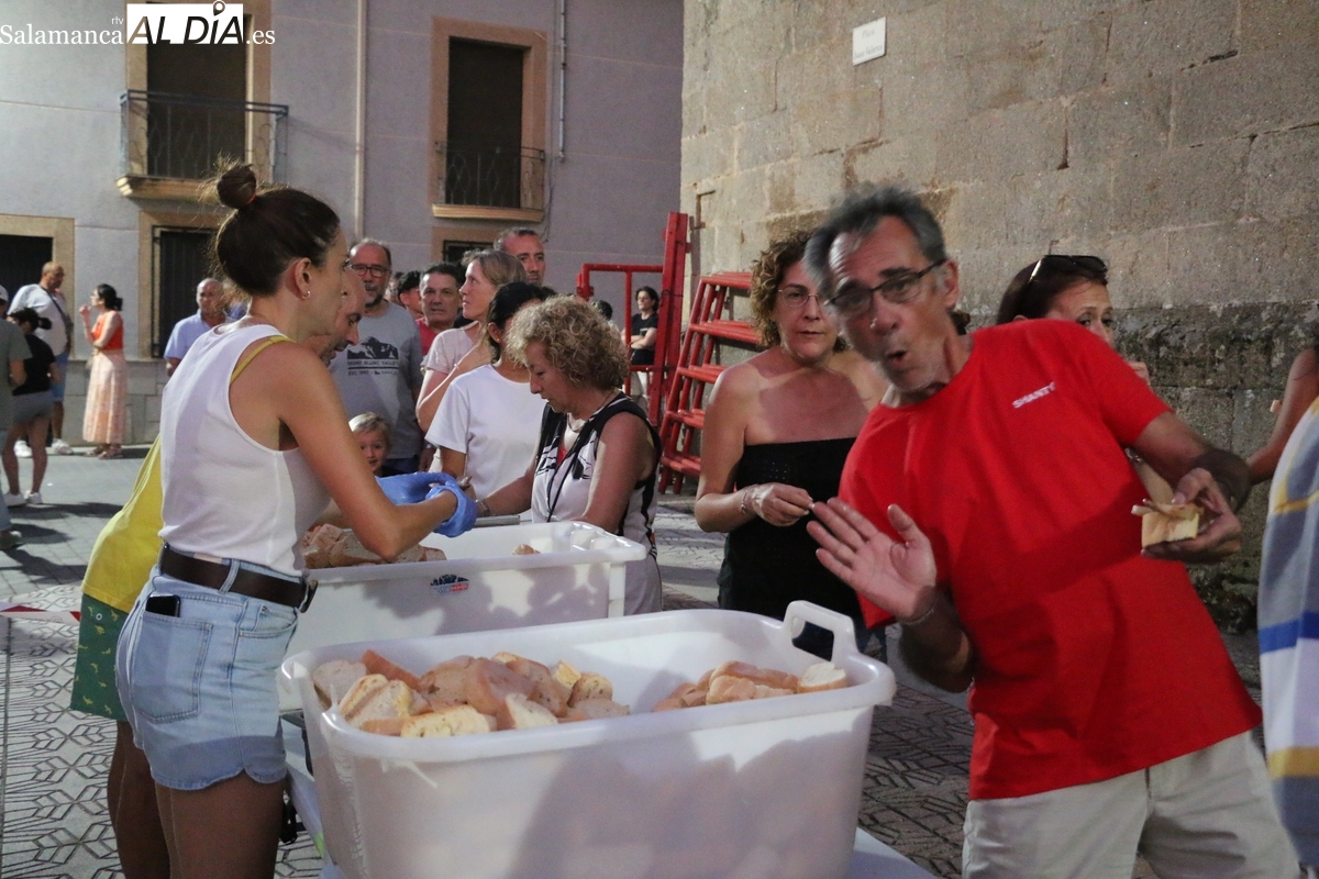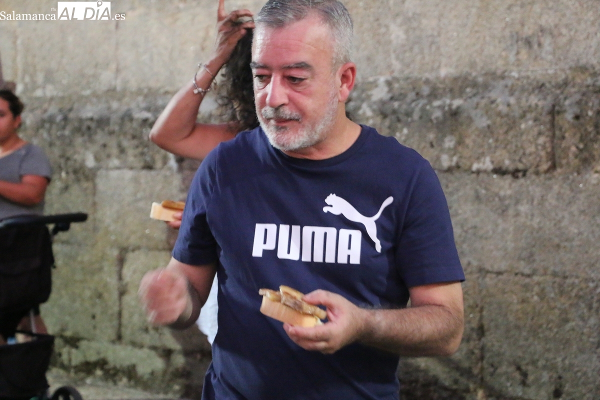 El Ayuntamiento repartió un total de 90 kilos de panceta, cocinada a la plancha en el momento, cuyo aroma atrajo a una multitud de vecinos y peñistas. Para acompañar este manjar y combatir el calor, no faltó la sangría, sirviendo como el complemento perfecto para los montaditos que harían de cena y reponer así fuerzas de cara al intenso fin de semana festivo que se avecina.