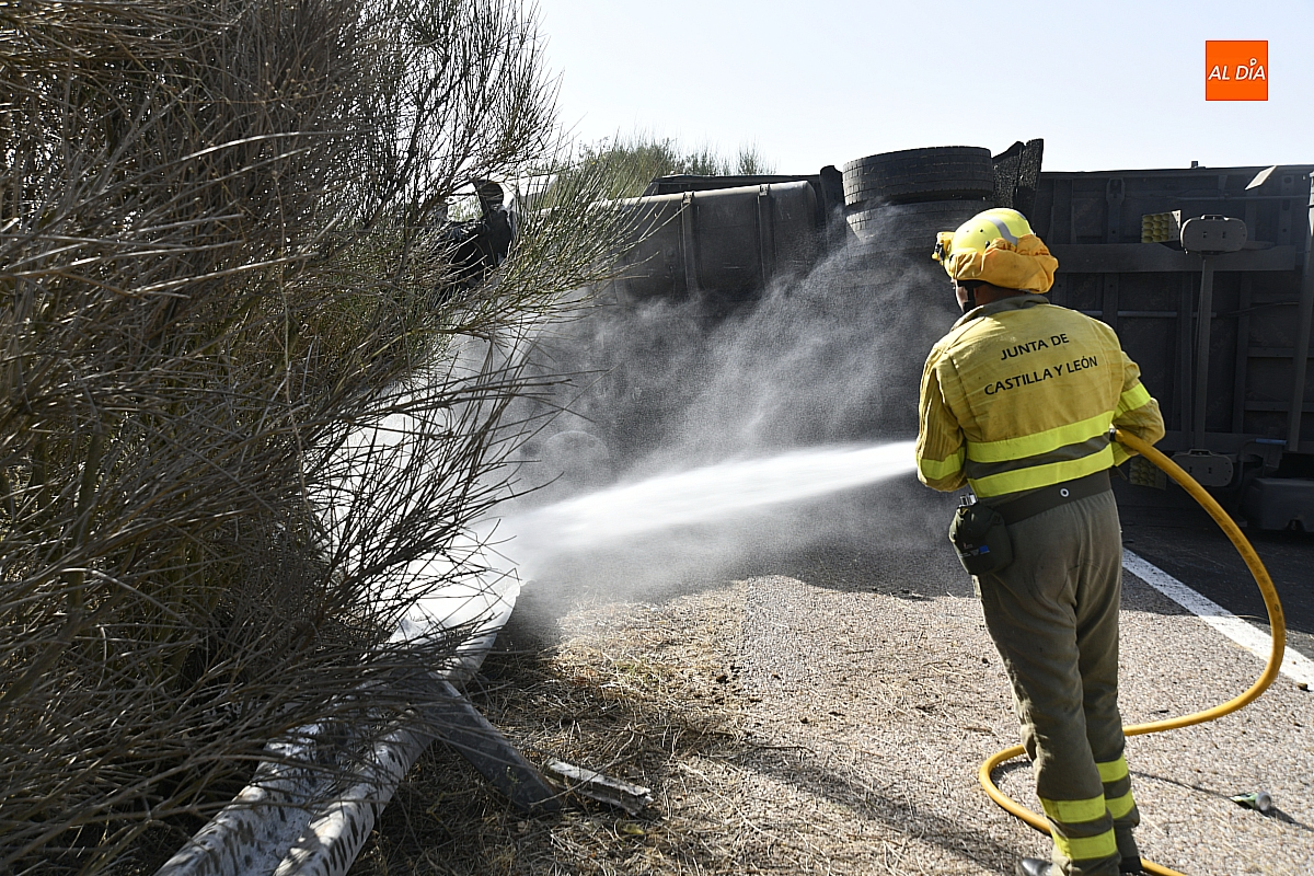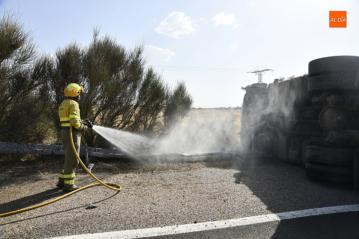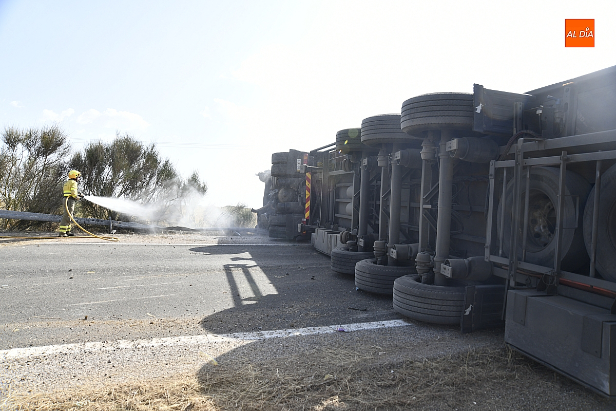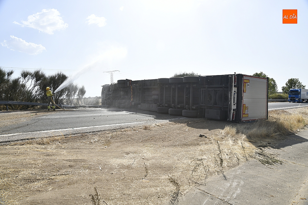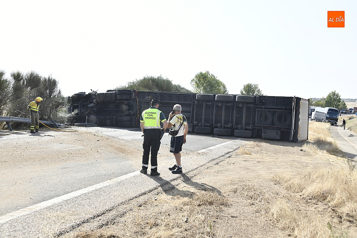 El conductor perdió el control del vehículo, que se fue contra la mediana, atravesándola e invadiendo el otro sentido de la circulación (dirección Salamanca), donde volcó. De forma casi milagrosa, pese al volumen de tráfico que registra estos días la A-62, en ese momento no pasaba ningún otro vehículo por ese otro sentido, dándole además tiempo a frenar a los siguientes que llegaron a ese punto. De este modo, el accidente se saldó sin daños personales, ya que el conductor del camión resultó ileso.