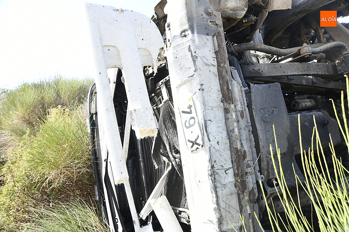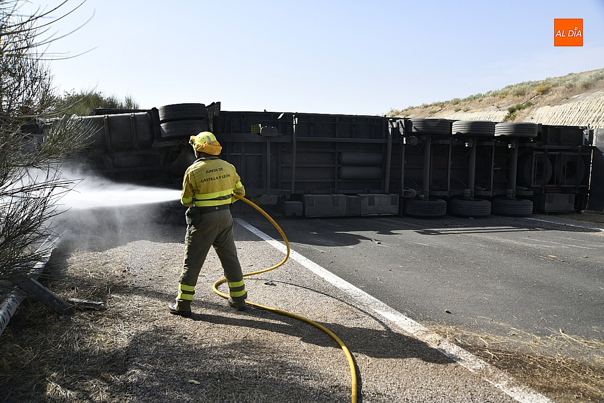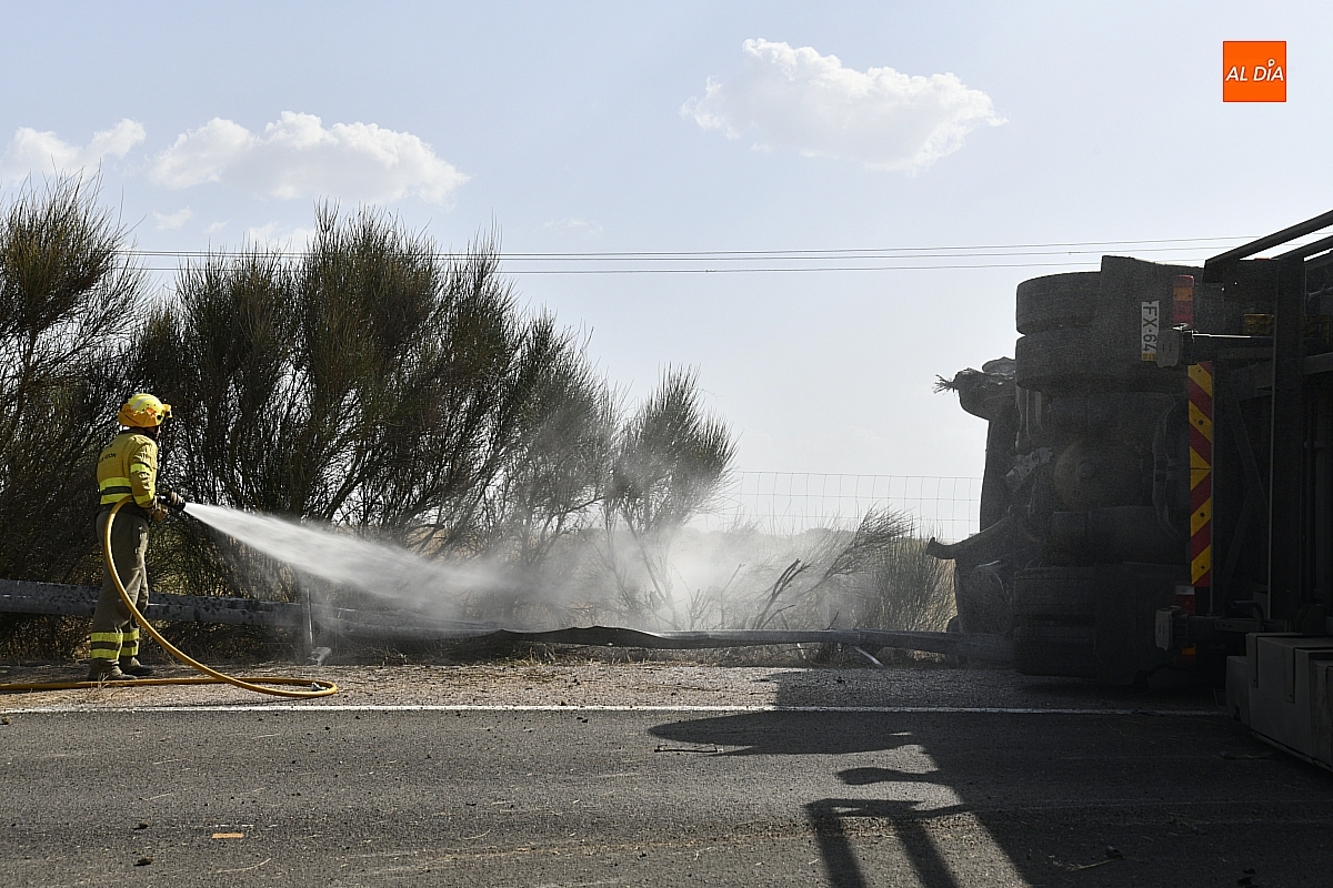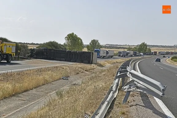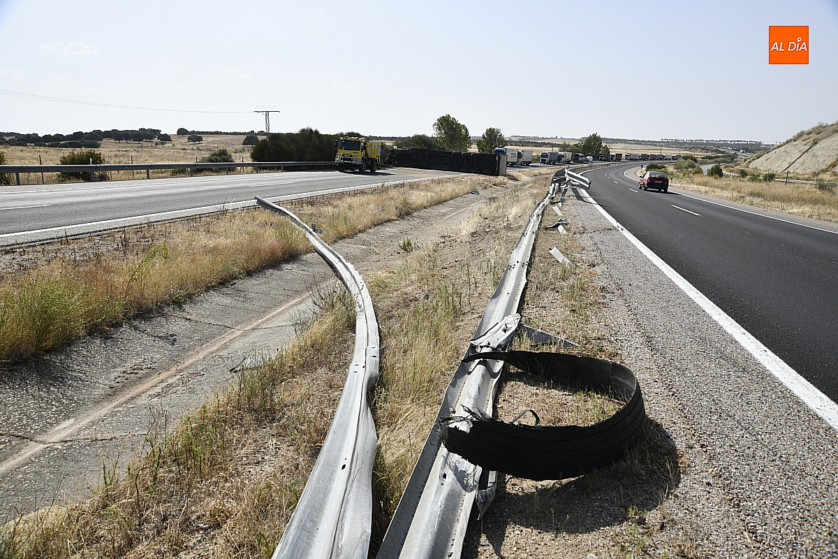 Un camión sufrió en la tarde del viernes un aparatoso accidente de tráfico en la A-62 a la altura de Ciudad Rodrigo que se saldó por suerte sin ningún tipo de daño personal. El suceso se produjo en torno a las 17.30 horas en la zona de Fonseca (dentro del término municipal de Ciudad Rodrigo), cuando al camión protagonista de los hechos –que circulaba en sentido Portugal- le reventó una rueda.
