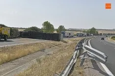 Un camión salta la mediana tras reventarle una rueda y acaba volcado en el otro sentido de la A-62