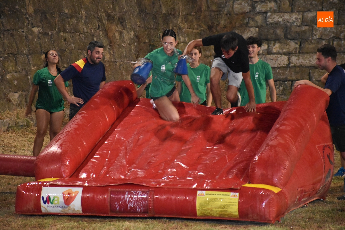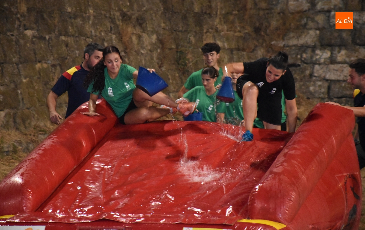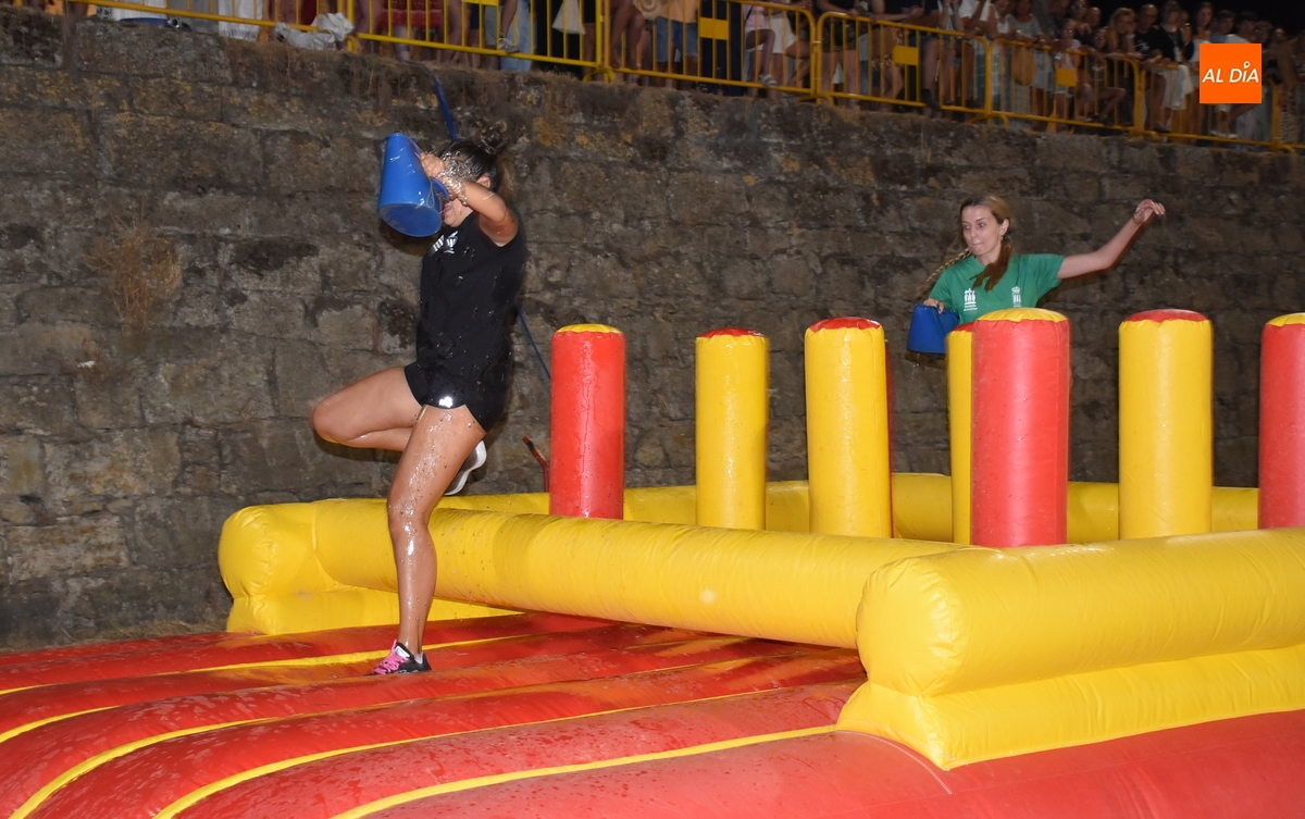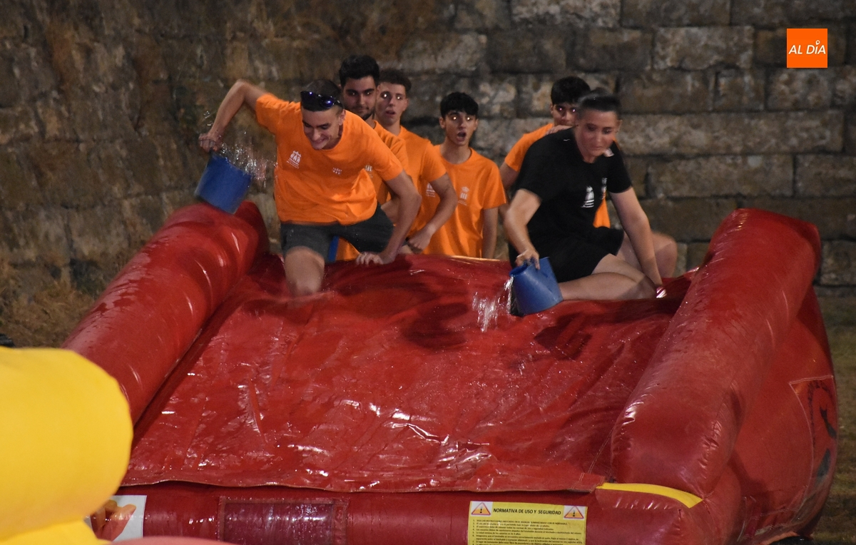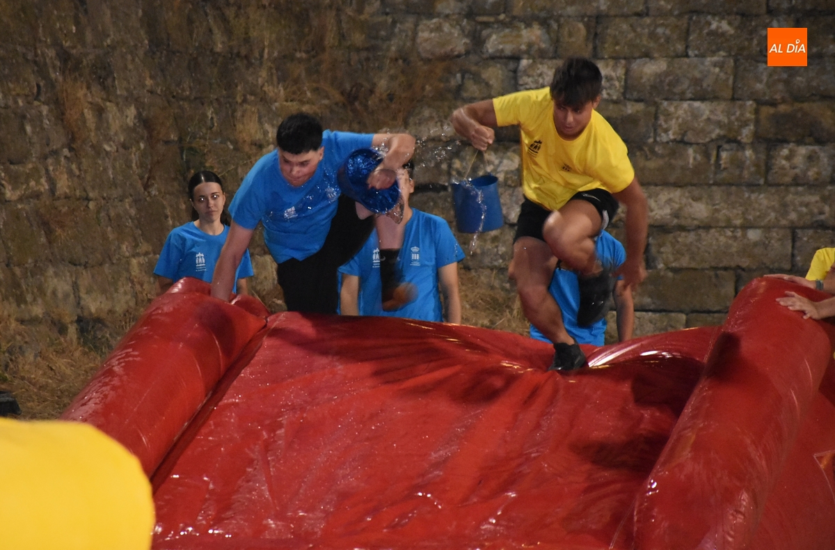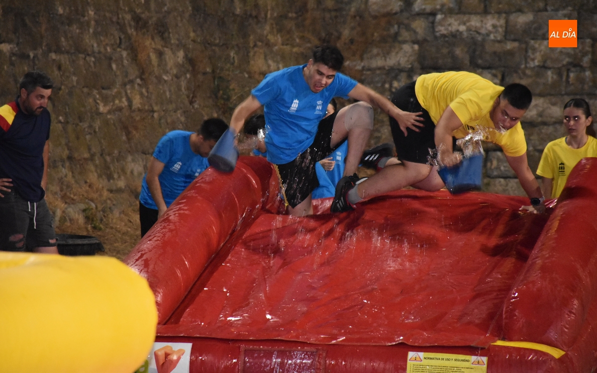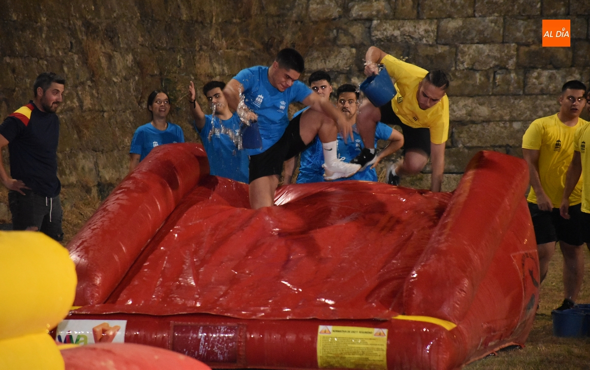 Tras unas palabras de bienvenida de la delegada de Juventud, Ana María Castaño, los equipos hicieron su entrada en el foso desde la Rúa del Sol mientras sonaba la intro de presentación, enfrentándose rápidamente al primer juego, compuesto por tres hinchables que tenían que superar manteniendo la mayor cantidad de agua posible en unos cubos. Tras ello hubo otros dos juegos con hinchables, y otro en el que a ciegas intentaron explotar unos globos colgados de un arco.