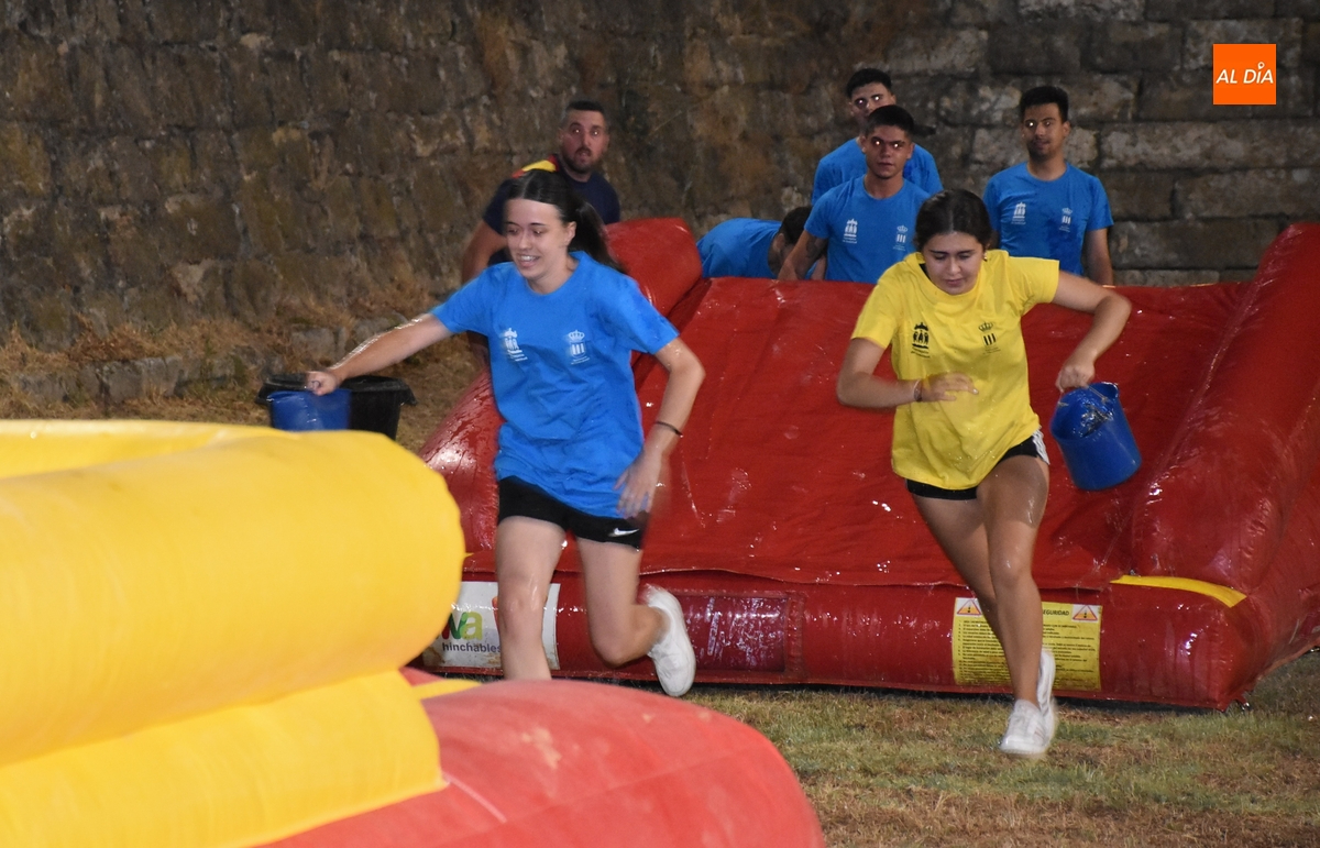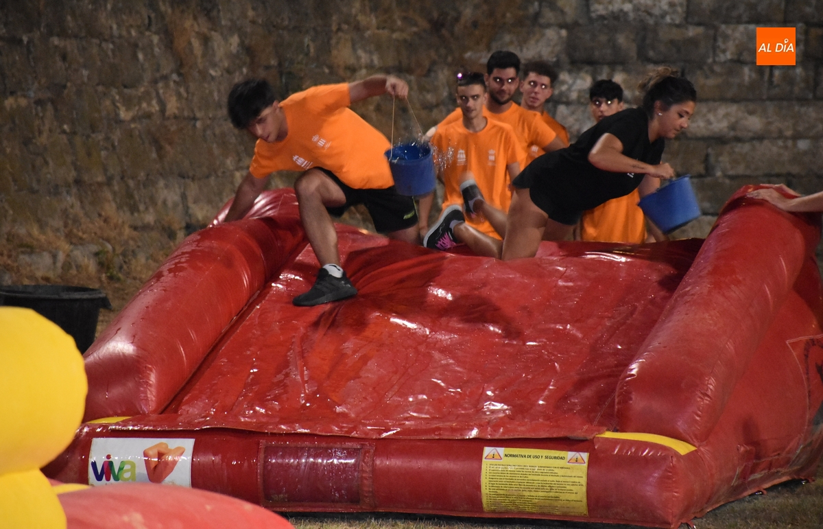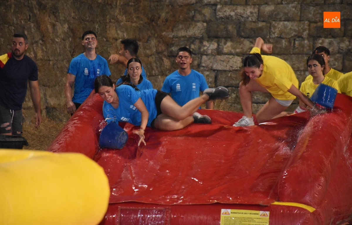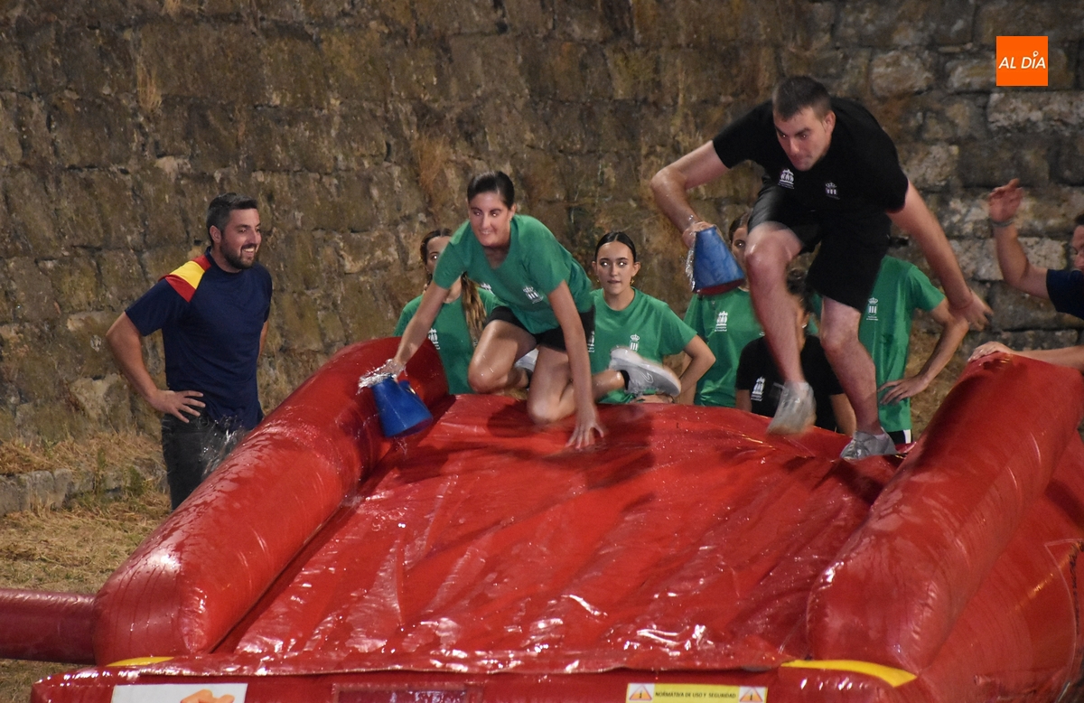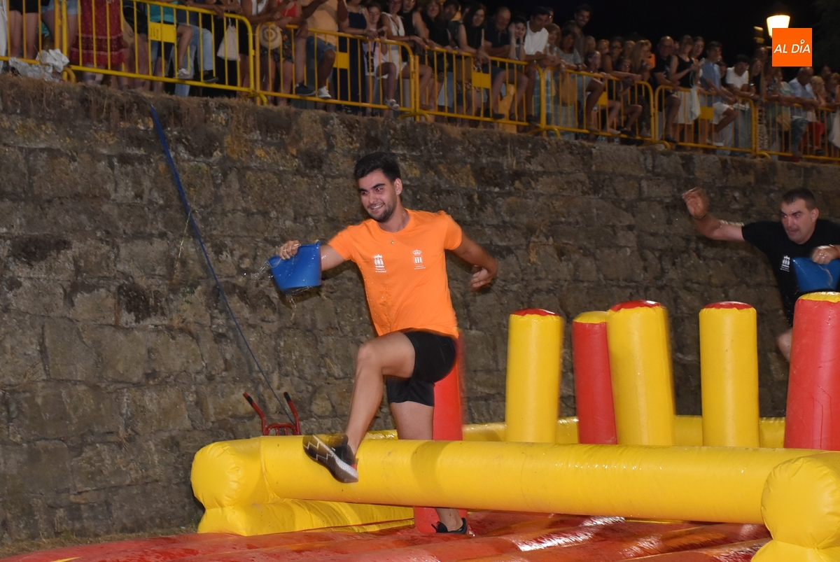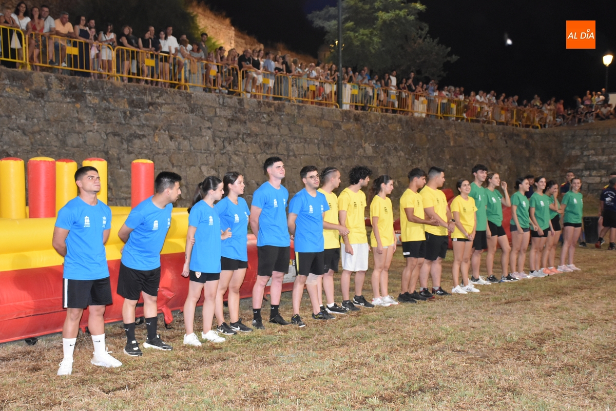 Tras unas palabras de bienvenida de la delegada de Juventud, Ana María Castaño, los equipos hicieron su entrada en el foso desde la Rúa del Sol mientras sonaba la intro de presentación, enfrentándose rápidamente al primer juego, compuesto por tres hinchables que tenían que superar manteniendo la mayor cantidad de agua posible en unos cubos. Tras ello hubo otros dos juegos con hinchables, y otro en el que a ciegas intentaron explotar unos globos colgados de un arco.