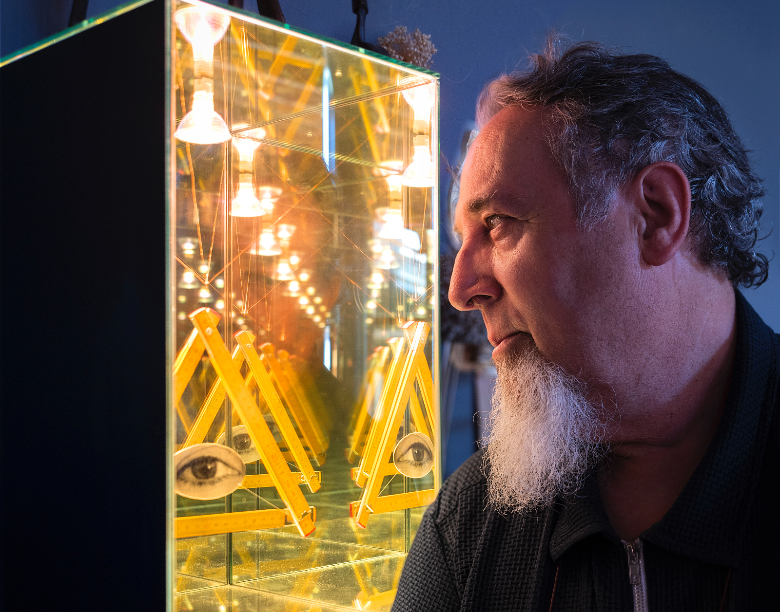 V.G.C.: Un día, Manolo Morollón, galerista de Raya Punto, nos dio un metro de esos amarillos a un montón de artistas para que hiciésemos una obra. A mí desde pequeño, me había fascinado hacer triángulos con ese tipo de metros. Quería el ojo que todo lo ve y usé el de mi mujer. Ella está de espaldas al sol que aparece reflejado como yo en su iris. “Helios y yo en el ojo de Carmen intentando medir el infinito”. Un título muy barroco que tenía pensado desde que era estudiante, en los setenta, cuando estaba aprendiendo la perspectiva cónica. En este usé cristales que reflejan la imagen hasta el infinito.
