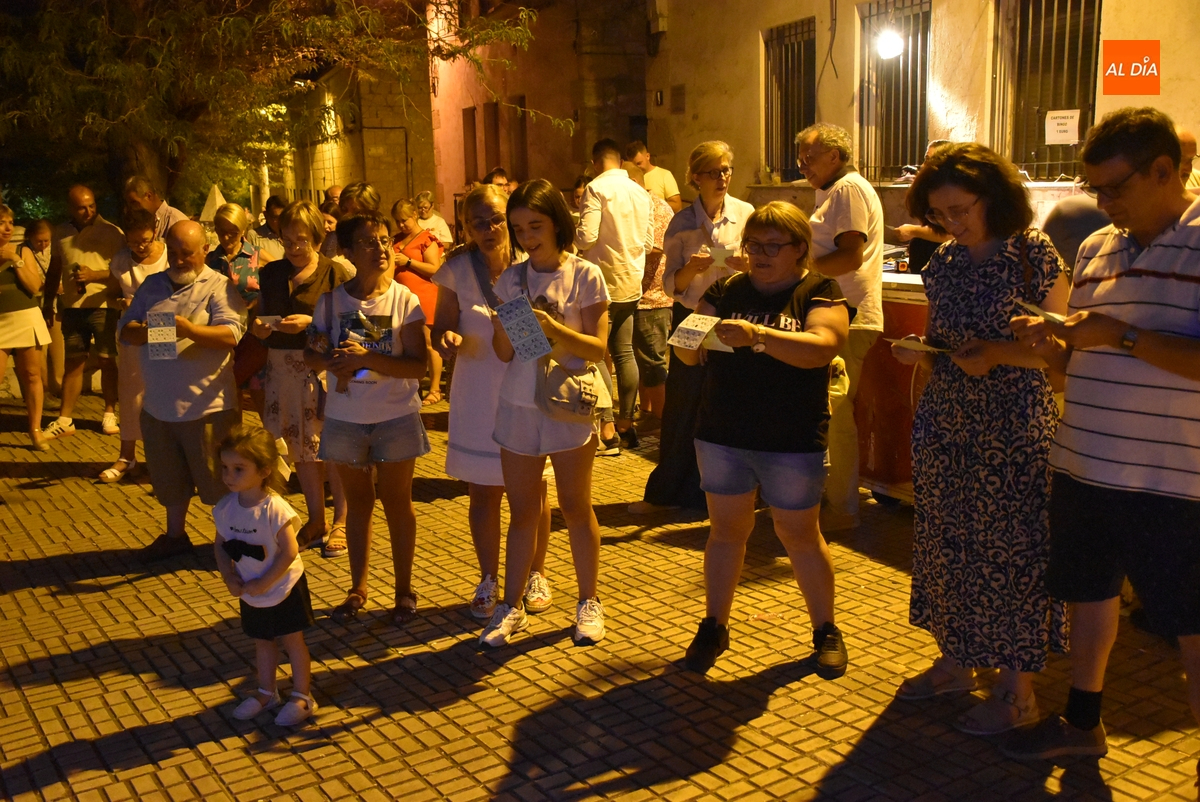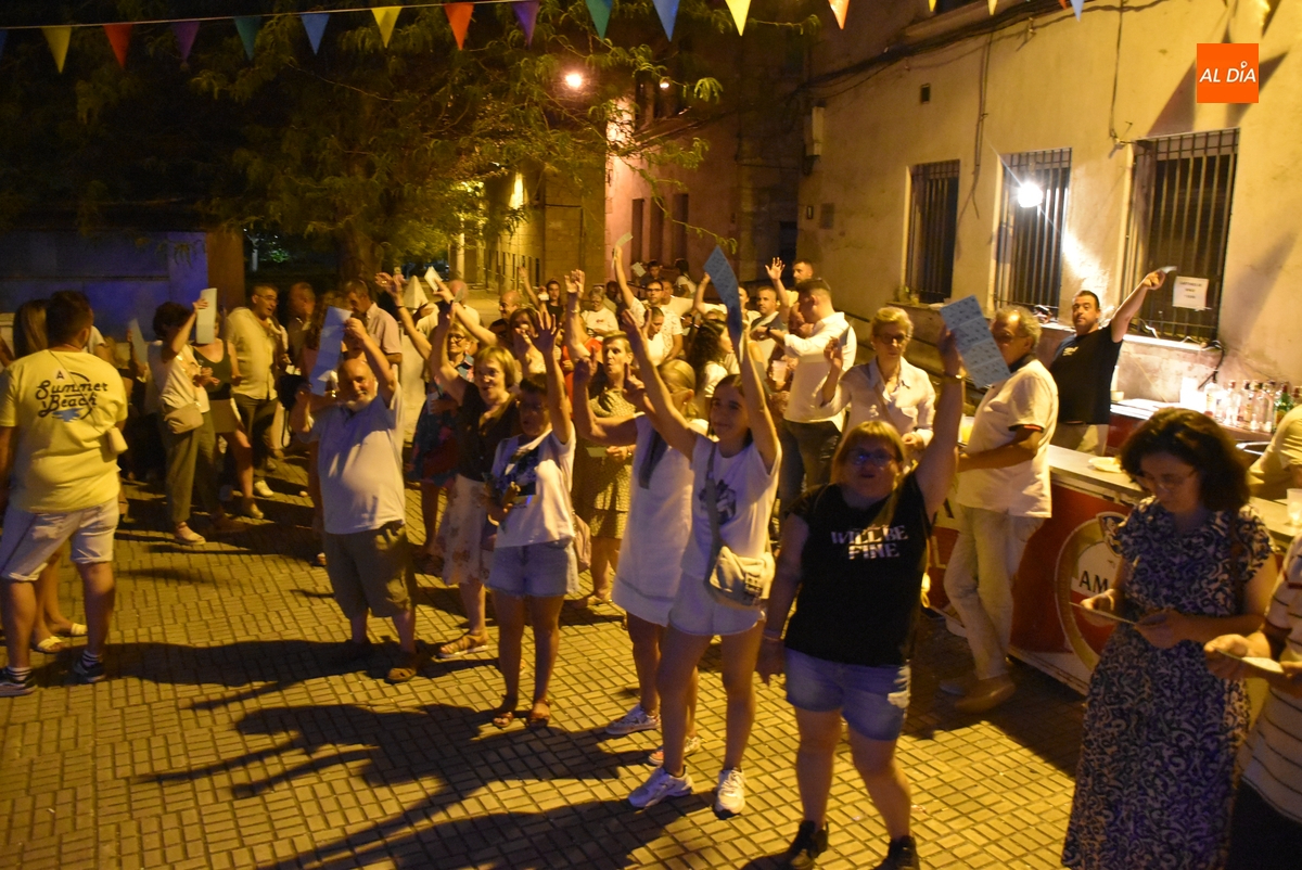 Aunque en el tramo inicial hubo algo de ‘timidez’, poco a poco el público –que fue creciendo- se fue mostrando más activo, conformándose incluso en un momento dado un tren que fue sumando ‘vagones’ tanto locales como foráneos. Como descanso de la actuación de Va por ti, San Andrés volvió a proponer un bingo entre todos aquellos que hubiesen comprado cartones (a un precio de 1€ el cartón y de 4€ una ristra de 6). Este bingo puso en juego piezas de embutido para la primera línea y el primer bingo.