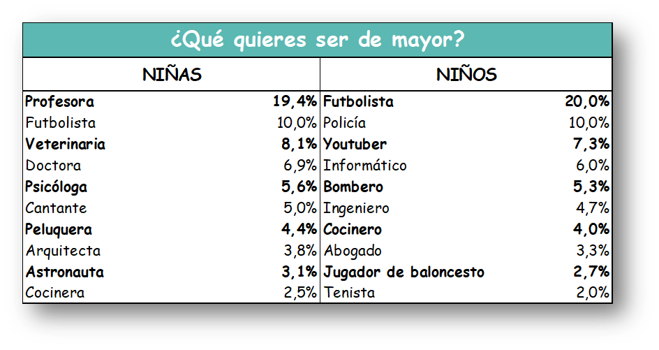 Las aspiraciones profesionales de los más pequeños se mantienen estables respecto a años anteriores. Las niñas siguen soñando con ser profesoras (19,4%), mientras que los niños desean ser futbolistas (20%).