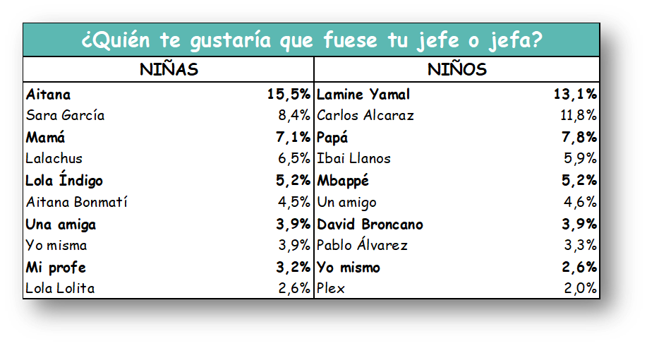 En cuanto a las preferencias de liderazgo, existen claras diferencias por género. Las niñas eligen, por segundo año consecutivo, a la cantante catalana Aitana como su jefa ideal, con un 15,5% de los votos. Por su parte, los niños se decantan por el jugador del F.C. Barcelona, Lamine Yamal, que irrumpe en el ranking con un 13,1%.
