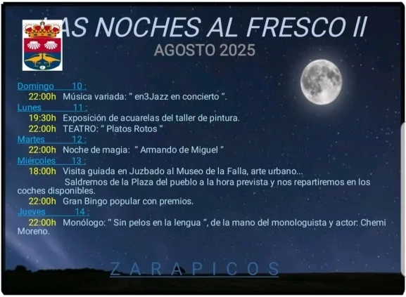 El municipio de Zarapicos celebra la segunda edición de su programa cultural 'Las Noches al Fresco', que se desarrollará hasta el próximo 14 de agosto. La agenda incluye una variada oferta de actividades para todos los públicos, como conciertos, una representación teatral, un espectáculo de magia y un monólogo a cargo de Chemi Moreno. El programa se completa con una exposición de acuarelas, un bingo popular y una visita cultural a la vecina localidad de Juzbado.
