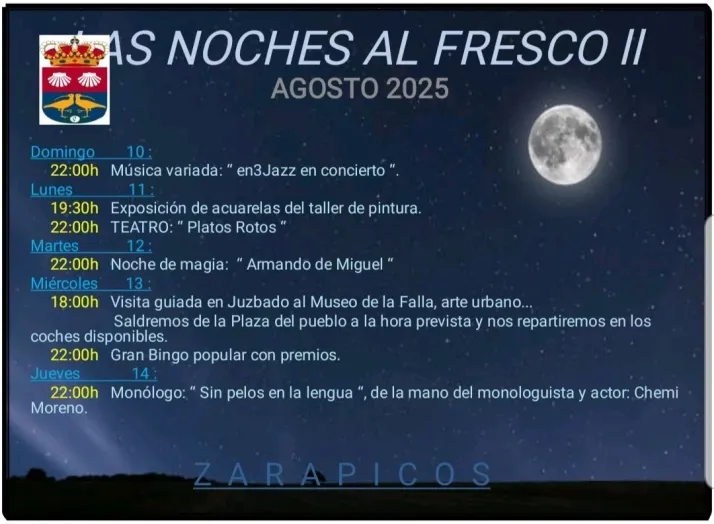 El municipio de Zarapicos da la bienvenida a la segunda edición de 'Las Noches al Fresco', un completo programa cultural que llenará de vida las veladas de esta semana de agosto. Las actividades, que comenzaron este pasado domingo, se extenderán hasta el jueves ofreciendo propuestas para todos los públicos, desde conciertos y teatro hasta magia y humor.