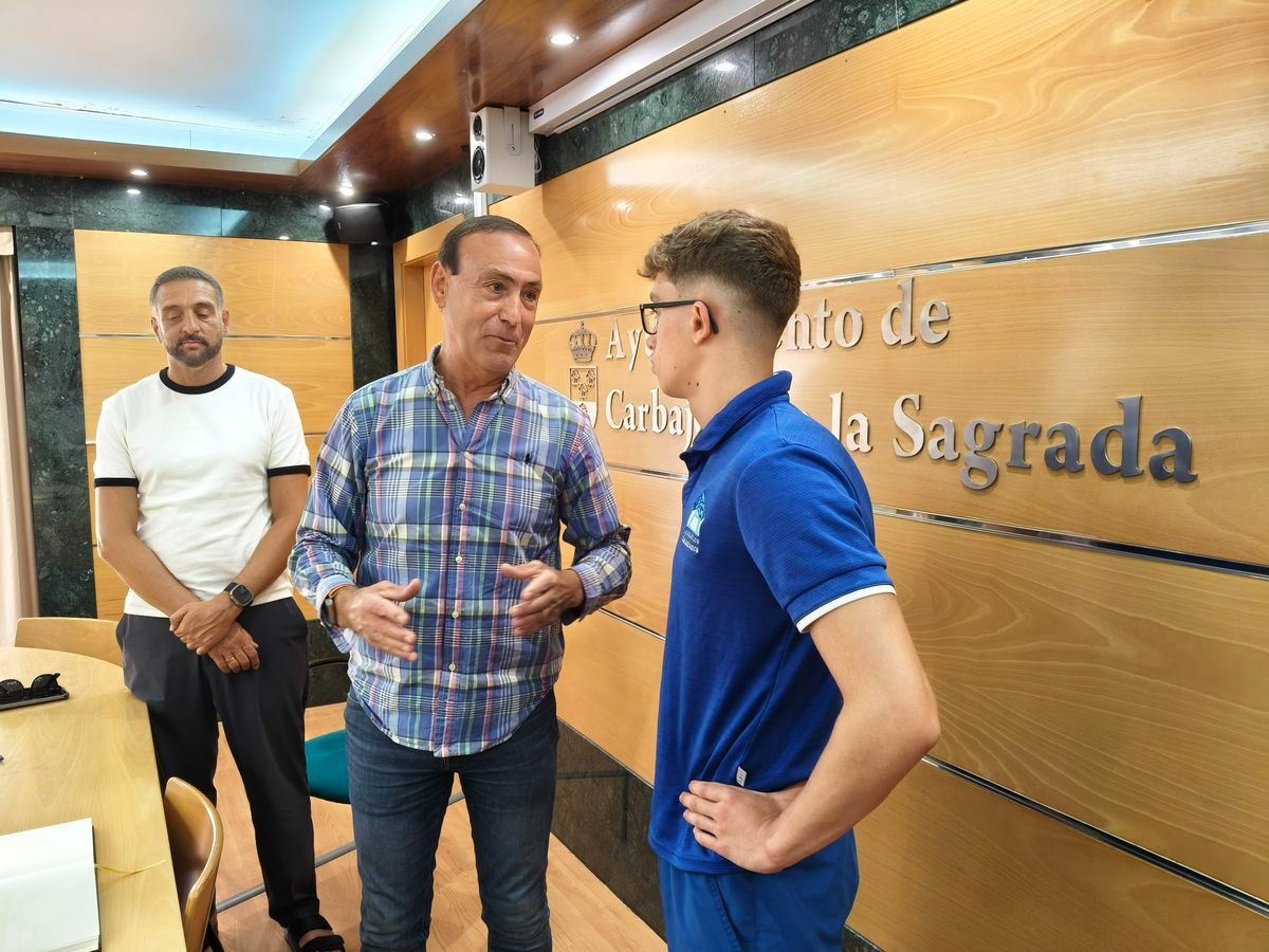 El Ayuntamiento de Carbajosa de la Sagrada ha recibido este martes la visita de Manuel Delgado Sánchez, subcampeón de España y Medalla de Plata en la prueba de 100 metros mariposa en el XLVI Campeonato de España Junior de Natación de Verano y actual poseedor del récord absoluto de Castilla y León en los 100 metros mariposa.