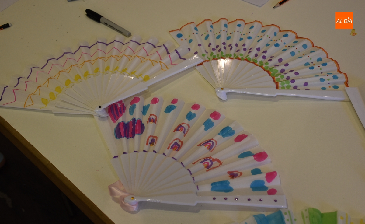 Para facilitar la realización del taller (de carácter gratuito), en esta ocasión hubo dos turnos a lo largo de la mañana, en cada uno de los cuales participaron diez chavales (de entre 8 y 14 años), que estuvieron decorando con los motivos que cada uno quiso los abanicos blancos que les repartieron.