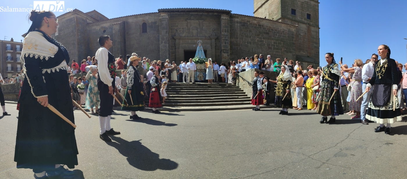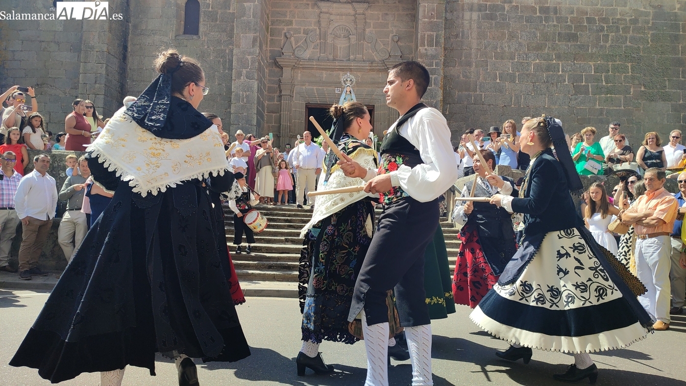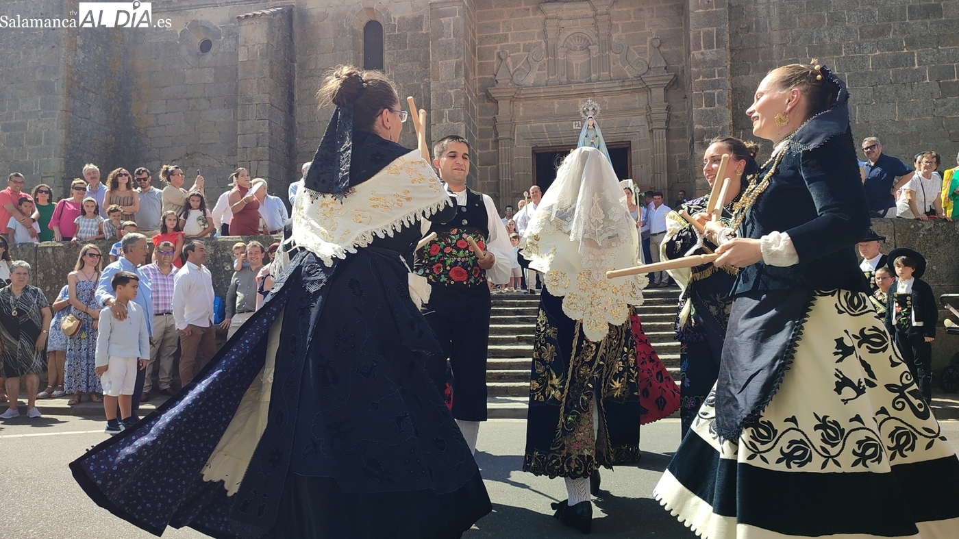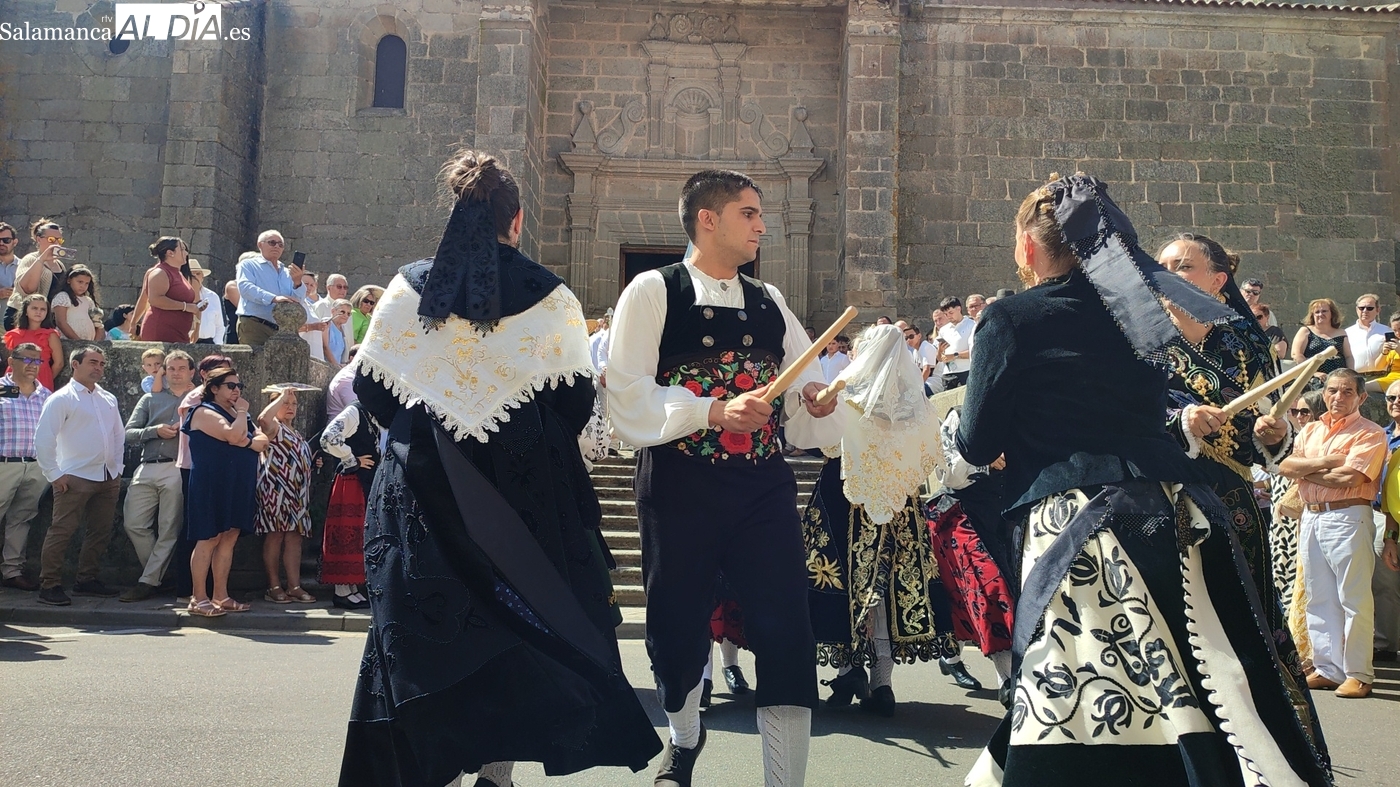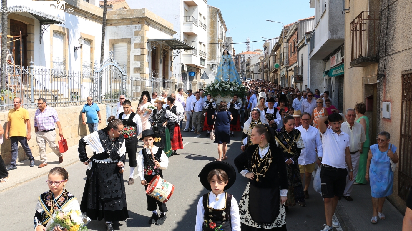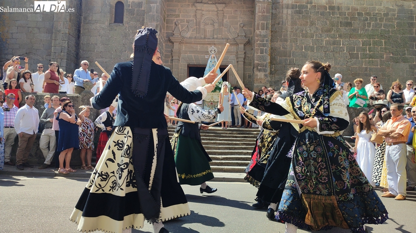 Tras la misa concelebrada y oficiada por el párrolco local Francisco Fraile, con presencia de autoridades locales, entre los que se encontraba el alcalde Javier Muñiz, acompañado del teniente de alcalde Chago Vicente con la concejala Isabel Cañizal, las campanas de la iglesia anunciaban la salida de la Virgen del Socorro a hombros de sus fieles y escoltada por sus mayordomas. Entre tanto, los sones de la gaita y el tamboril del joven tamborilero de Vitigudino, de 10 años de edad, Mateo Vicente, comenzaban a escucharse para recibir en la calle a Nuestra Señora, donde la aguardaban los integrantes del grupo de folclore Organza para ofrecerle una danza de paleo.