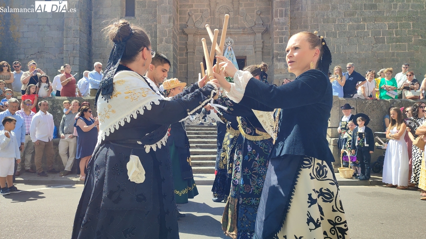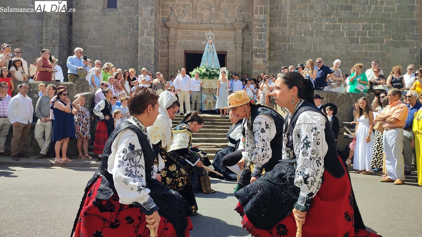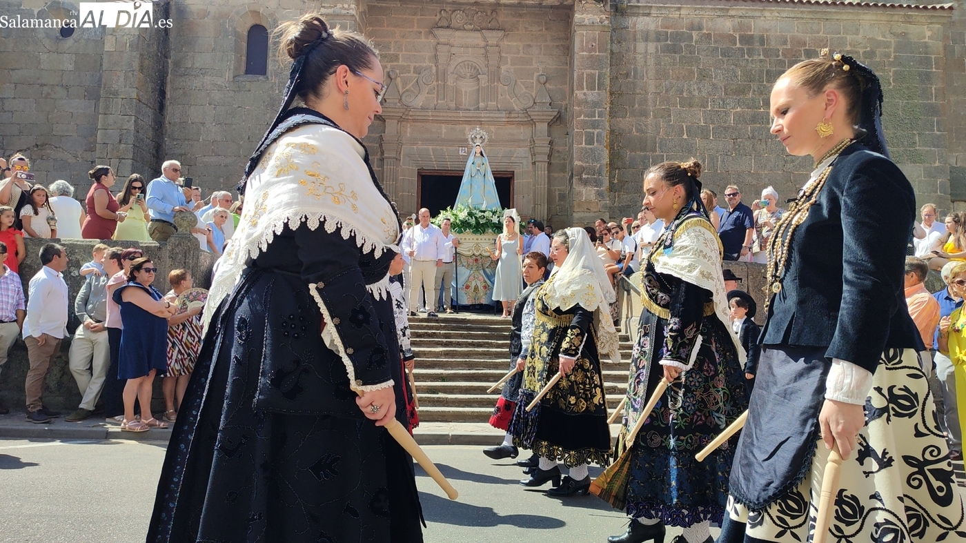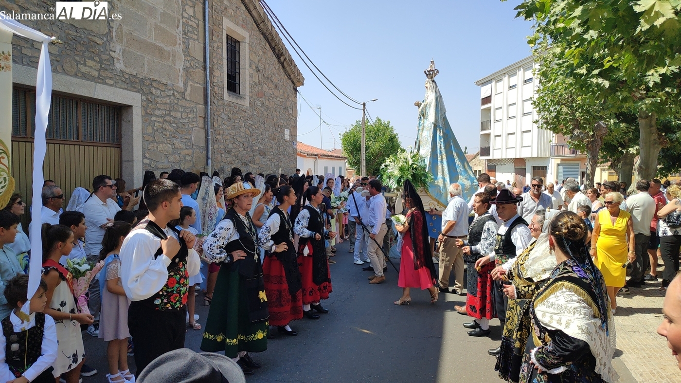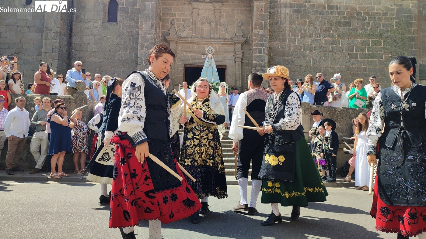 Tras la misa concelebrada y oficiada por el párrolco local Francisco Fraile, con presencia de autoridades locales, entre los que se encontraba el alcalde Javier Muñiz, acompañado del teniente de alcalde Chago Vicente con la concejala Isabel Cañizal, las campanas de la iglesia anunciaban la salida de la Virgen del Socorro a hombros de sus fieles y escoltada por sus mayordomas. Entre tanto, los sones de la gaita y el tamboril del joven tamborilero de Vitigudino, de 10 años de edad, Mateo Vicente, comenzaban a escucharse para recibir en la calle a Nuestra Señora, donde la aguardaban los integrantes del grupo de folclore Organza para ofrecerle una danza de paleo.
