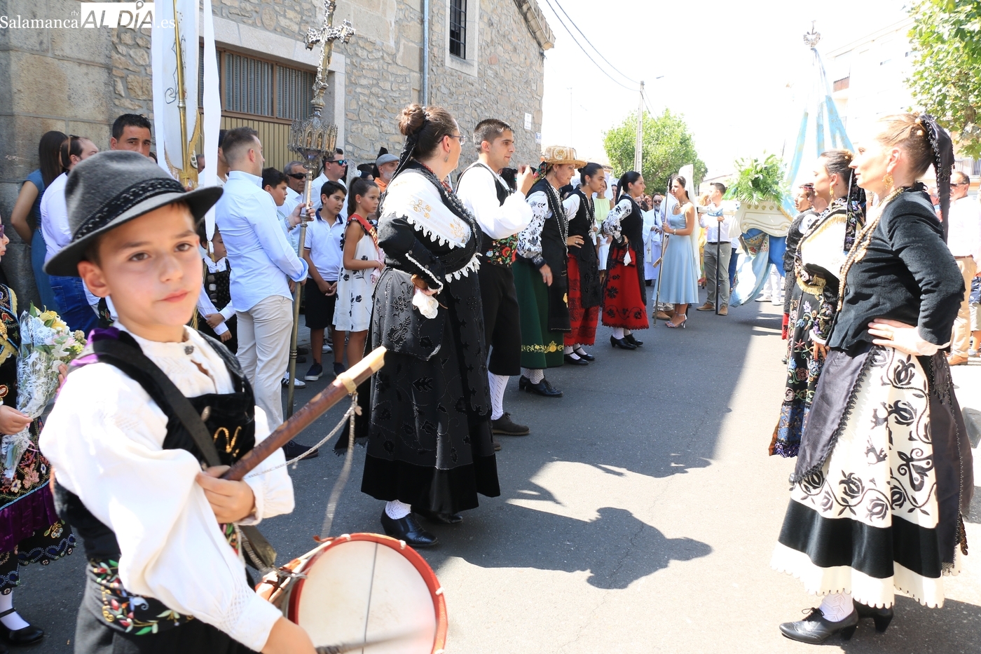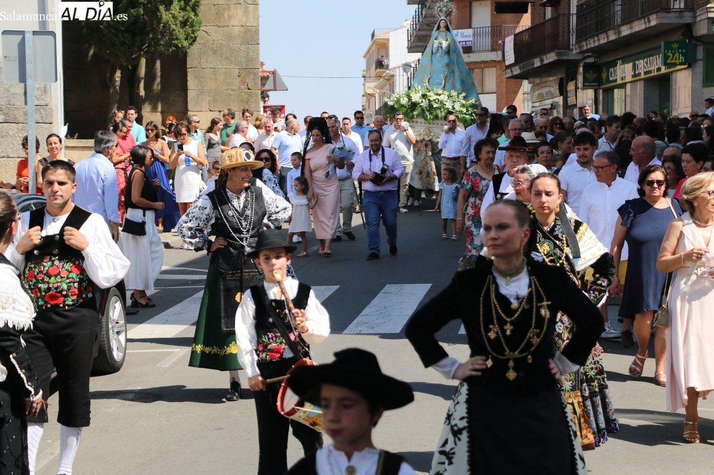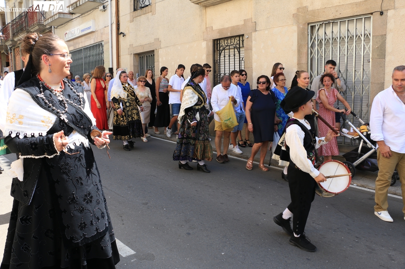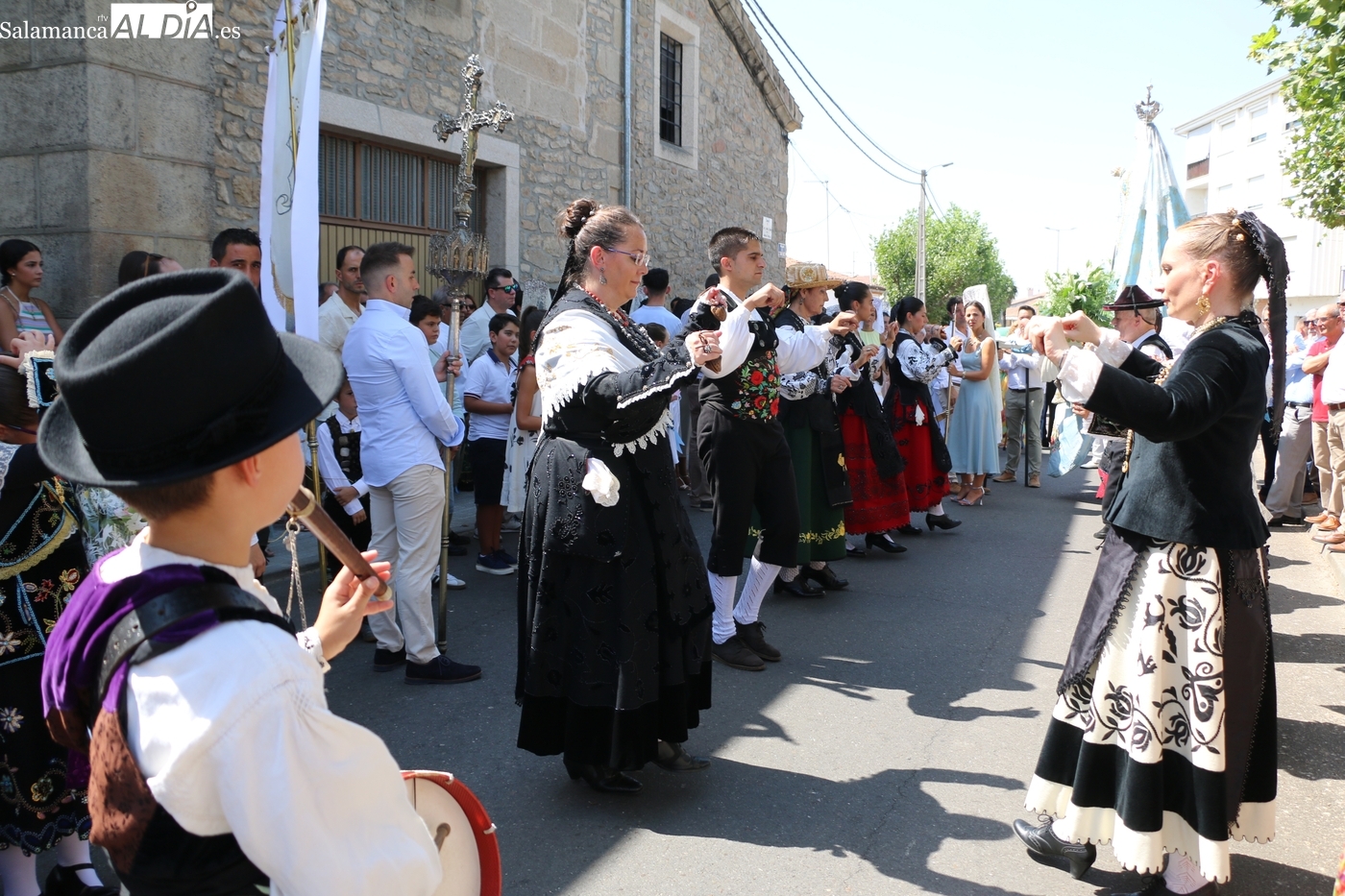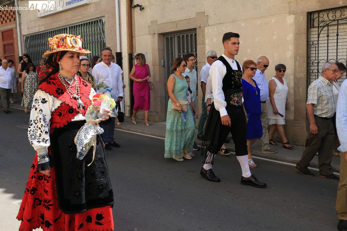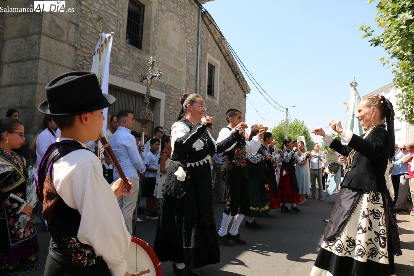 Tras la misa concelebrada y oficiada por el párrolco local Francisco Fraile, con presencia de autoridades locales, entre los que se encontraba el alcalde Javier Muñiz, acompañado del teniente de alcalde Chago Vicente con la concejala Isabel Cañizal, las campanas de la iglesia anunciaban la salida de la Virgen del Socorro a hombros de sus fieles y escoltada por sus mayordomas. Entre tanto, los sones de la gaita y el tamboril del joven tamborilero de Vitigudino, de 10 años de edad, Mateo Vicente, comenzaban a escucharse para recibir en la calle a Nuestra Señora, donde la aguardaban los integrantes del grupo de folclore Organza para ofrecerle una danza de paleo.