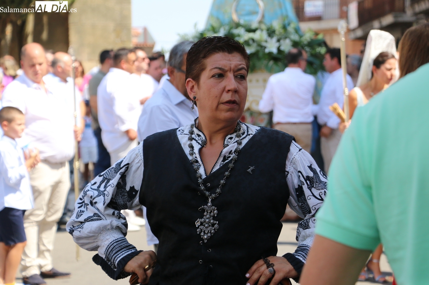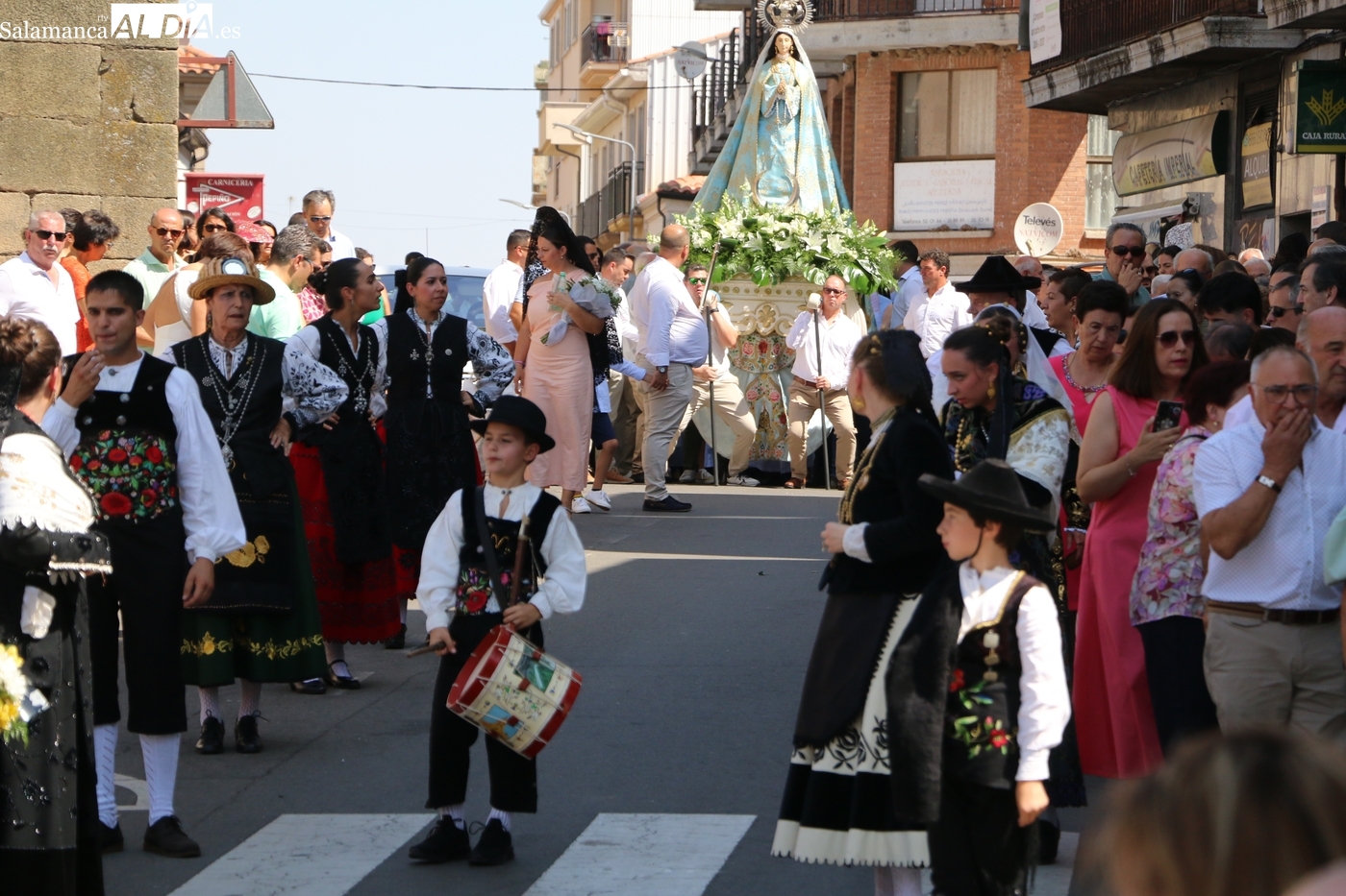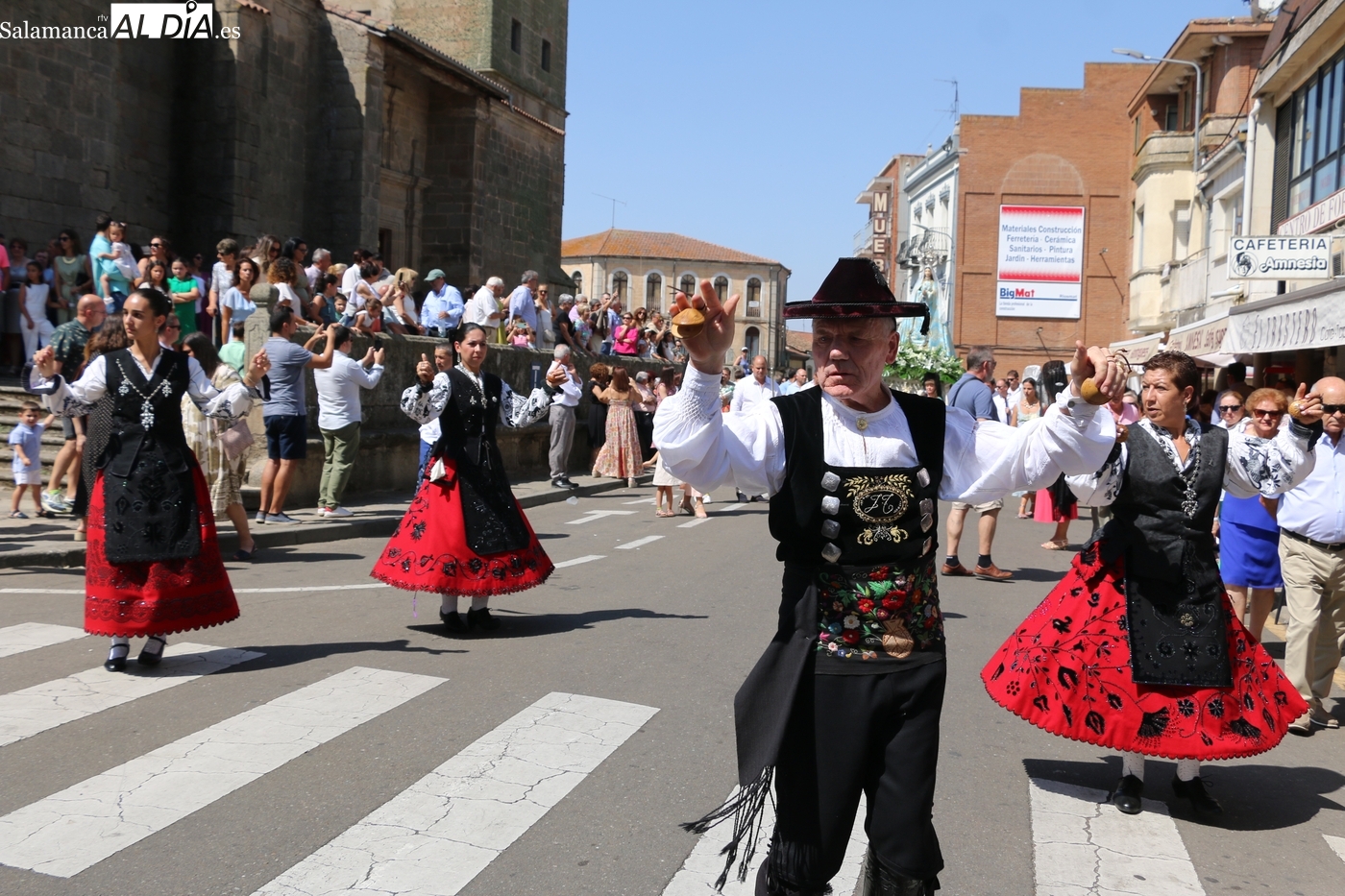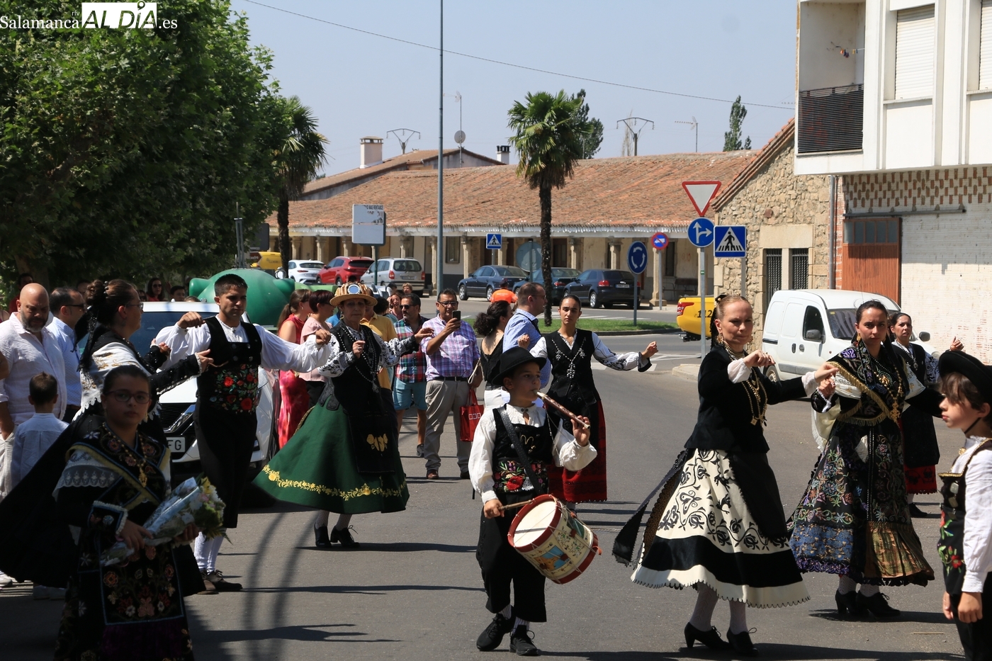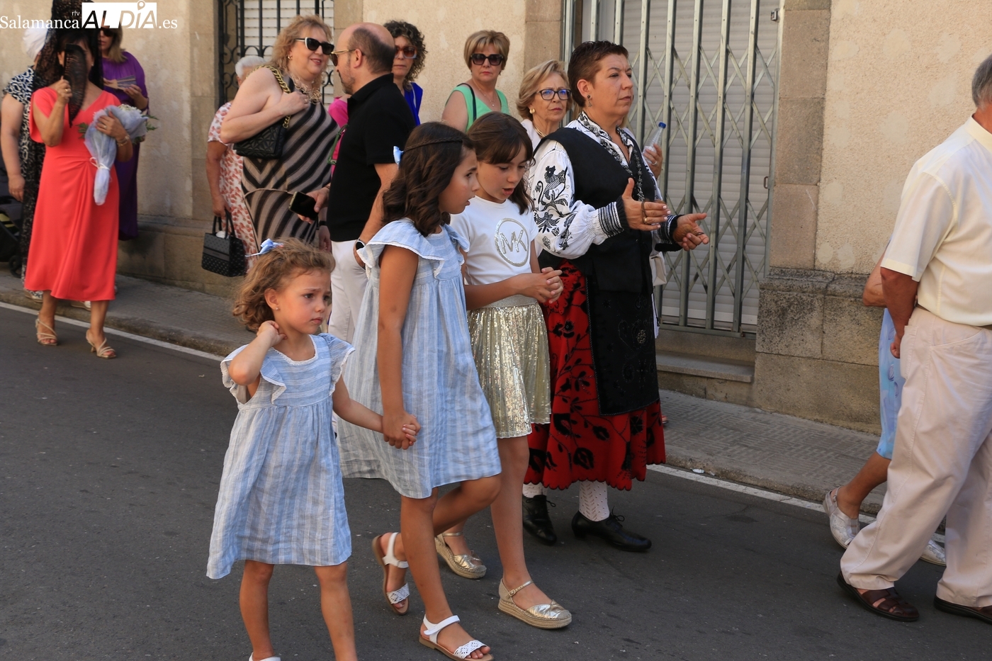 Tras la misa concelebrada y oficiada por el párrolco local Francisco Fraile, con presencia de autoridades locales, entre los que se encontraba el alcalde Javier Muñiz, acompañado del teniente de alcalde Chago Vicente con la concejala Isabel Cañizal, las campanas de la iglesia anunciaban la salida de la Virgen del Socorro a hombros de sus fieles y escoltada por sus mayordomas. Entre tanto, los sones de la gaita y el tamboril del joven tamborilero de Vitigudino, de 10 años de edad, Mateo Vicente, comenzaban a escucharse para recibir en la calle a Nuestra Señora, donde la aguardaban los integrantes del grupo de folclore Organza para ofrecerle una danza de paleo.