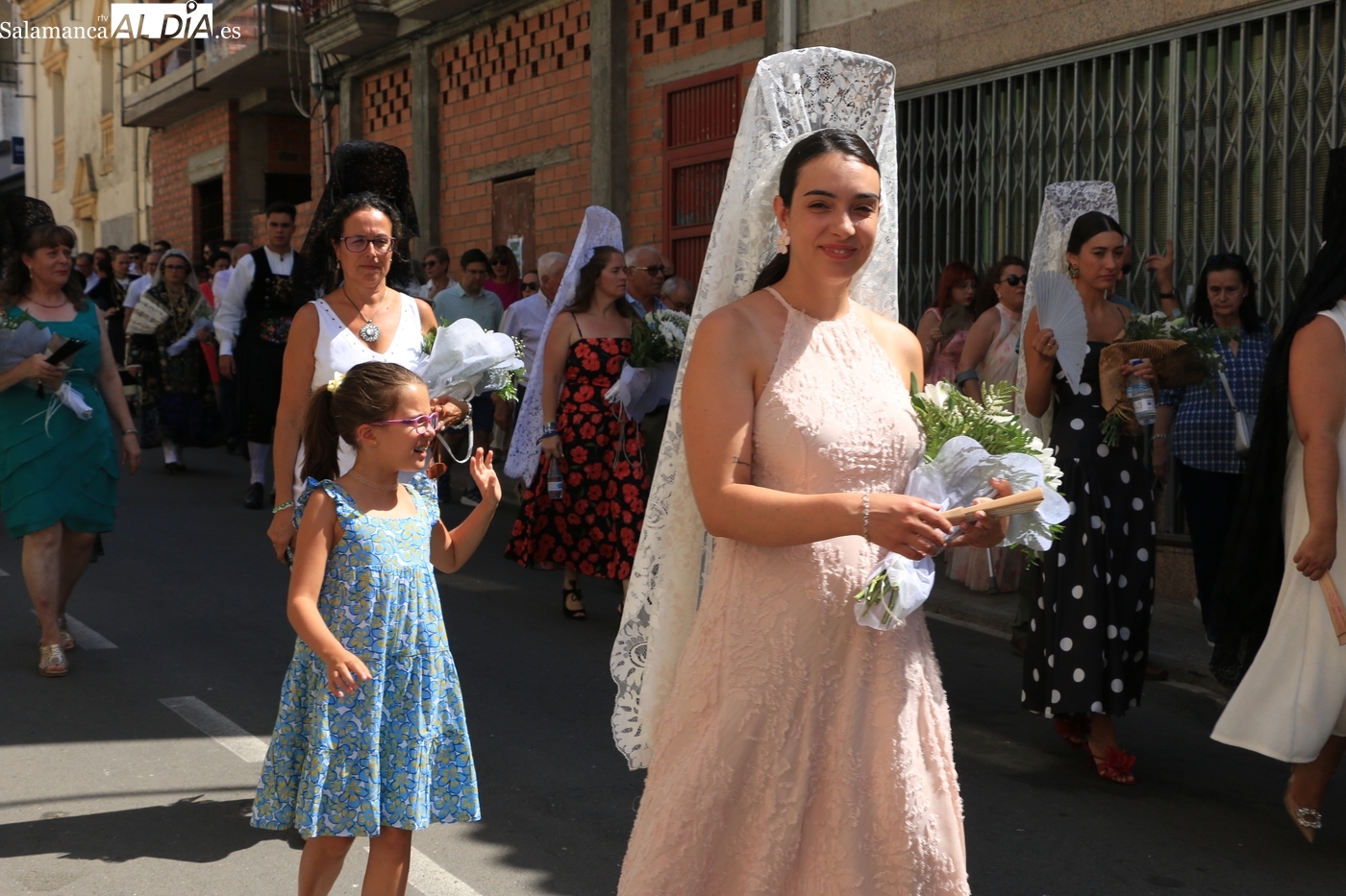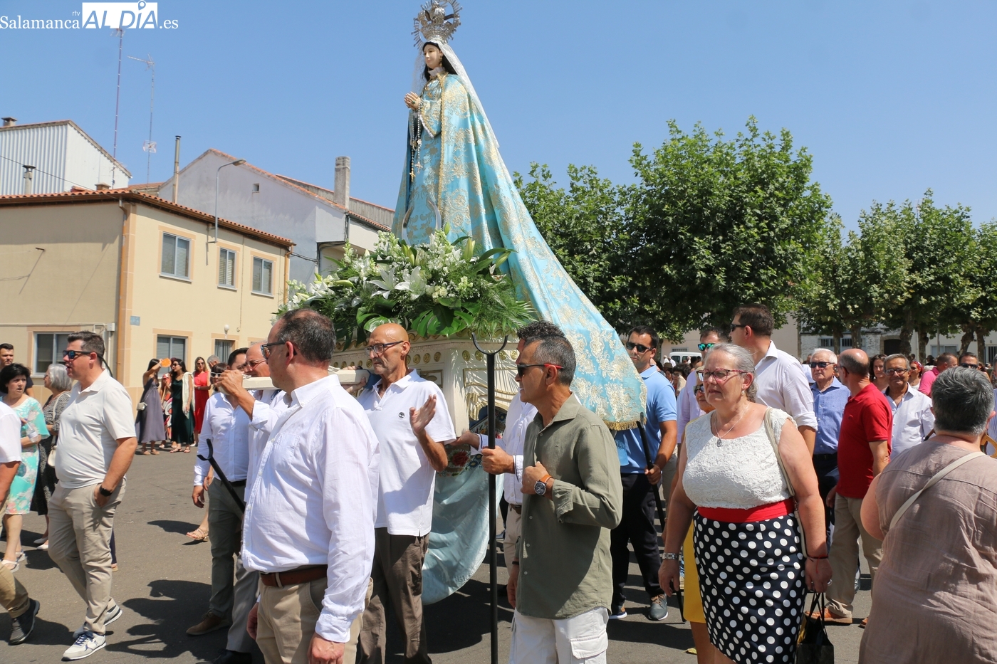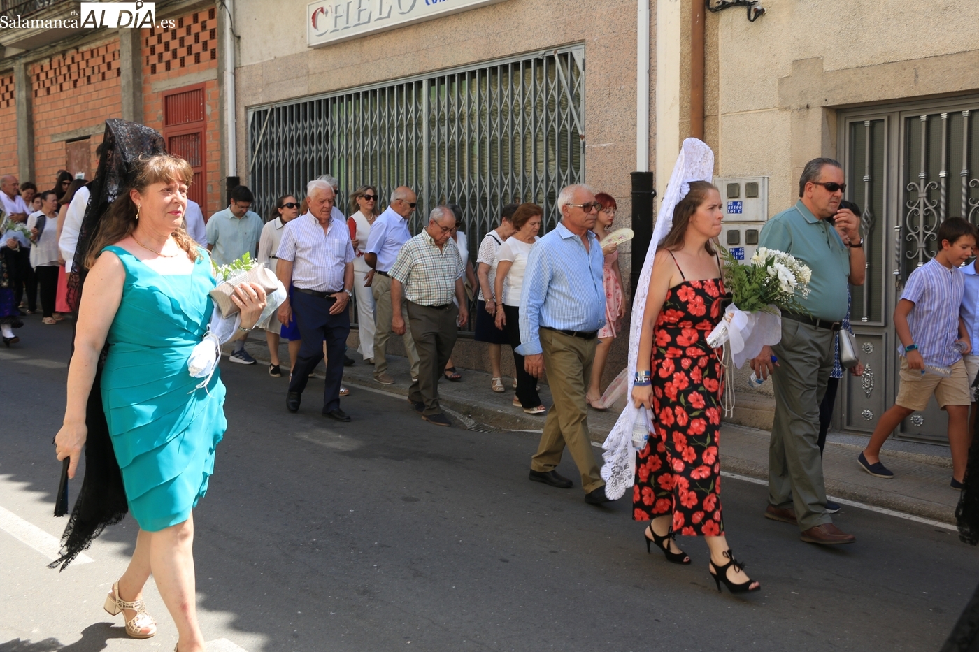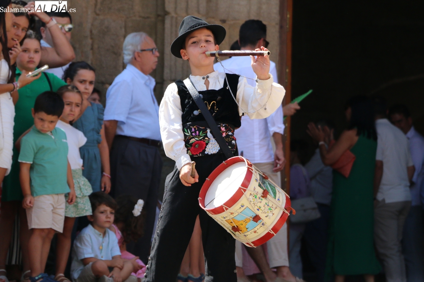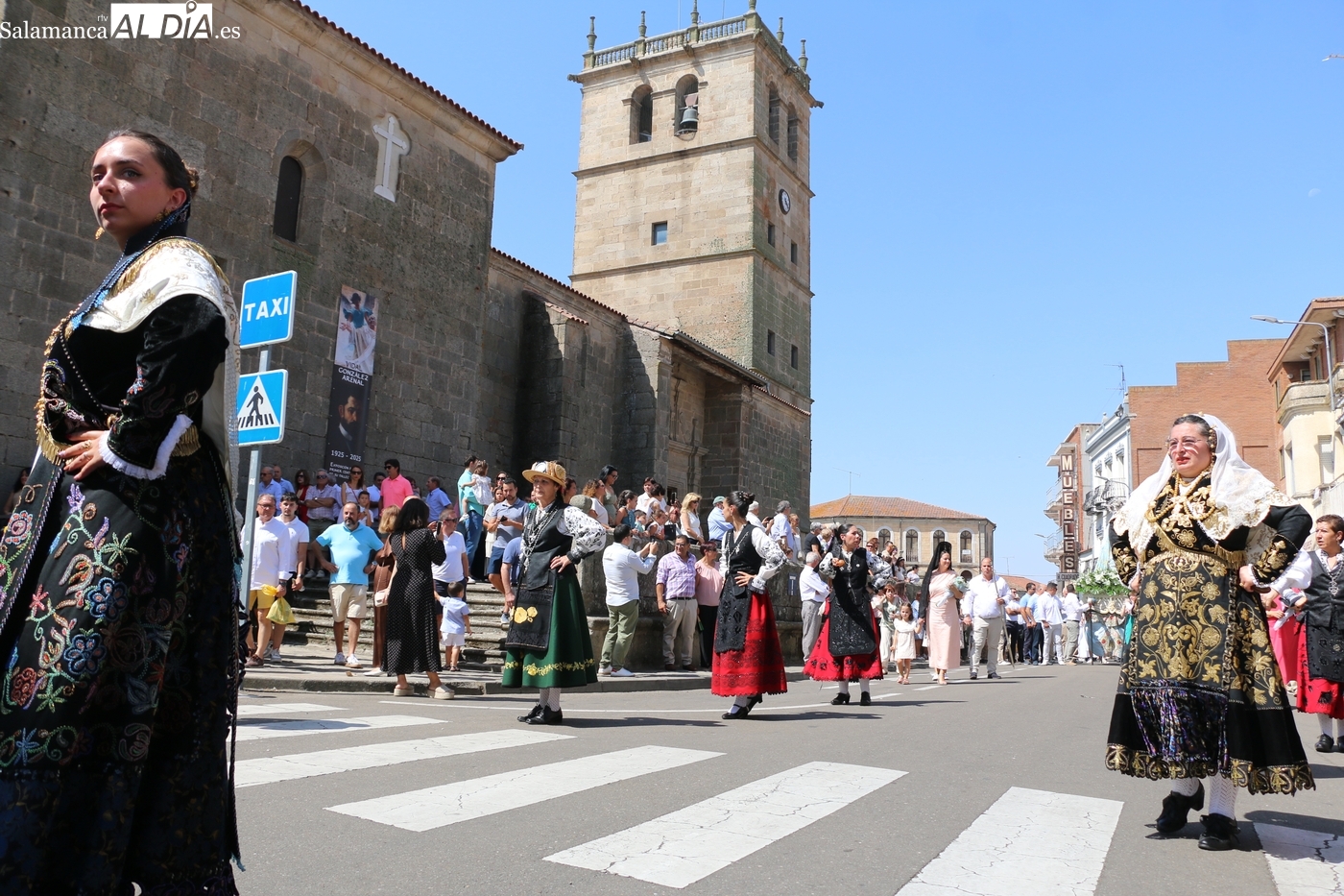 Tras la misa concelebrada y oficiada por el párrolco local Francisco Fraile, con presencia de autoridades locales, entre los que se encontraba el alcalde Javier Muñiz, acompañado del teniente de alcalde Chago Vicente con la concejala Isabel Cañizal, las campanas de la iglesia anunciaban la salida de la Virgen del Socorro a hombros de sus fieles y escoltada por sus mayordomas. Entre tanto, los sones de la gaita y el tamboril del joven tamborilero de Vitigudino, de 10 años de edad, Mateo Vicente, comenzaban a escucharse para recibir en la calle a Nuestra Señora, donde la aguardaban los integrantes del grupo de folclore Organza para ofrecerle una danza de paleo.