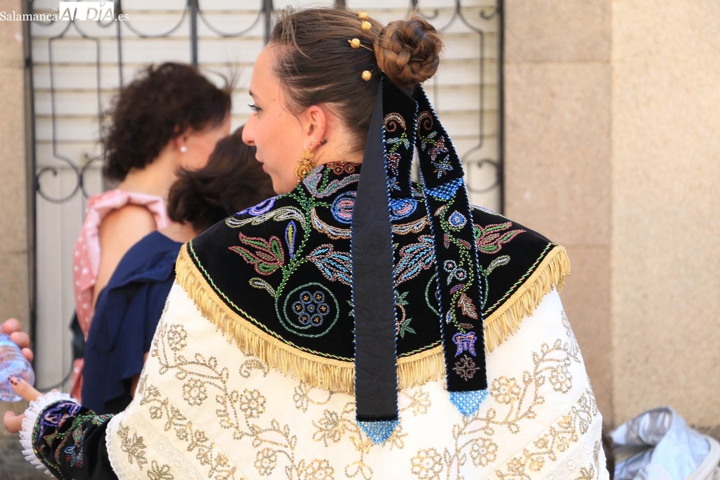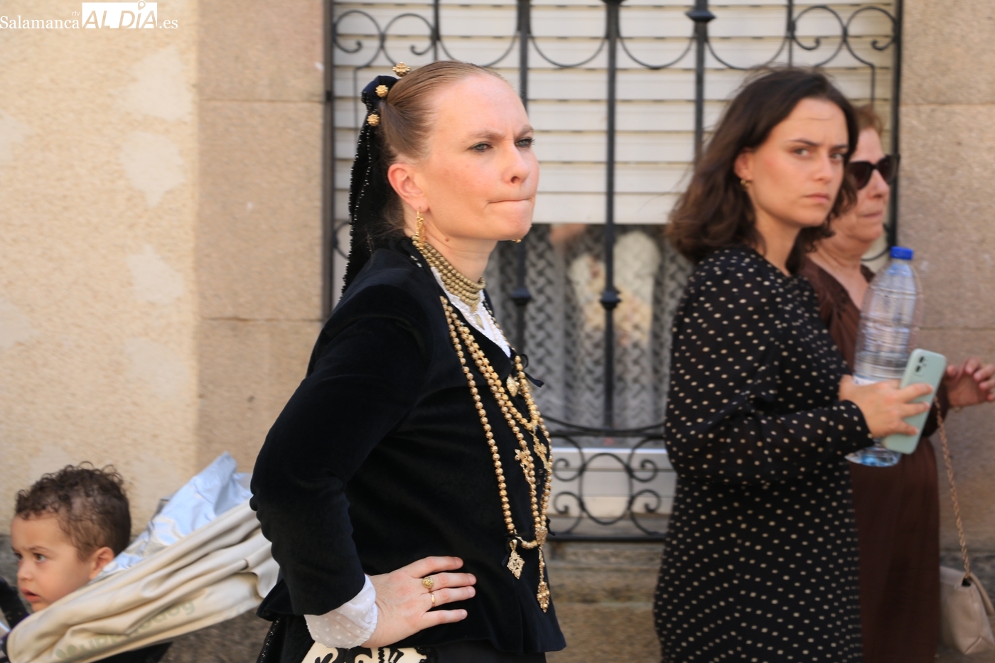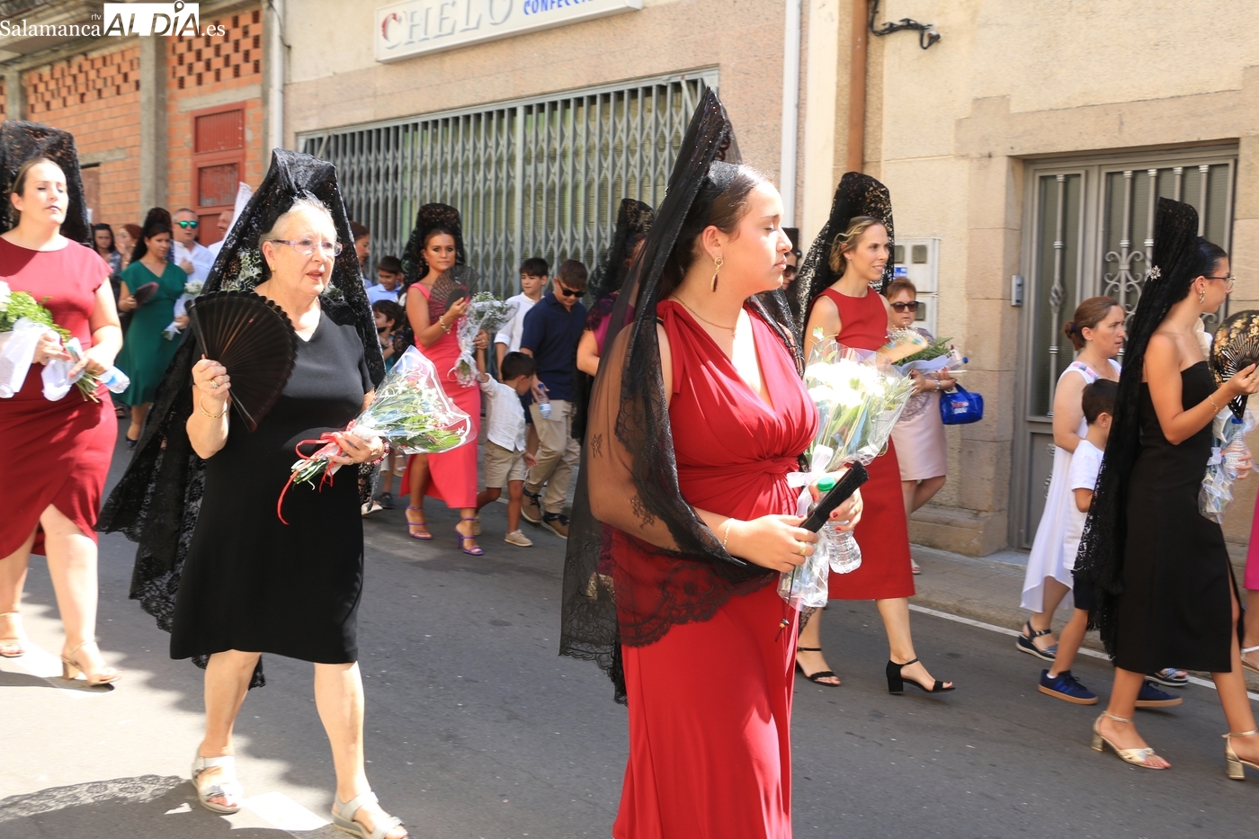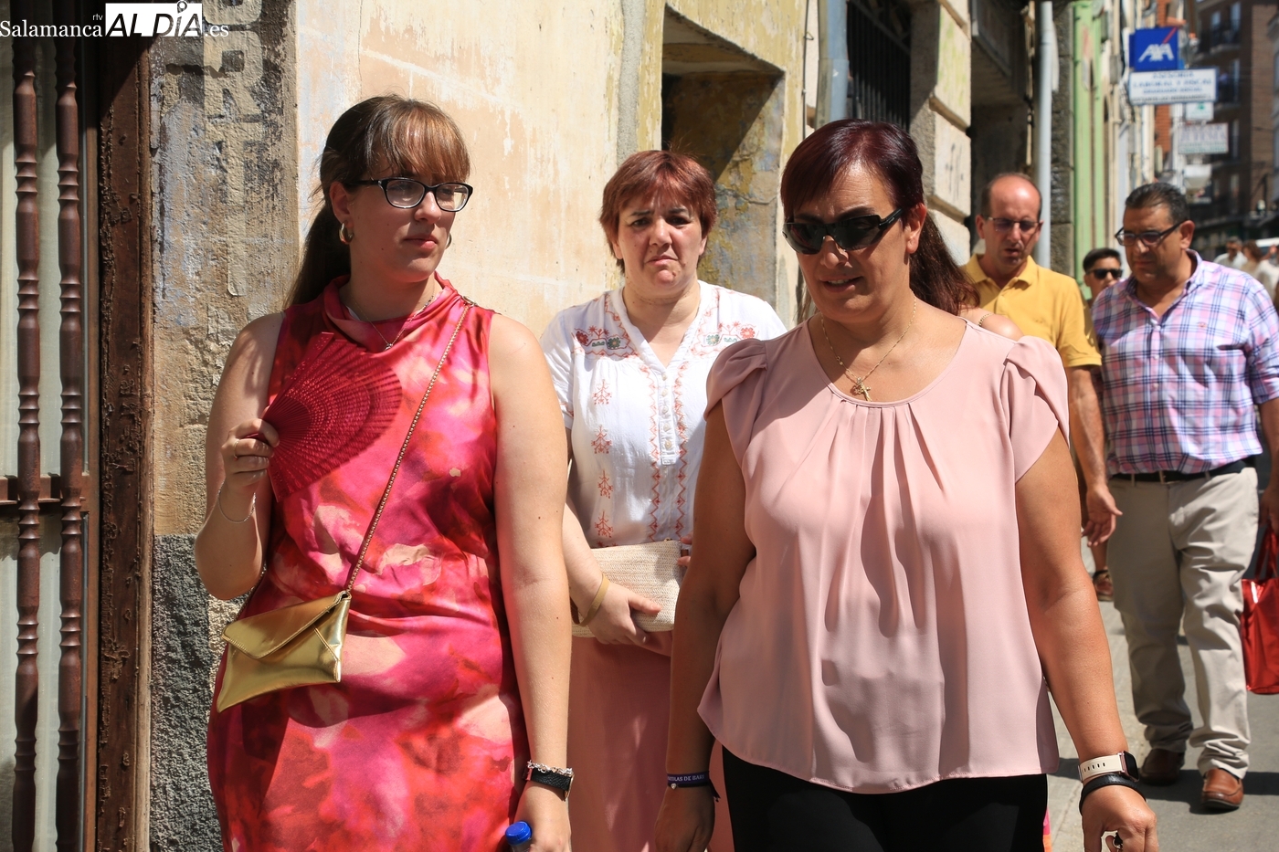 A continuación, el repique de campanas rompía el murmullo del público mientras la Corte de Honor lucía toda su belleza conformando dos filas delante de las mayordomas y mujeres tocadas con peinetas. La procesión comenzaba Santa Ana abajo dirección al Socorro, aunque antes tenía lugar la tradicional parada en la plaza del Convento para saludar a las monjas de Santo Toribio, Agustinas Recoletas que desde hace más de 400 años viven con intensidad este momento. Finalmente, el público respetó a las monjas del convento y pudo escucharse con claridad a las religiosas en su canción dedicada a la Virgen, un acto al que seguiría un nuevo baile de Organza bajo los vítores de: ¡Viva la Virgen del Socorro! 'Vivan los mayordomos!