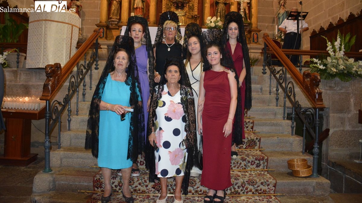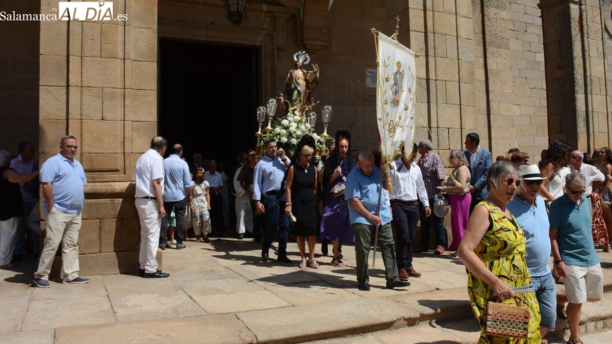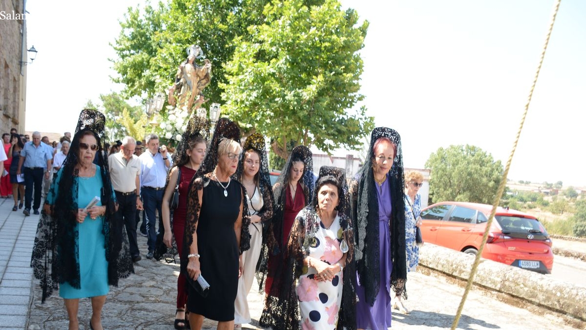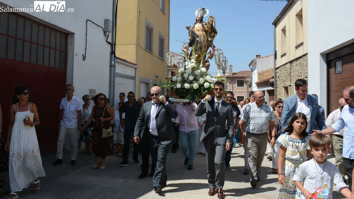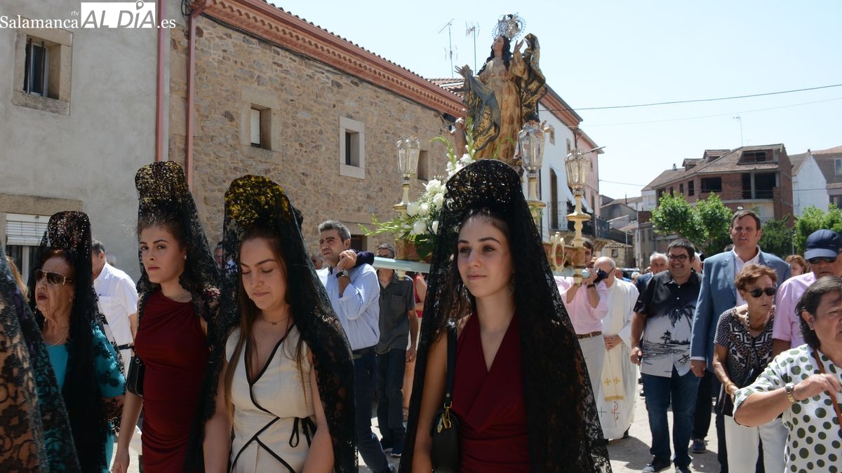 Lumbrales está viviendo hoy, día 15 de agosto, el día de su patrona, La Virgen de la Asunción, una celebración centrada en los actos religiosos. A las 12 del mediodía se iniciaba una misa solemne en la iglesia parroquial, presidida por Andrés García, párroco insolidum de Lumbrales. Finalizada la eucaristía, los cientos de asistentes a la celebración esperaron a la puerta de la iglesia la salida de la imagen de la Patrona, que abrió el desfile procesional por el recorrido marcado por las calles Torrejón, San Vicente de Paul, Las Cruces, La Travesía, la Plaza de la Alegría, la calle El viento y de nuevo San Vicente de Paul hasta el templo parroquial. Un grupo de mujeres (María, Merche, Margarita y María Rosa) y de chicas muy jóvenes (Paula, Andrea y Rut) luciendo peineta y mantilla, acompañaron a la Patrona.