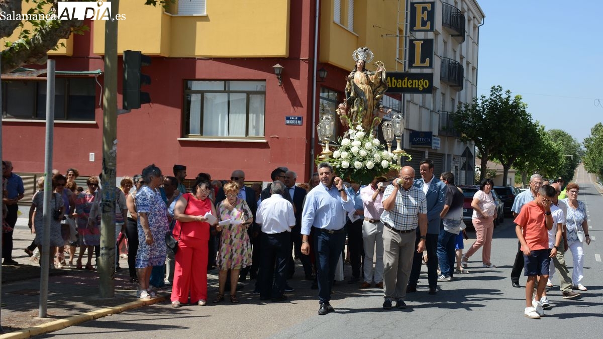 En el largo y lento recorrido bajo un intenso calor, la imagen de la Virgen de la Asunción fue cambiando de portadores, un grupo de voluntarios, entre ellos el alcalde, Carlos Pedraz y el teniente alcalde, Ignacio Pascua. Las canciones interpretadas por el coro parroquial acompañaron el desfile procesional.
