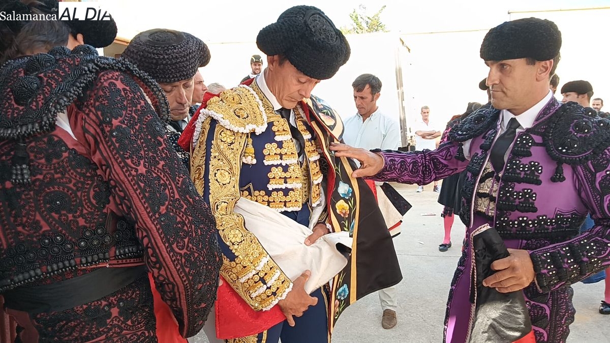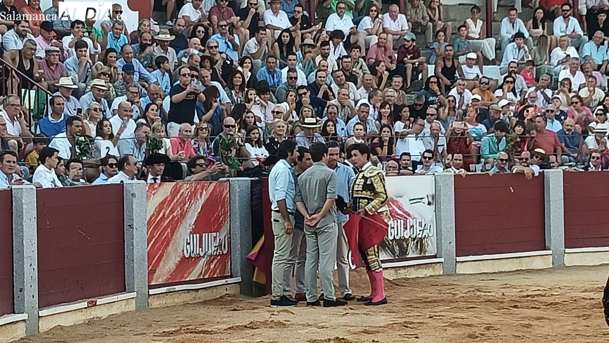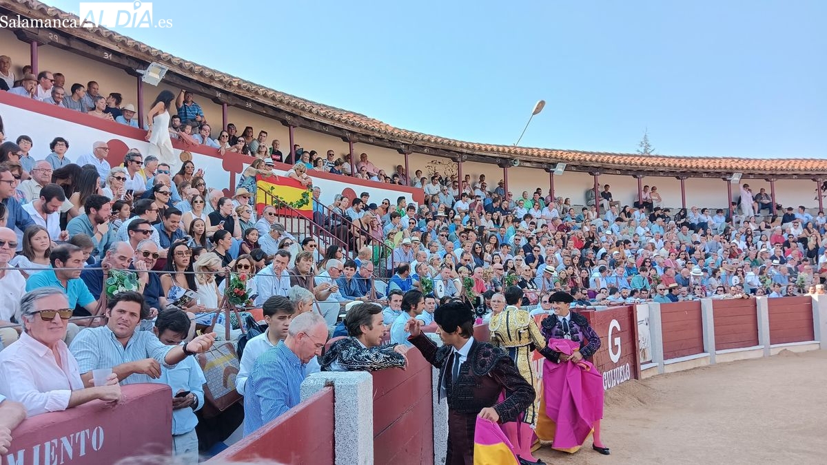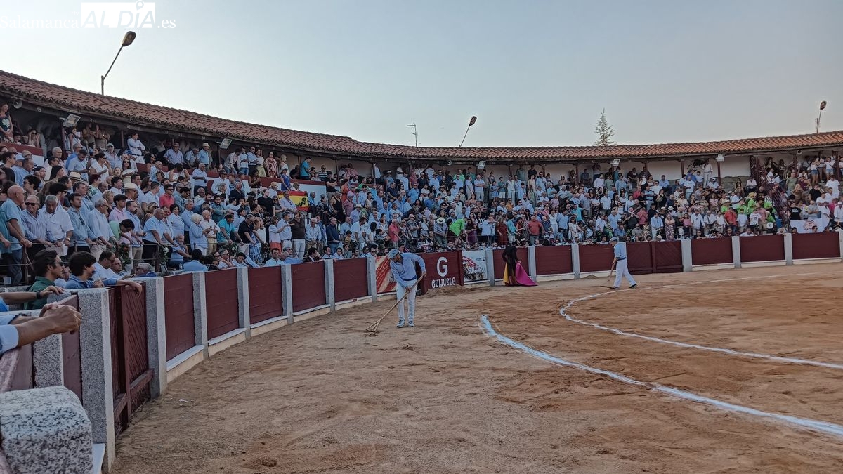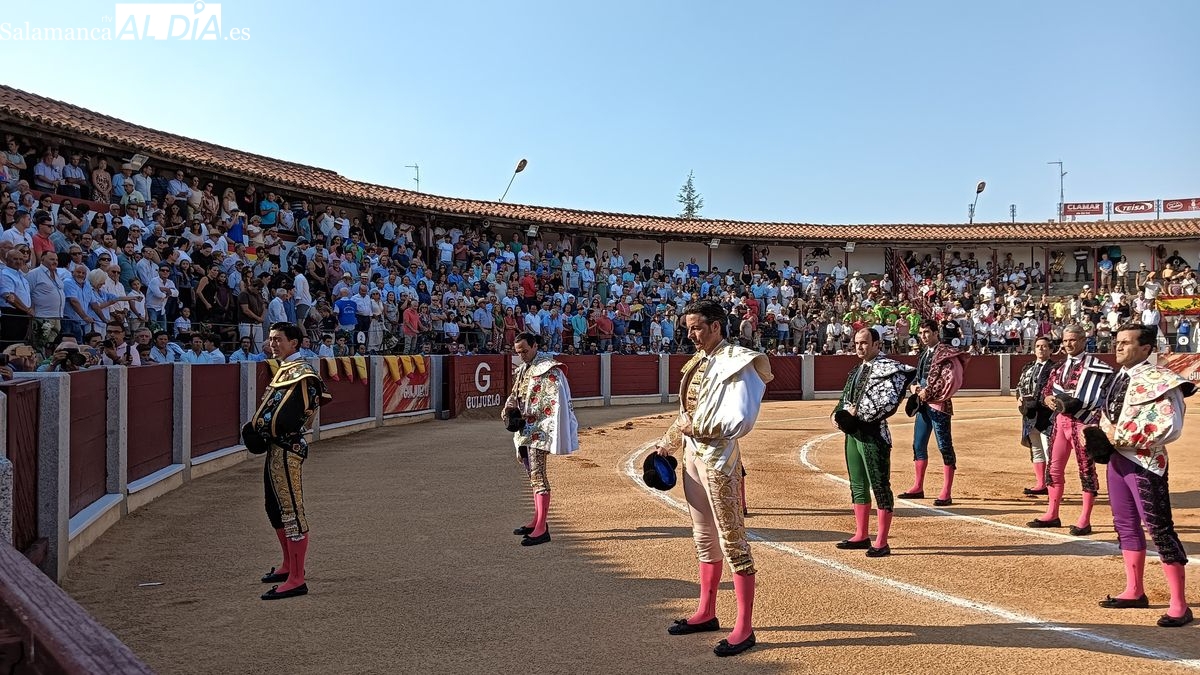 Incidencias: El banderillero Juan Luis Moreno fue atendido en el quirófano móvil por una cornada por asta de toro en la lidia del quinto de la tarde. Tiene una herida en el tercio superior del muslo derecho, con una profundidad de 10 centímetros y dos trayectorias, una ascendente de 15 centímetros y otra descendente de 10 centímetros. Se procede a limpiar y curar la herida y es trasladado al Hospital de Salamanca para ser operado. Pronóstico reservado.