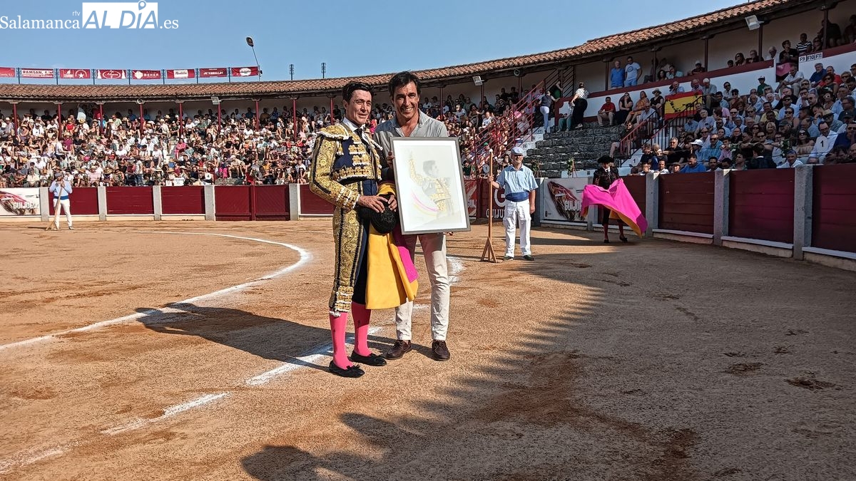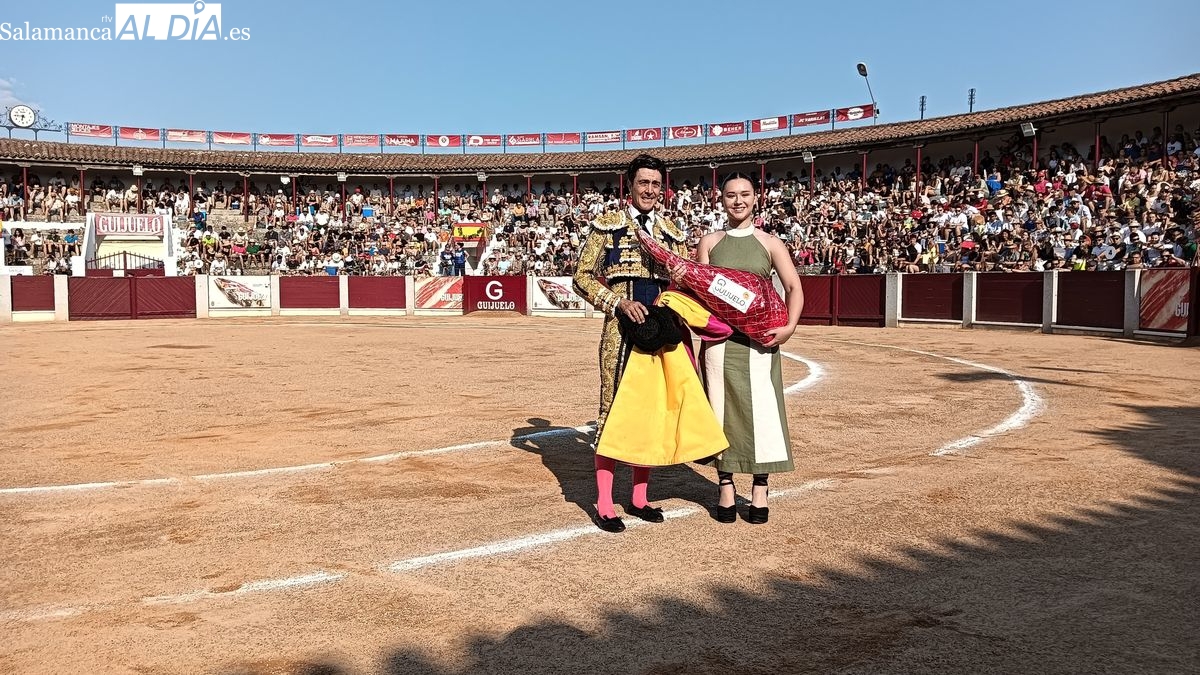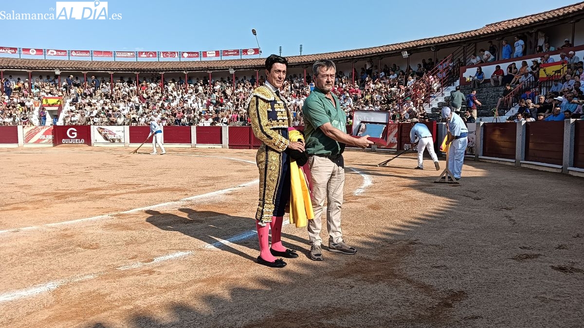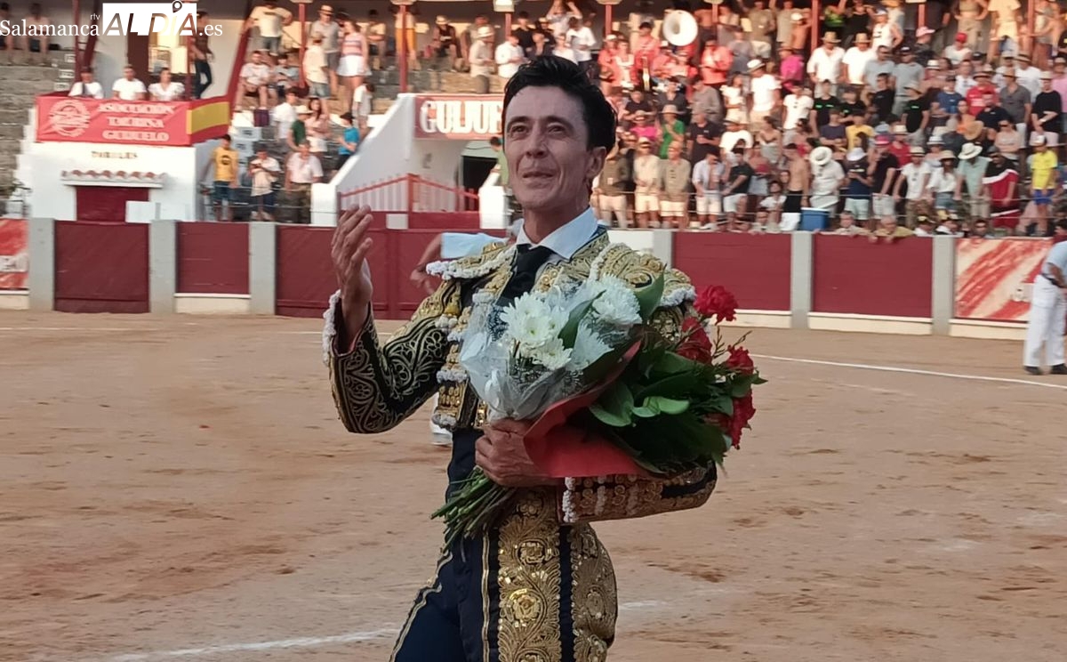 Brindó El Capea al alcalde de Guijuelo, Roberto Martín, y al empresario José Ignacio Cascón, visiblemente emocionado. Poderoso comienzo del salmantino toreando por bajo y sometiendo al de Domingo Hernández, algo que pedía a gritos desde que saltó al albero. Hubo mando y firmeza en la muleta de El Capea en series con la mano derecha con ritmo y emoción. Por el lado izquierdo también le cogió el aire el espada charro para dejar naturales de buen trazo en una labor meritoria. Tuvo movilidad, fijeza, duración y codicia el de Domingo Hernández. Mató de estocada al segundo encuentro y cortó la primera oreja de la tarde.