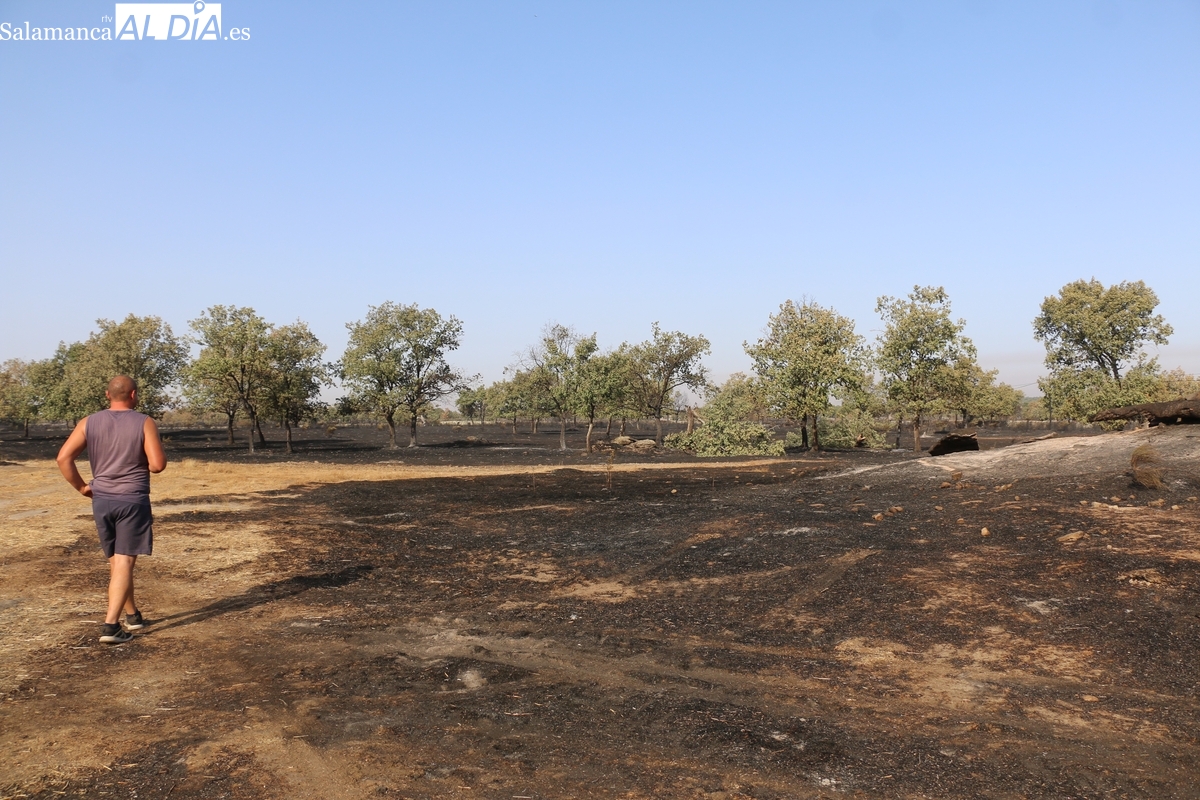 Desde Cipérez hasta Villar de Peralonzo, el terreno está completamente calcinado. Algunos ganaderos de la zona, de los más perjudicados, hacen un primer balance de pérdidas que asciende a 60.000 euros solo en pacas de paja y forraje calcinadas. Afortunadamente, no se concoen muchos casos de ganado muerto consecuencia del fuego, pero su testimonio está cargado de críticas por lo que consideran una "falta de medios" para combatir el avance del fuego.