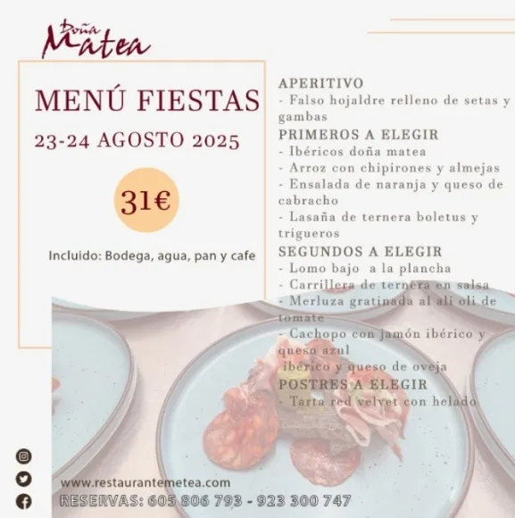 El Restaurante Doña Matea de Alba de Tormes ha preparado un menú especial con motivo de las fiestas patronales. La propuesta estará disponible los días 23 y 24 de agosto a un precio cerrado de 31 euros por persona. El menú incluye un aperitivo de bienvenida, cuatro opciones de primeros y segundos platos a elegir, postre y bodega completa, ofreciendo una experiencia gastronómica completa para celebrar las festividades locales.