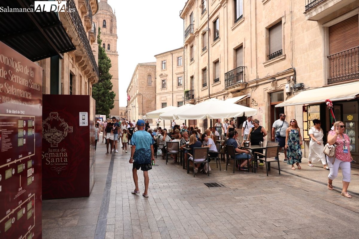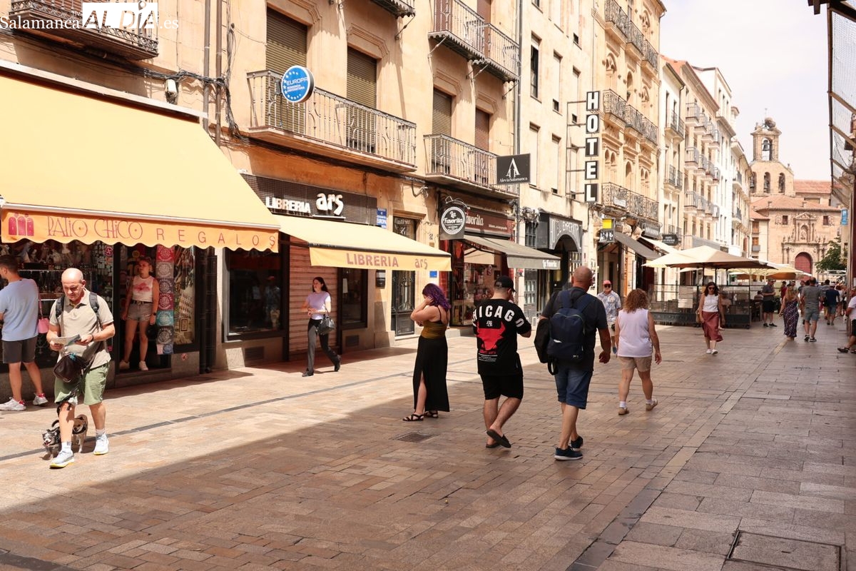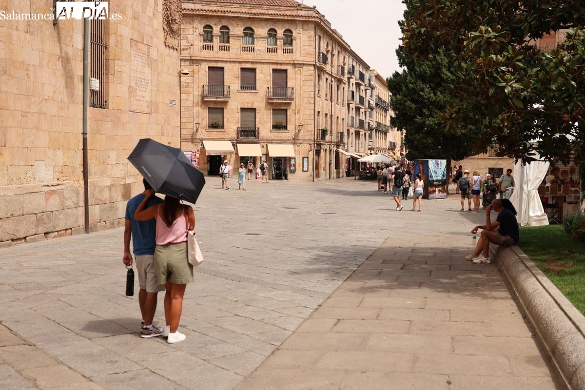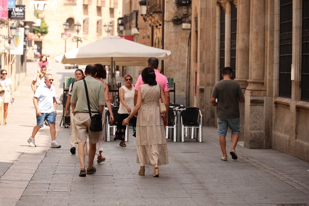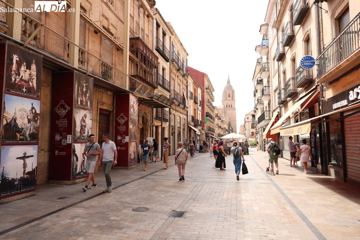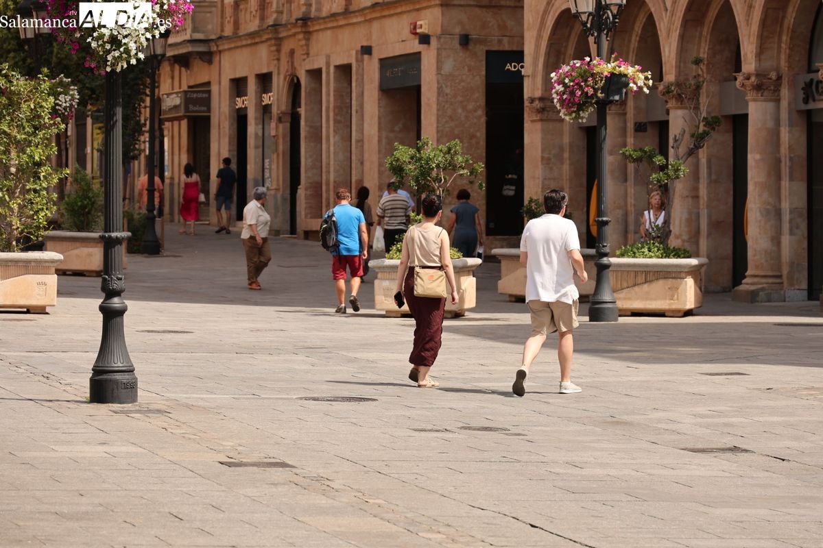 El ambiente en las calles más céntricas de la capital charra es notablemente más tranquilo de lo habitual este domingo, una estampa marcada por el calor sofocante y una afluencia de gente visiblemente reducida.