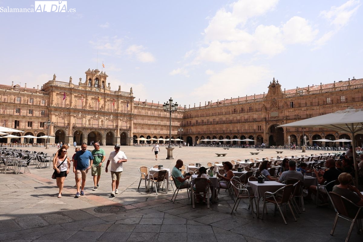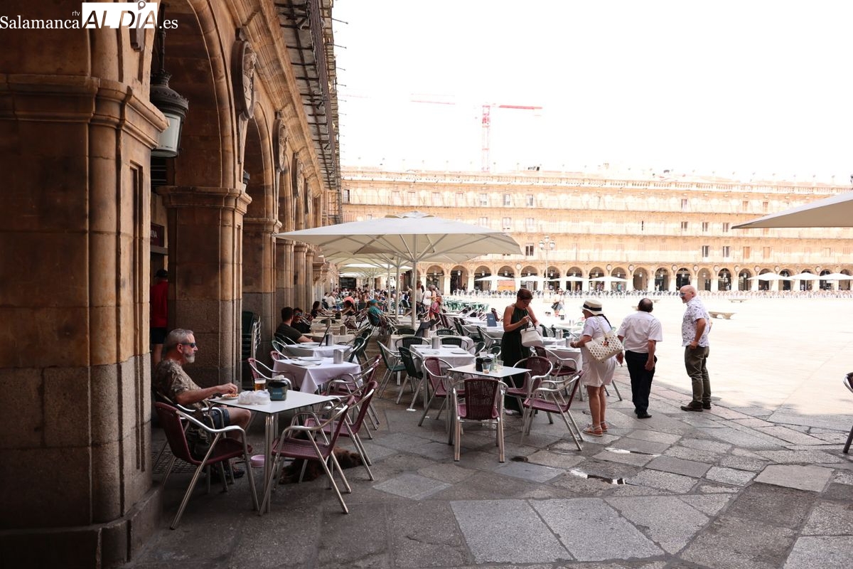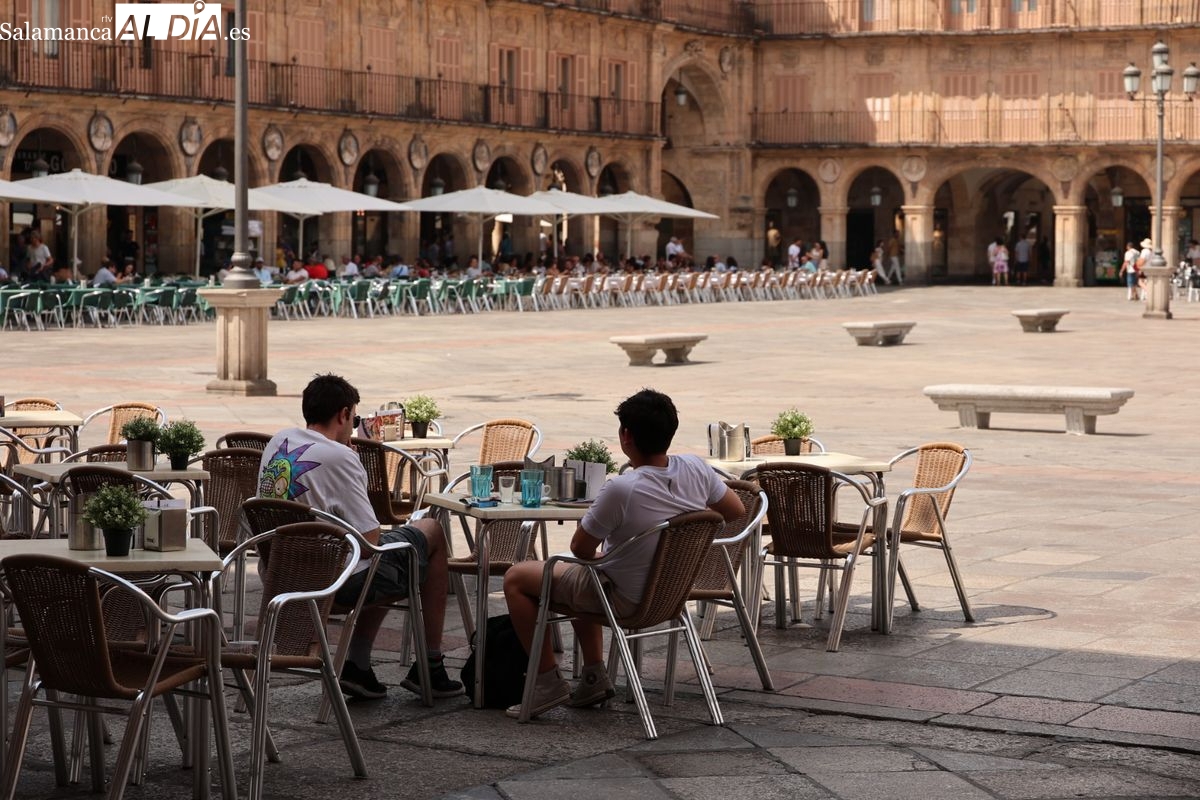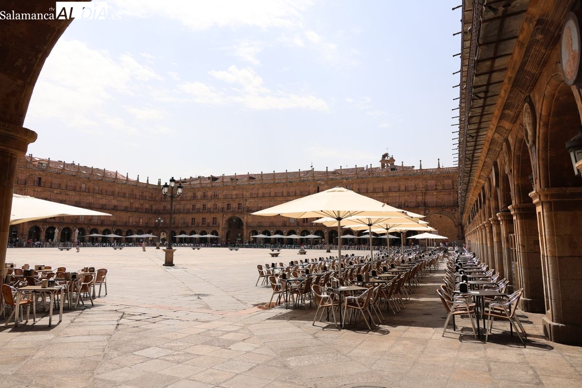 Las terrazas de la Plaza Mayor y las calles aledañas, aunque no están vacías, sí presentaban este mediodía una ocupación que se podría calificar de 'medio gas'. Y los viandantes que paseaban por el centro histórico buscaban la sombra ante las altas temperaturas.