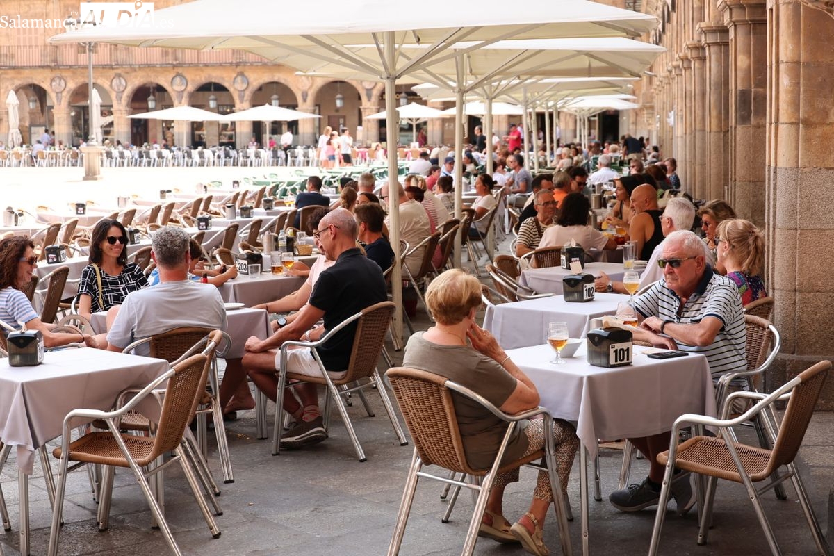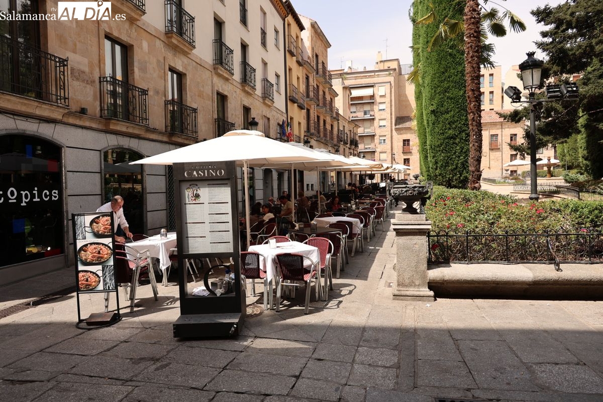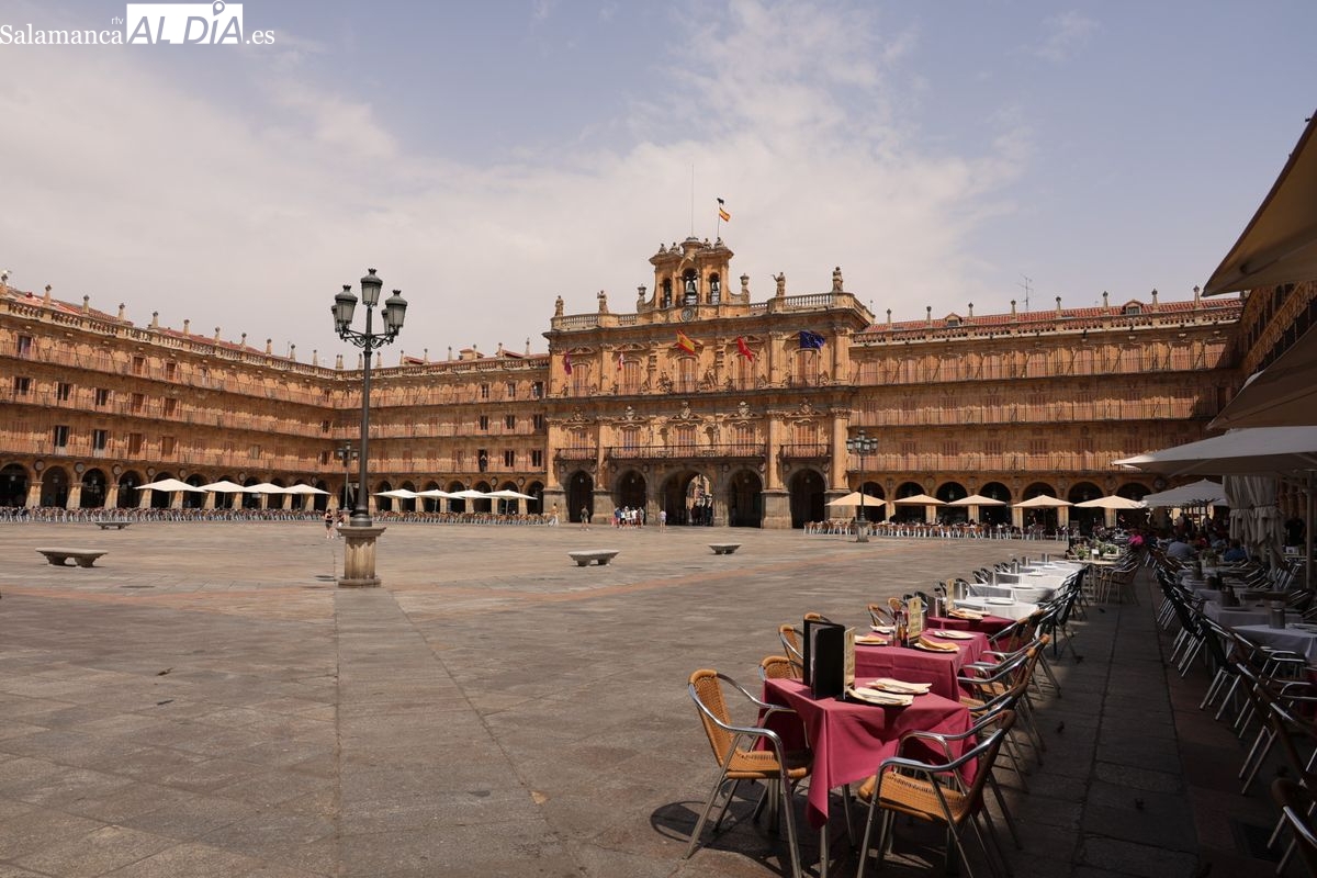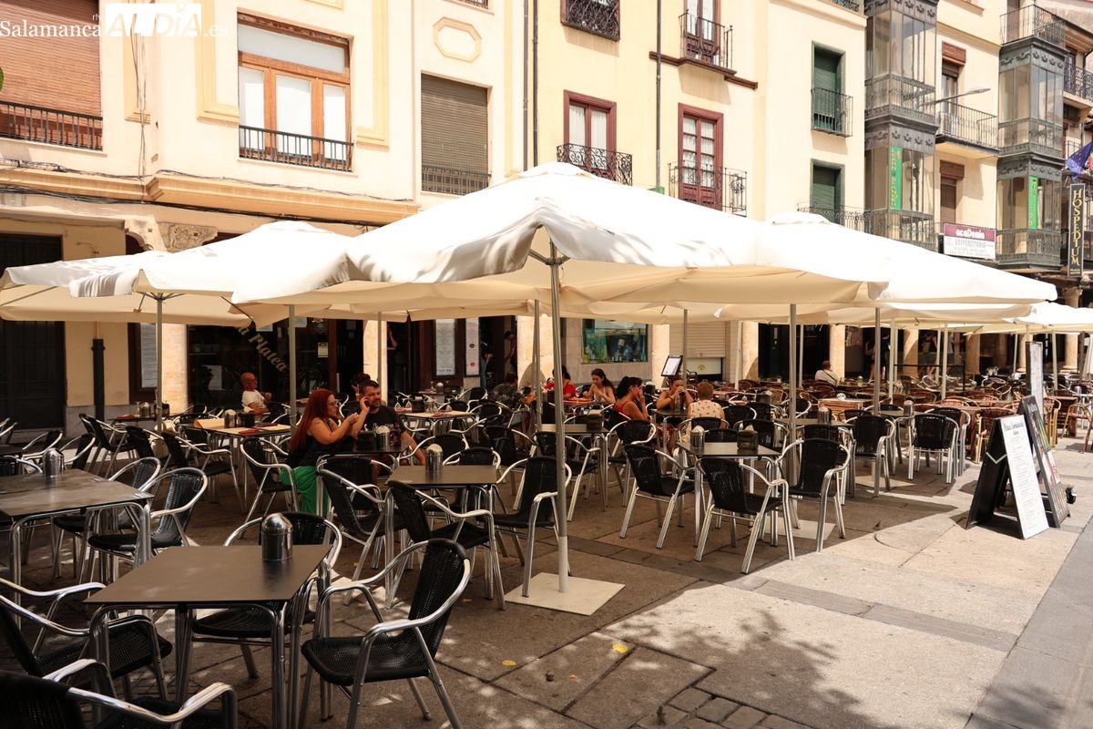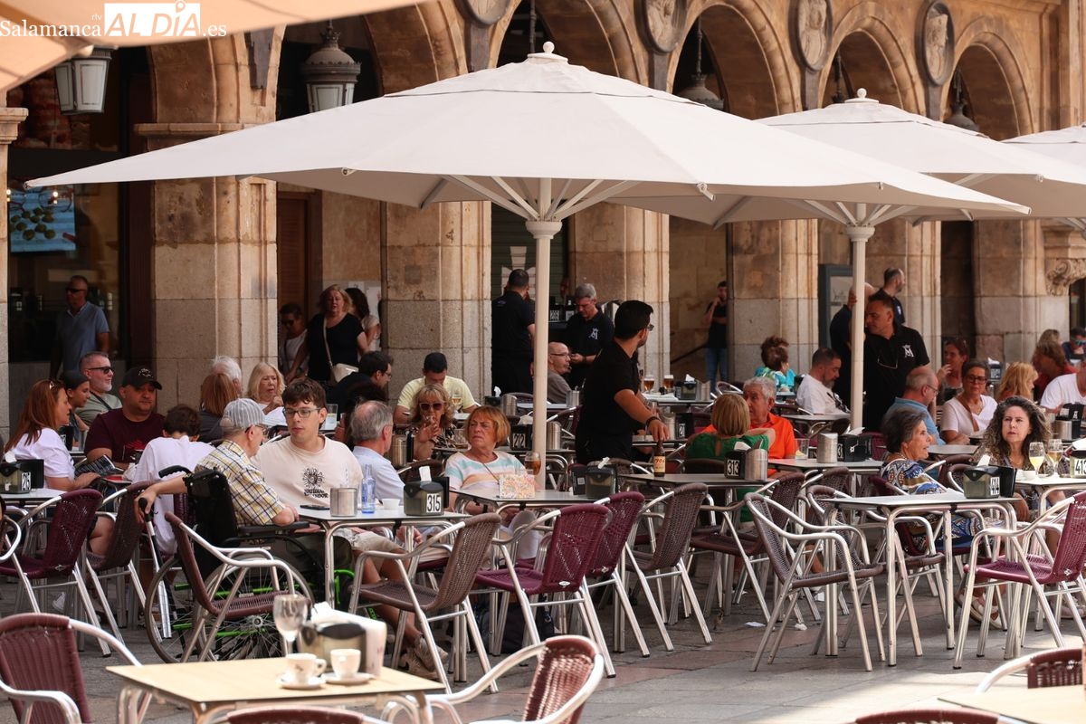 Las terrazas de la Plaza Mayor y las calles aledañas, aunque no están vacías, sí presentaban este mediodía una ocupación que se podría calificar de 'medio gas'. Y los viandantes que paseaban por el centro histórico buscaban la sombra ante las altas temperaturas.