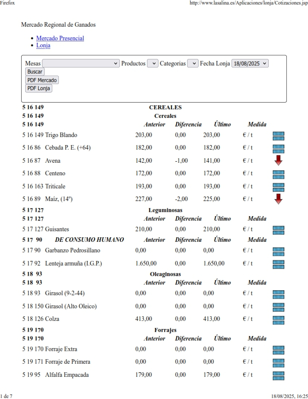 En la Mesa de Cereal se acordó una nueva bajada de la avena, en este caso de -1,00 €/t, lo que la deja a 141 €/t. También, y después de la subida de la semana pasada, el maíz cae -2,00 €/t, quedando su precio a 225 €/t. El forraje repite precios.