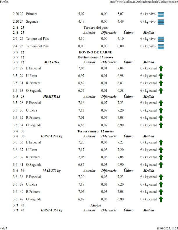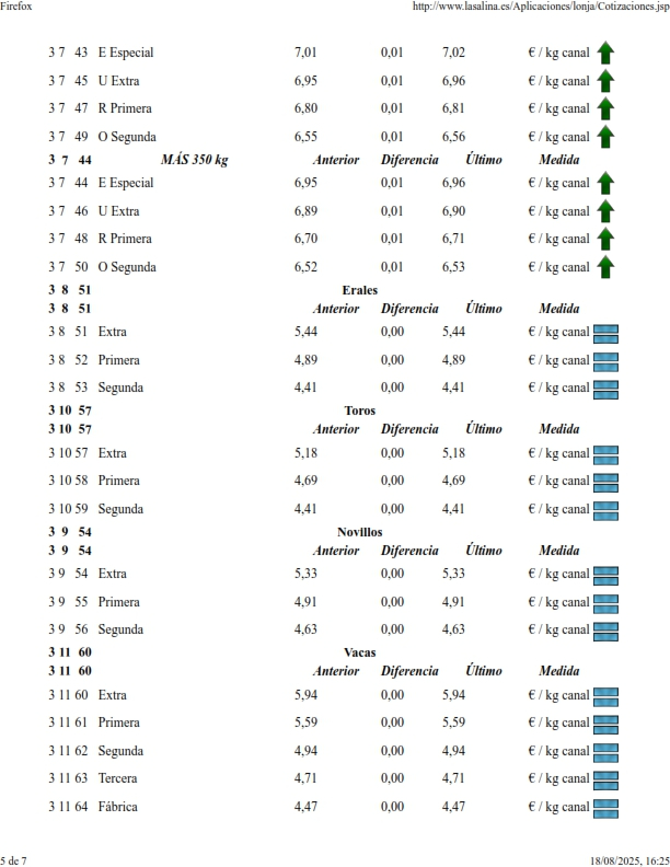 Debido a un problema en la web de la Diputación se desconocen los datos del mercado de ganado. En el caso de las reses para cebo se mantienen los precios de la semana pasada, no así para los animales de sacrificio. Los machos de menos de 12 meses suben 0,01 €/kg, mientras que las terneras lo hacen 0,07 €/kg., y para las de más de 12 meses la subida es de 0,03 kg. También suben los años, en este caso 0,01 €/kg.