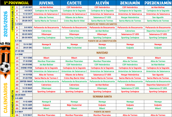 Los cinco equipos del Ciudad Rodrigo Club de Fútbol que militarán en 1ª Provincial en sus respectivas categorías durante la temporada 2025/2026 ya tienen calendarios. Estos equipos son el Juvenil, el Cadete, el Alevín A, el Benjamín A y el Prebenjamín (novedad respecto al año anterior), que tendrán ‘vidas paralelas’, jugando siempre a la vez en casa o fuera, y en numerosas ocasiones contra el mismo Club.