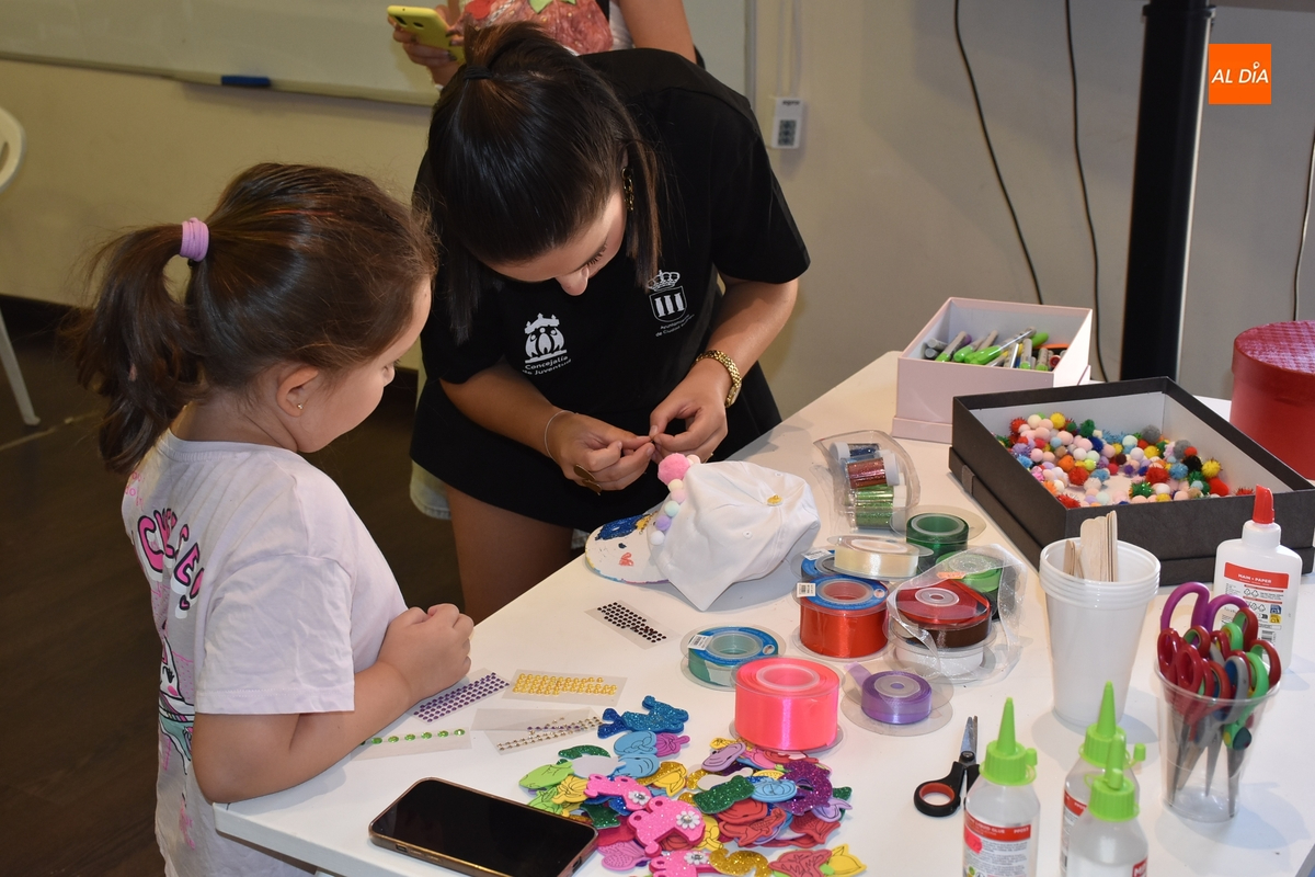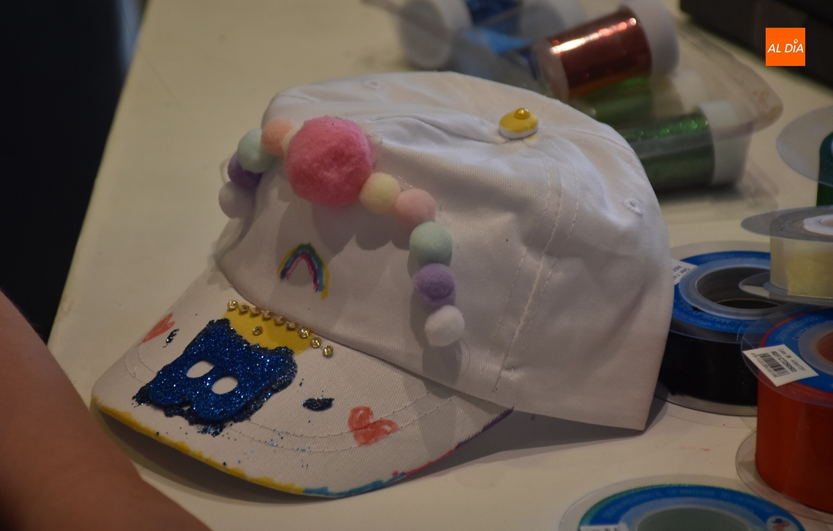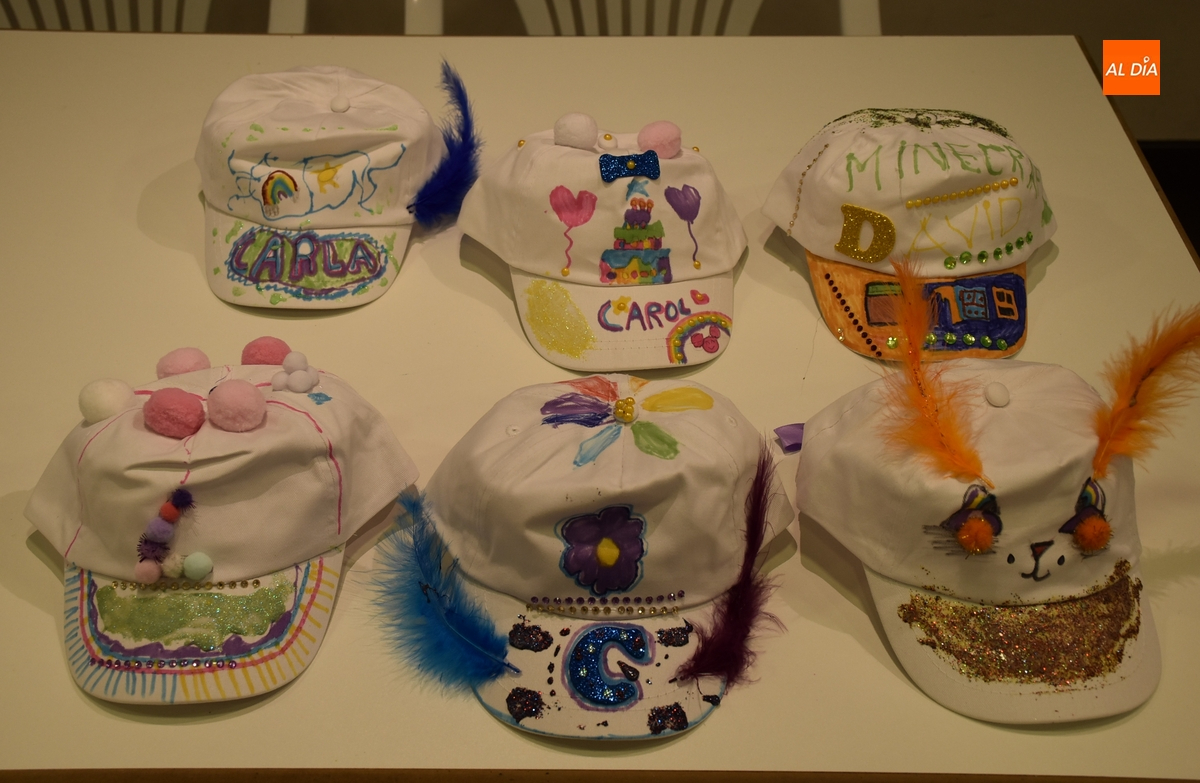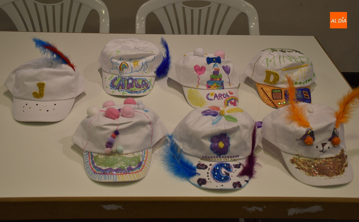 Cada uno de los participantes recibió al inicio una gorra blanca, teniendo la oportunidad a partir de entonces de decorarla de la forma que cada uno quiso con los materiales que había disponibles (escribiendo, pintando, con purpurina, etc.). El taller fue dirigido por la animadora sociocultural del Ayuntamiento, Clara Bernal.