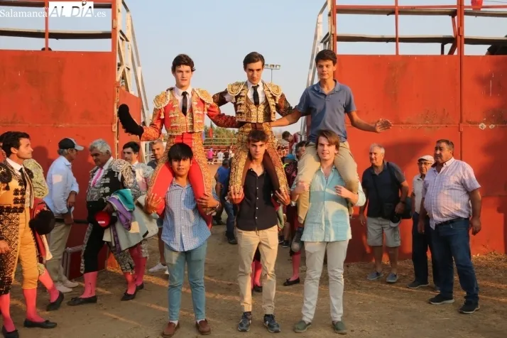 Ambos novilleros de la Escuela de Tauromaquia de Salamanca cortaron cuatro orejas y dos rabos a cuatro excelentes novillos, dos de vuelta al ruedo y dos aplaudidos en el arrastre, por lo que el ganadero también salía a hombros